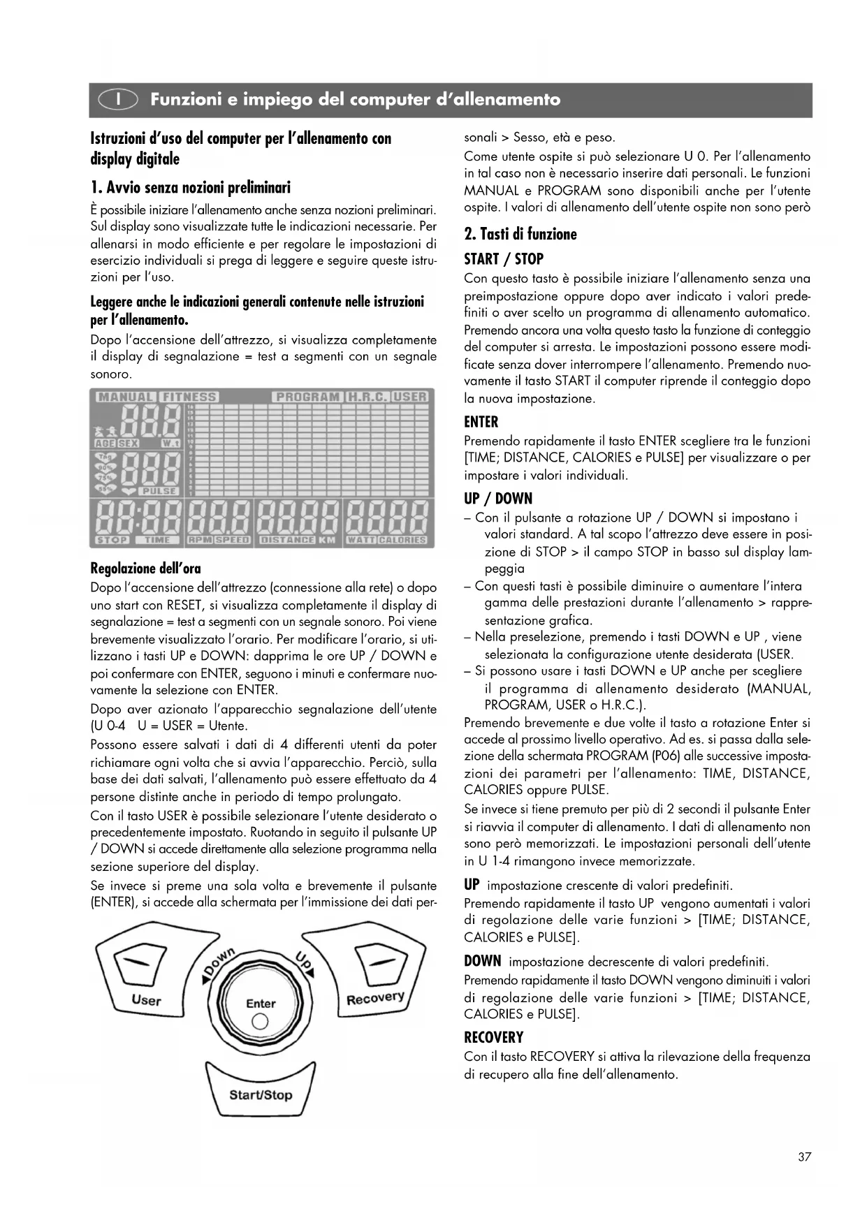 È possibile iniziare l’allenamento anche senza nozioni preliminari. Sul display sono visualizzate tutte le indicazioni necessarie. Per allenarsi in modo efficiente e per regolare le impostazioni di esercizio individuali si prega di leggere e seguire queste istru- zioni per l’uso. Leggere anche le indicazioni generali contenute nelle istruzioni per l’allenamento. Dopo l’accensione dell’attrezzo, si visualizza completamente il display di segnalazione = test a segmenti con un segnale sonoro. Regolazione dell’ora Dopo l’accensione dell’attrezzo (connessione alla rete) o dopo uno start con RESET, si visualizza completamente il display di segnalazione = test a segmenti con un segnale sonoro. Poi viene brevemente visualizzato l’orario. Per modificare l’orario, si uti- lizzano i tasti UP e DOWN: dapprima le ore UP / DOWN e poi confermare con ENTER, seguono i minuti e confermare nuo- vamente la selezione con ENTER. Dopo aver azionato l’apparecchio segnalazione dell’utente (U 0-4 U = USER = Utente. Possono essere salvati i dati di 4 differenti utenti da poter richiamare ogni volta che si avvia l’apparecchio. Perciò, sulla base dei dati salvati, l’allenamento può essere effettuato da 4 persone distinte anche in periodo di tempo prolungato. Con il tasto USER è possibile selezionare l’utente desiderato o precedentemente impostato. Ruotando in seguito il pulsante UP / DOWN si accede direttamente alla selezione programma nella sezione superiore del display. Se invece si preme una sola volta e brevemente il pulsante (ENTER), si accede alla schermata per l’immissione dei dati per- sonali > Sesso, età e peso. Come utente ospite si può selezionare U 0. Per l’allenamento in tal caso non è necessario inserire dati personali. Le funzioni MANUAL e PROGRAM sono disponibili anche per l’utente ospite. I valori di allenamento dell’utente ospite non sono però