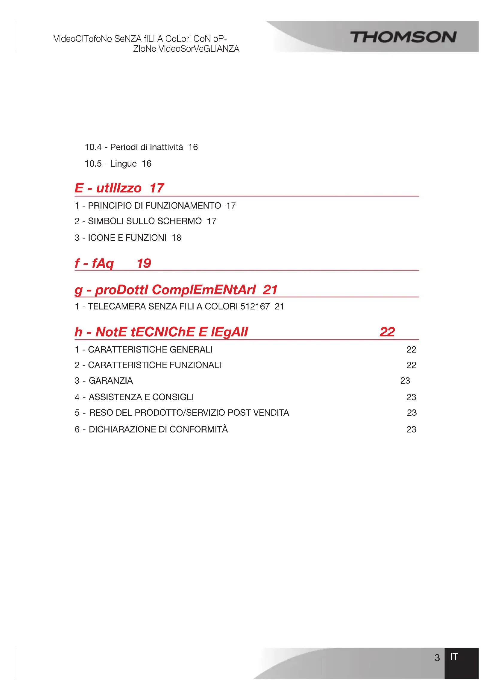 Scarica le istruzioni per il tuo Telecamera di sorveglianza in formato PDF gratuitamente! Trova il tuo manuale 512166 - THOMSON e riprendi in mano il tuo dispositivo elettronico. In questa pagina sono pubblicati tutti i documenti necessari per l'utilizzo del tuo dispositivo. 512166 del marchio THOMSON.