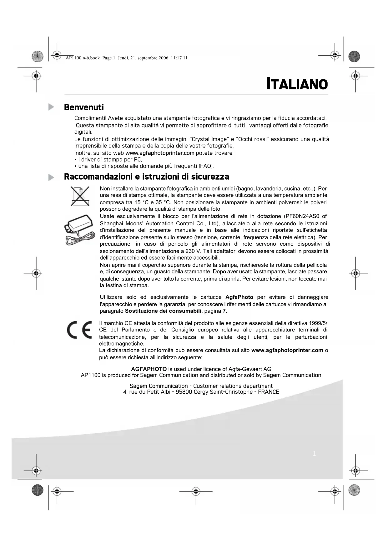 - una lista di risposte alle domande più frequenti (FAQ). Raccomandazioni e istruzioni di sicurezza Non installare la stampante fotografica in ambienti umidi (bagno, lavanderia, cucina, etc..). Per una resa di stampa ottimale, la stampante deve essere utilizzata a una temperatura ambiente compresa tra 15 °C e 35 °C. Non posizionare la stampante in ambienti polverosi: le polveri possono degradare la qualità di stampa delle foto. Usate esclusivamente il blocco per l'alimentazione di rete in dotazione (PF60N24AS0 of Shanghai Moons' Automation Control Co., Ltd), allacciatelo alla rete secondo le istruzioni d'installazione del presente manuale e in base alle indicazioni riportate sull'etichetta d'identificazione presente sullo stesso (tensione, corrente, frequenza della rete elettrica). Per precauzione, in caso di pericolo gli alimentatori di rete servono come dispositivi di sezionamento dell'alimentazione a 230 V. Tali adattatori devono essere collocati in prossimità dell'apparecchio ed essere facilmente accessibili. Non aprire mai il coperchio superiore durante la stampa, rischiereste la rottura della pellicola e, di conseguenza, un guasto della stampante. Dopo aver usato la stampante, lasciate passare qualche istante dopo aver tolto la corrente, prima di aprirla. Per evitare lesioni, non toccate mai la testina di stampa. Utilizzare solo ed esclusivamente le cartucce AgfaPhoto per evitare di danneggiare l'apparecchio e perdere la garanzia, per conoscere i riferimenti delle cartucce vi rimandiamo al paragrafo Sostituzione dei consumabili, pagina 7. Il marchio CE attesta la conformità del prodotto alle esigenze essenziali della direttiva 1999/5/ CE del Parlamento e del Consiglio europeo relativa alle apparecchiature terminali di telecomunicazione, per la sicurezza e la salute degli utenti, per le perturbazioni elettromagnetiche. La dichiarazione di conformità può essere consultata sul sito www.agfaphotoprinter.com o può essere richiesta all'indirizzo seguente: AGFAPHOTO is used under licence of Agfa-Gevaert AG AP1100 is produced for Sagem Communication and distributed or sold by Sagem Communication Sagem Communication - Customer relations department 4, rue du Petit Albi - 95800 Cergy Saint-Christophe - FRANCE AP1100 n-b.book Page 1 Jeudi, 21. septembre 2006 11:17 112 Ambiente La salvaguardia dell'ambiente nella logica dello sviluppo sostenibile è una preoccupazione essenziale della AgfaPhoto. La volontà del Gruppo AgfaPhoto è di sfruttare delle installazioni che rispettano l'ambiente equindi abbiano scelto d'integrare la salvaguardia ambientale nell'insieme del ciclo di vita dei prodotti, dalla fase di fabbricazione alla messa in servizio, l'uso e l'eliminazione. IMBALLAGGIO La presenza del logo (punto verde) testimonia del versamento a un organismo nazionale certificato di un contributo per il miglioramento delle infrastrutture di recupero e di riciclo degli imballaggi. Allo scopo di facilitare le operazioni di riciclaggio, rispettare le regole di raccolta differenziata in vigore localmente per questo tipo di rifiuti.