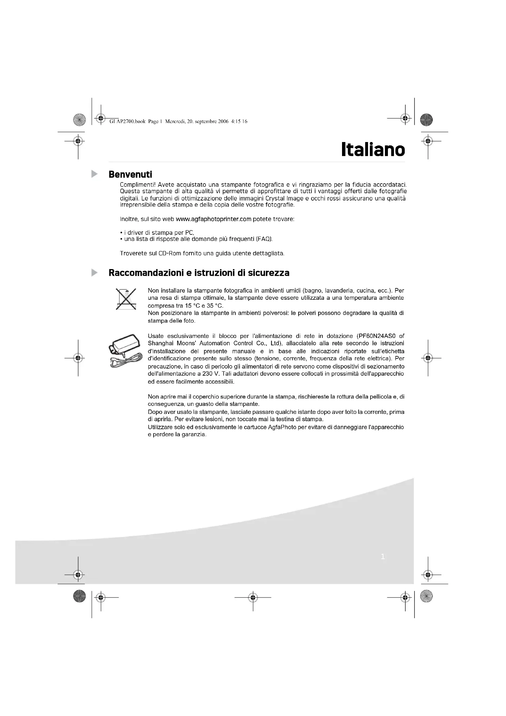 Compliment! Avete acquistato una stampante fotografica e vi ringraziamo per la fiducia accordataci. Questa stampante di alta qualità vi permette di approffitrare di tutti ivantaggi offerti delle fotografie digitali. Le funzioni di ottimizuazione delle immagini Crystal Image e occhi rossi assicurano una qualità irrepressibile della stampa e della copia delle vostre fotografie.