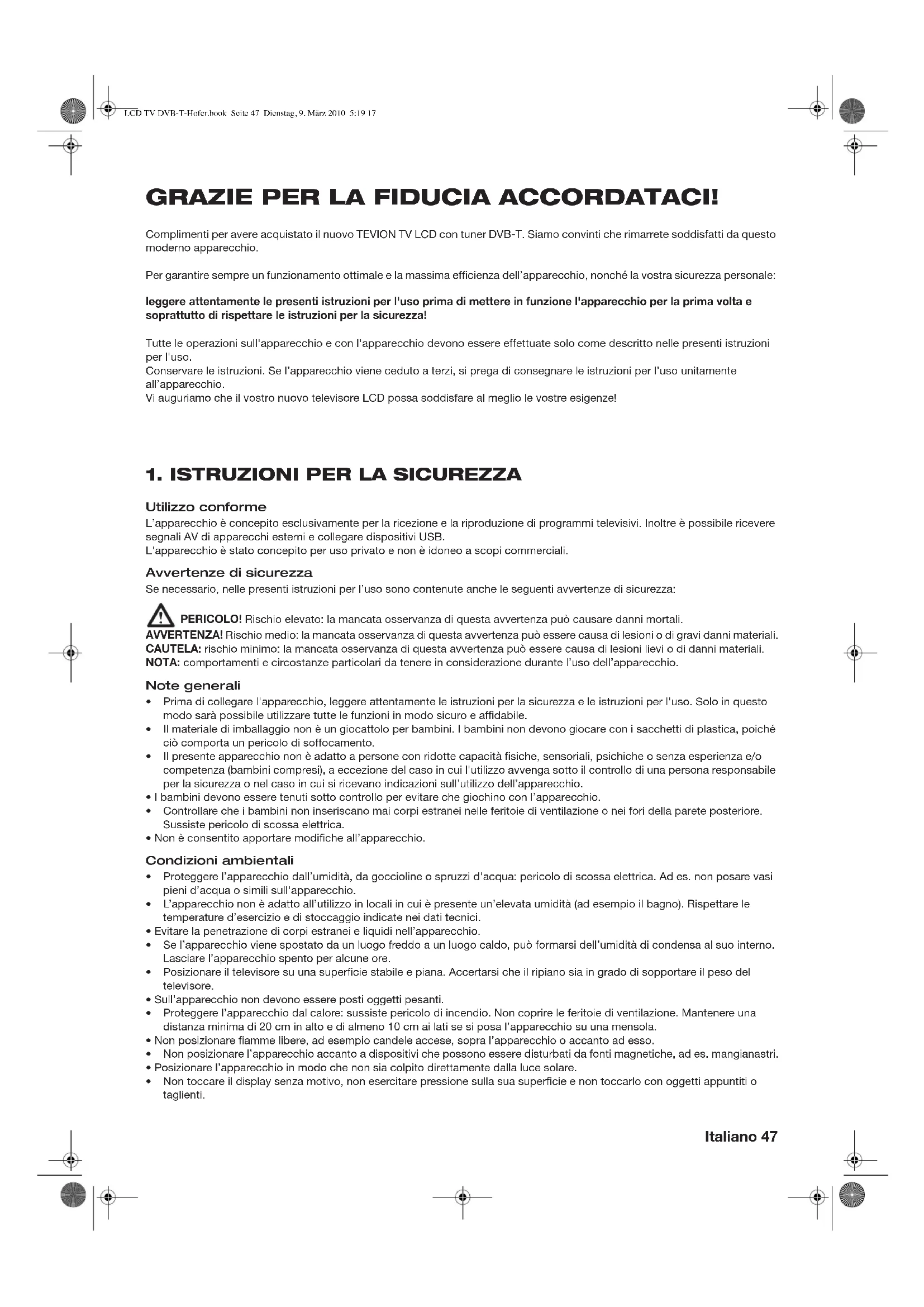 16. Risoluzione dei problemi ............................................................................................ 65 17. Caratteristiche tecniche ............................................................................................ 66 LCD TV DVB-T-Hofer.book Seite 46 Dienstag, 9. März 2010 5:19 17Italiano 47 GRAZIE PER LA FIDUCIA ACCORDATACI! Complimenti per avere acquistato il nuovo TEVION TV LCD con tuner DVB-T. Siamo convinti che rimarrete soddisfatti da questo moderno apparecchio. Per garantire sempre un funzionamento ottimale e la massima efficienza dell’apparecchio, nonché la vostra sicurezza personale: leggere attentamente le presenti istruzioni per l'uso prima di mettere in funzione l'apparecchio per la prima volta e soprattutto di rispettare le istruzioni per la sicurezza! Tutte le operazioni sull'apparecchio e con l'apparecchio devono essere effettuate solo come descritto nelle presenti istruzioni per l'uso. Conservare le istruzioni. Se l’apparecchio viene ceduto a terzi, si prega di consegnare le istruzioni per l’uso unitamente all’apparecchio. Vi auguriamo che il vostro nuovo televisore LCD possa soddisfare al meglio le vostre esigenze!