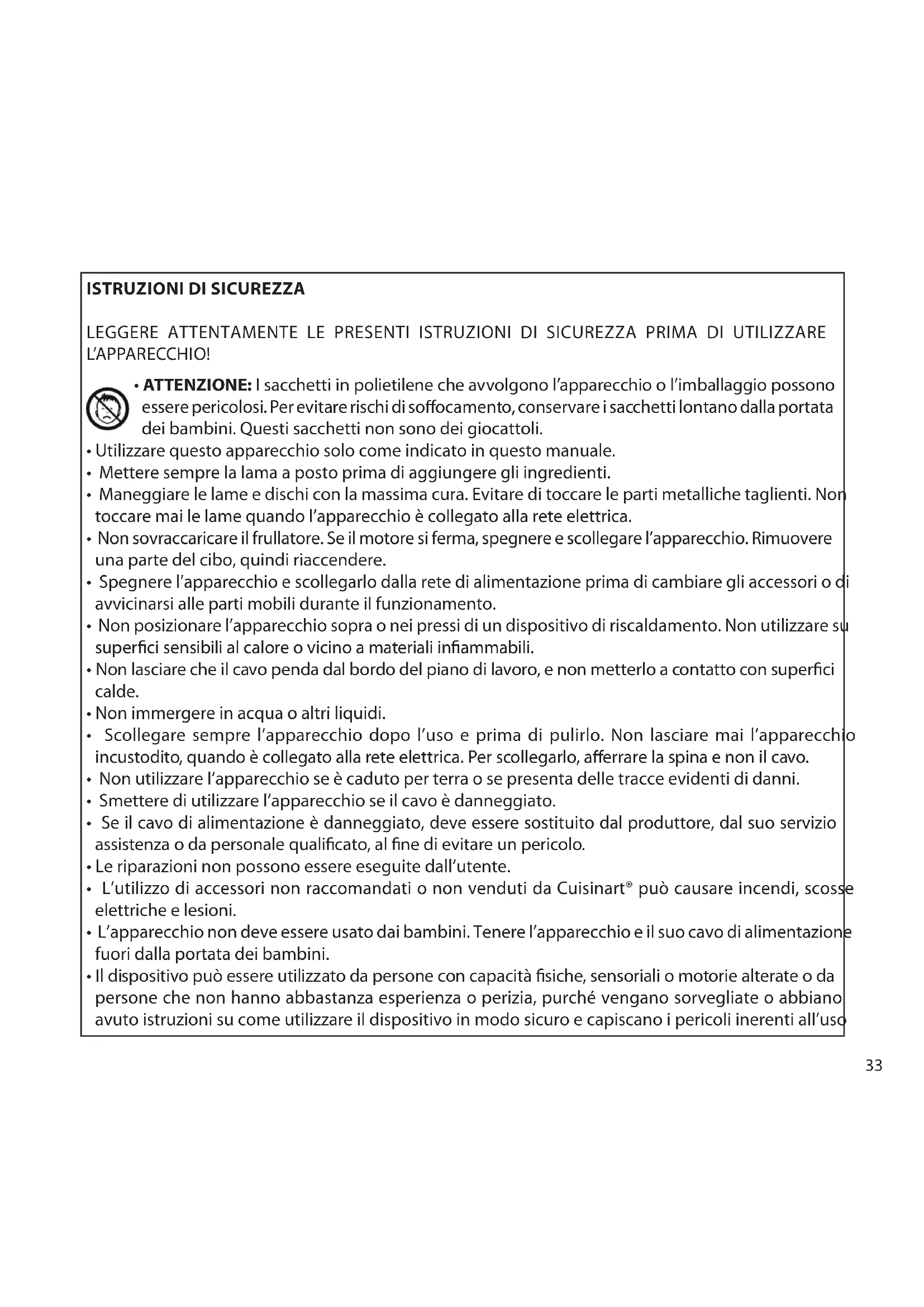 - L’utilizzo di accessori non raccomandati o non venduti da Cuisinart® può causare incendi, scosse elettriche e lesioni.