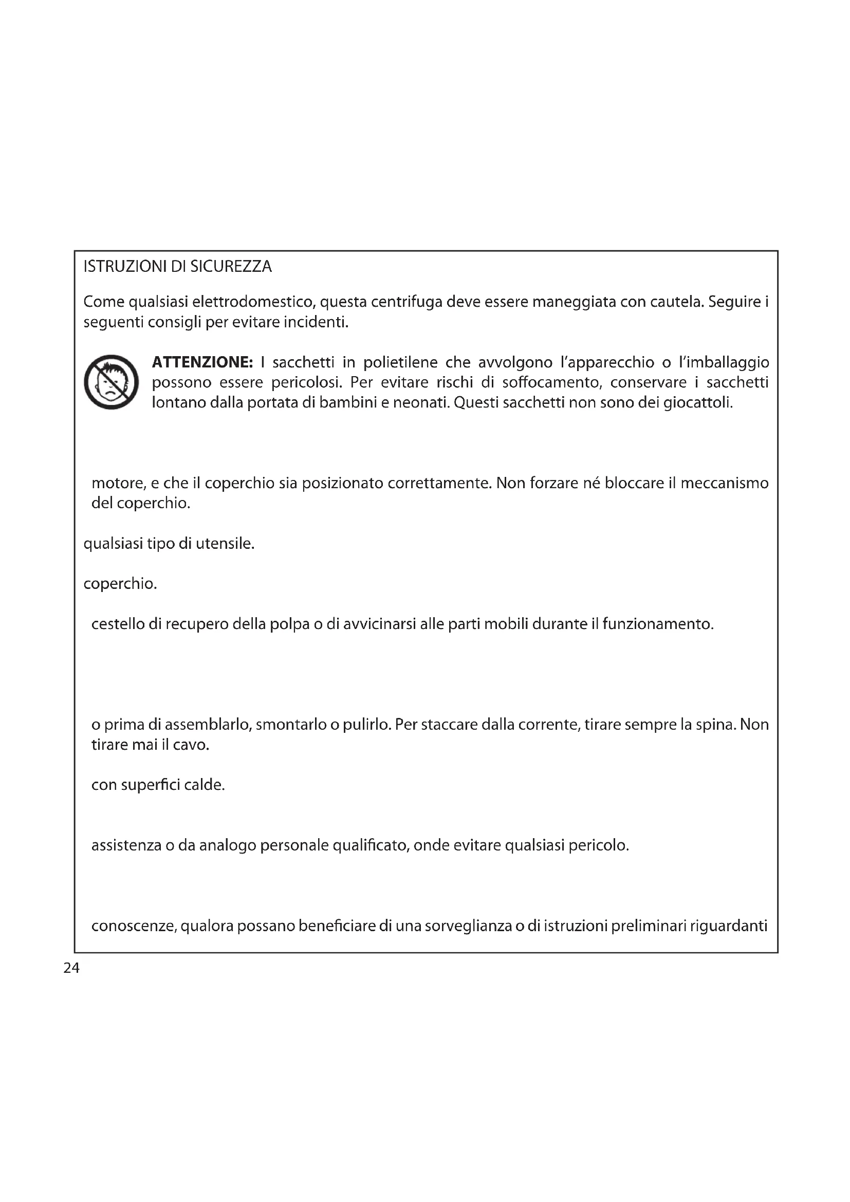 Come qualsiasi elettrodomestico, questa centrifuga deve essere maneggiata con cautela. Seguire i seguenti consigli per evitare incidenti. ATTENZIONE: I sacchetti in polietilene che avvolgono l’apparecchio o l’imballaggio possono essere pericolosi. Per evitare rischi di soocamento, conservare i sacchetti lontano dalla portata di bambini e neonati. Questi sacchetti non sono dei giocattoli.