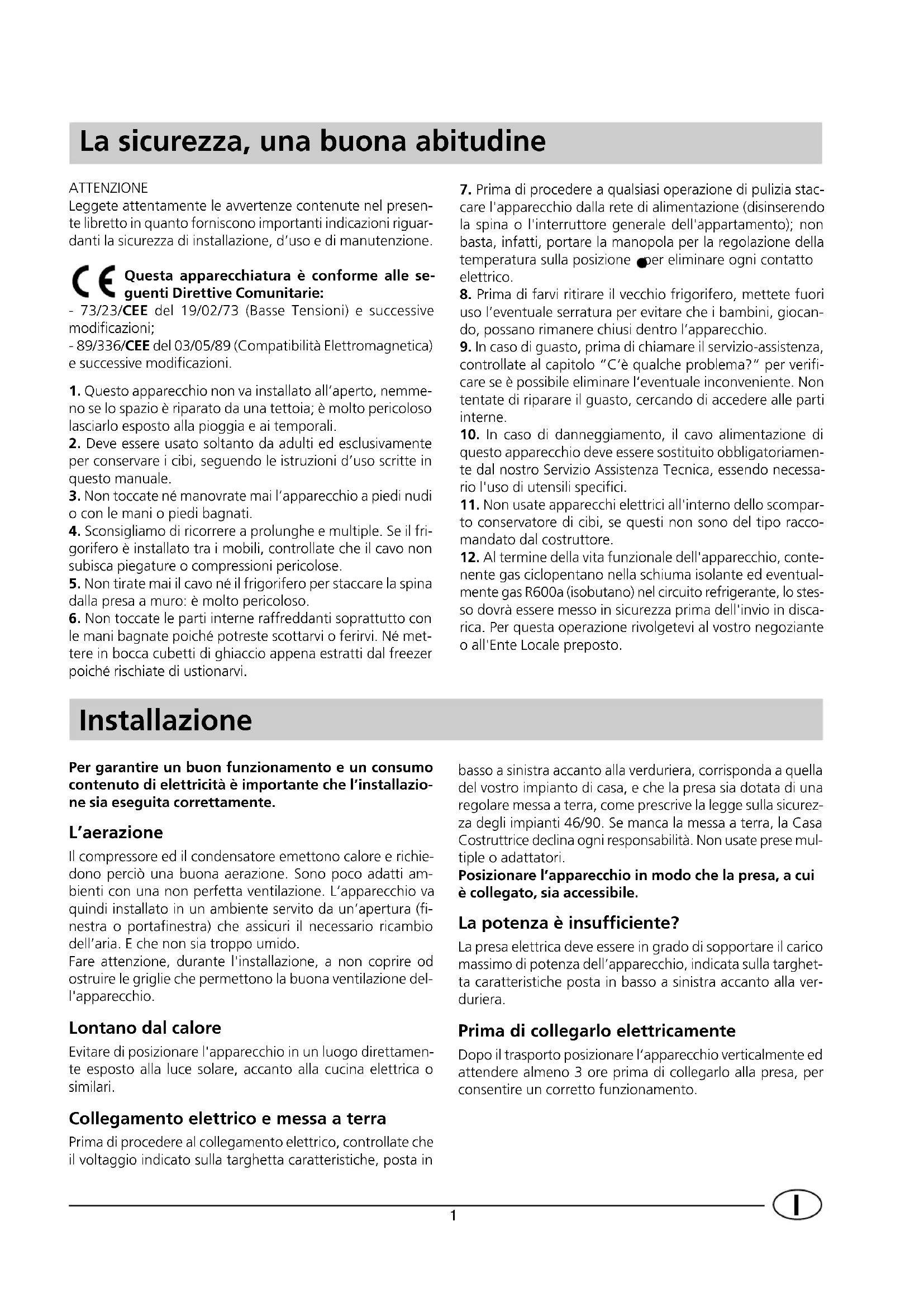 nente gas ciclopentano nella schiuma isolante ed eventual- mente gas R600a (isobutano) nel circuito refrigerante, lo stes- so dovrà essere messo in sicurezza prima dell'invio in disca- rica. Per questa operazione rivolgetevi al vostro negoziante o all'Ente Locale preposto. ATTENZIONE Leggete attentamente le avvertenze contenute nel presen- te libretto in quanto forniscono importanti indicazioni riguar- danti la sicurezza di installazione, d’uso e di manutenzione. Questa apparecchiatura è conforme alle se- guenti Direttive Comunitarie: - 73/23/CEE del 19/02/73 (Basse Tensioni) e successive modificazioni; - 89/336/CEE del 03/05/89 (Compatibilità Elettromagnetica) e successive modificazioni.2