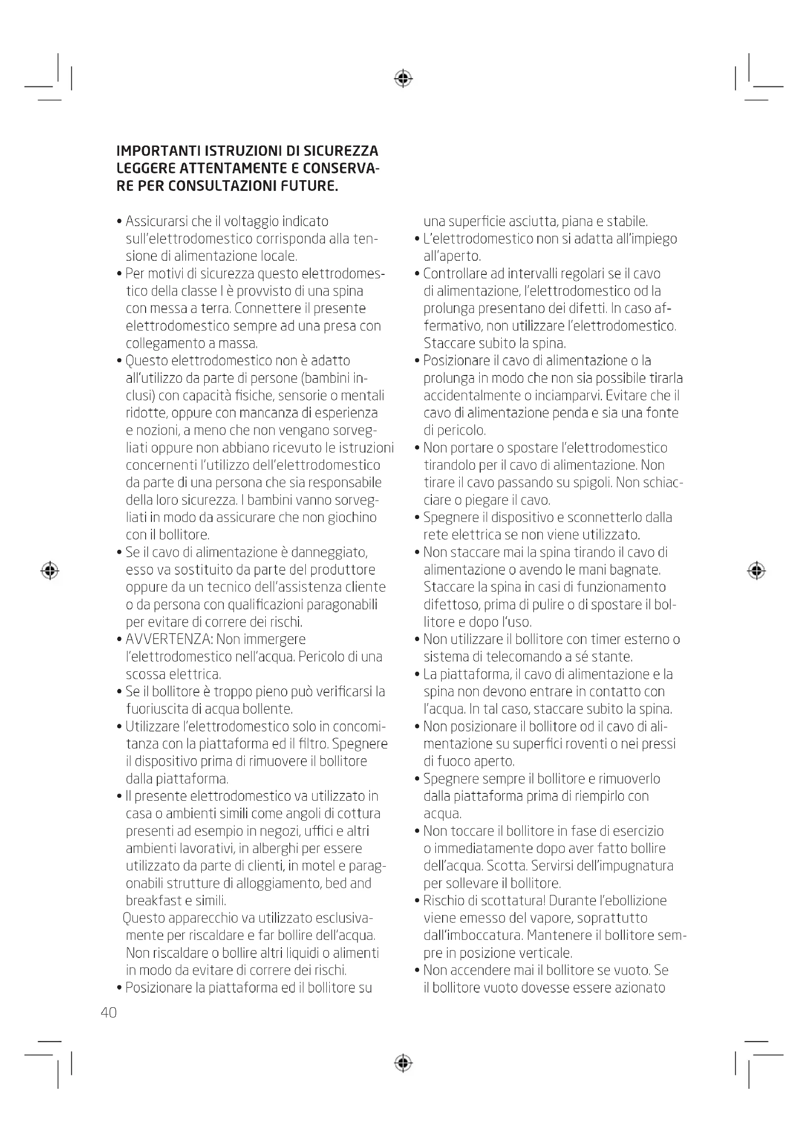 - Questo elettrodomestico non è adatto all'utilizzo da parte di persona (bambini inclusi) con energia fisiche, sensorie o mentali ridotte, oppure con mancanza di esperenza e nozioni, a meno che non vengano sorvegliati oppure non abbiano ricevuto le istruzioni concernenti l'utilizzo dell'elettrodomestico da parte di una persona che sia responsable della loro sicurezza. I bambini vanno sorvegliati in modo da assicurare che non giochino con il bollitore.