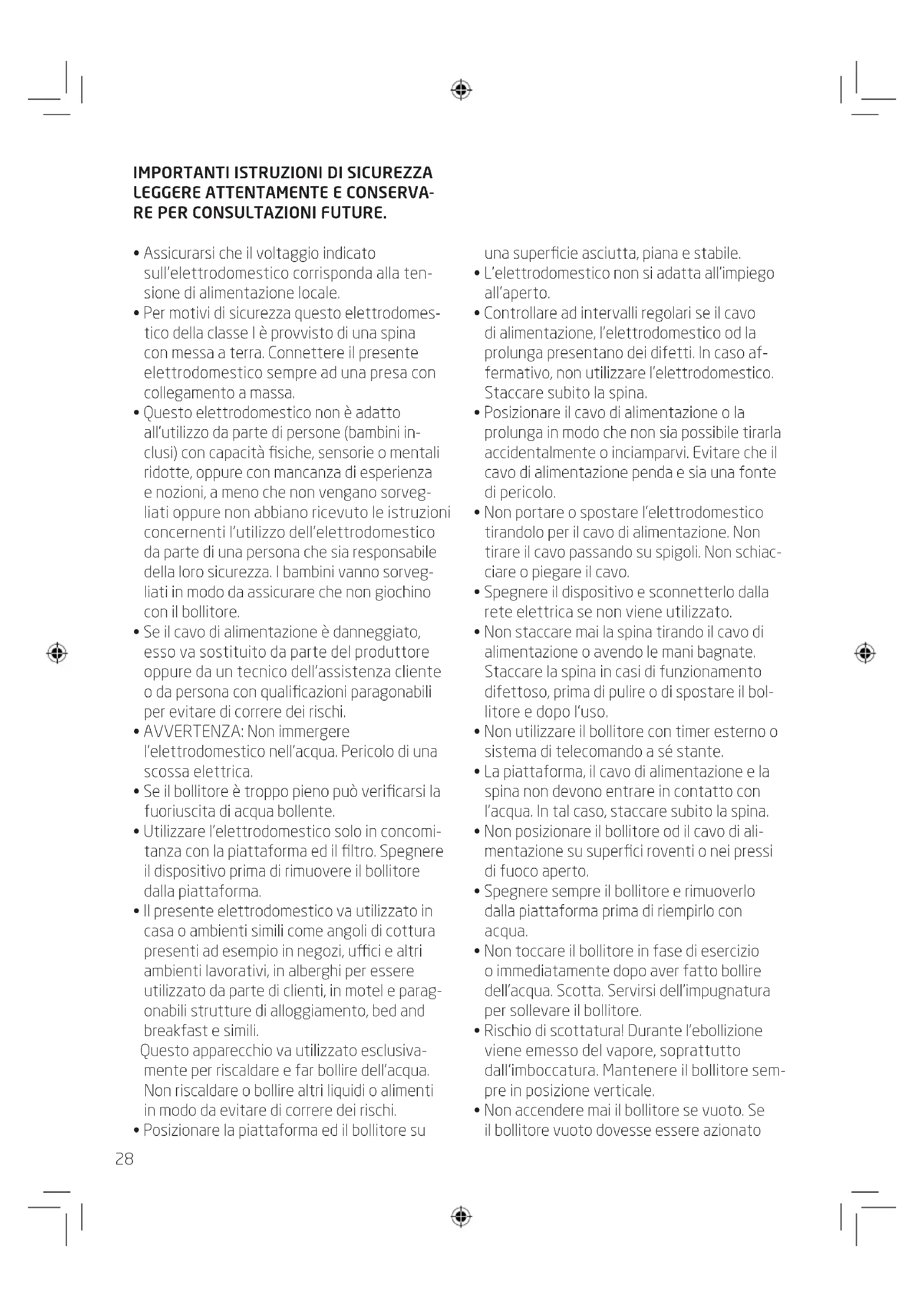 - Questo elettrodomestico non è adatto all’utilizzo da parte di persone (bambini in- clusi) con capacità siche, sensorie o mentali ridotte, oppure con mancanza di esperienza e nozioni, a meno che non vengano sorveg- liati oppure non abbiano ricevuto le istruzioni concernenti l’utilizzo dell’elettrodomestico da parte di una persona che sia responsabile della loro sicurezza. I bambini vanno sorveg- liati in modo da assicurare che non giochino con il bollitore.