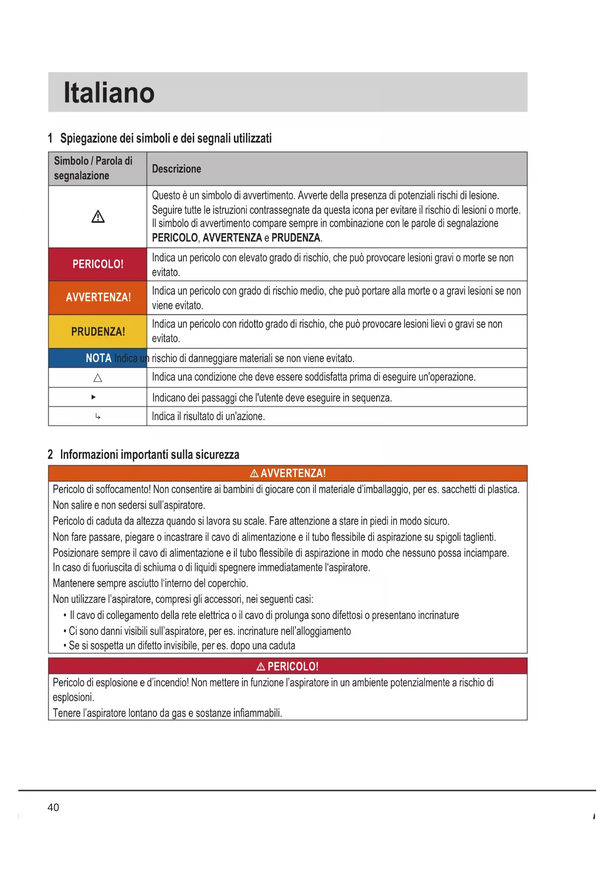 Indica una condizione che deve essere soddisfatta prima di eseguire un'operazione. ▶ Indicano dei passaggi che l'utente deve eseguire in sequenza. ↳ Indica il risultato di un'azione. 2 Informazioni importanti sulla sicurezza l AVVERTENZA! Pericolo di soffocamento! Non consentire ai bambini di giocare con il materiale d’imballaggio, per es. sacchetti di plastica. Non salire e non sedersi sull’aspiratore. Pericolo di caduta da altezza quando si lavora su scale. Fare attenzione a stare in piedi in modo sicuro. Non fare passare, piegare o incastrare il cavo di alimentazione e il tubo essibile di aspirazione su spigoli taglienti. Posizionare sempre il cavo di alimentazione e il tubo essibile di aspirazione in modo che nessuno possa inciampare. In caso di fuoriuscita di schiuma o di liquidi spegnere immediatamente l‘aspiratore. Mantenere sempre asciutto l‘interno del coperchio. Non utilizzare l’aspiratore, compresi gli accessori, nei seguenti casi: