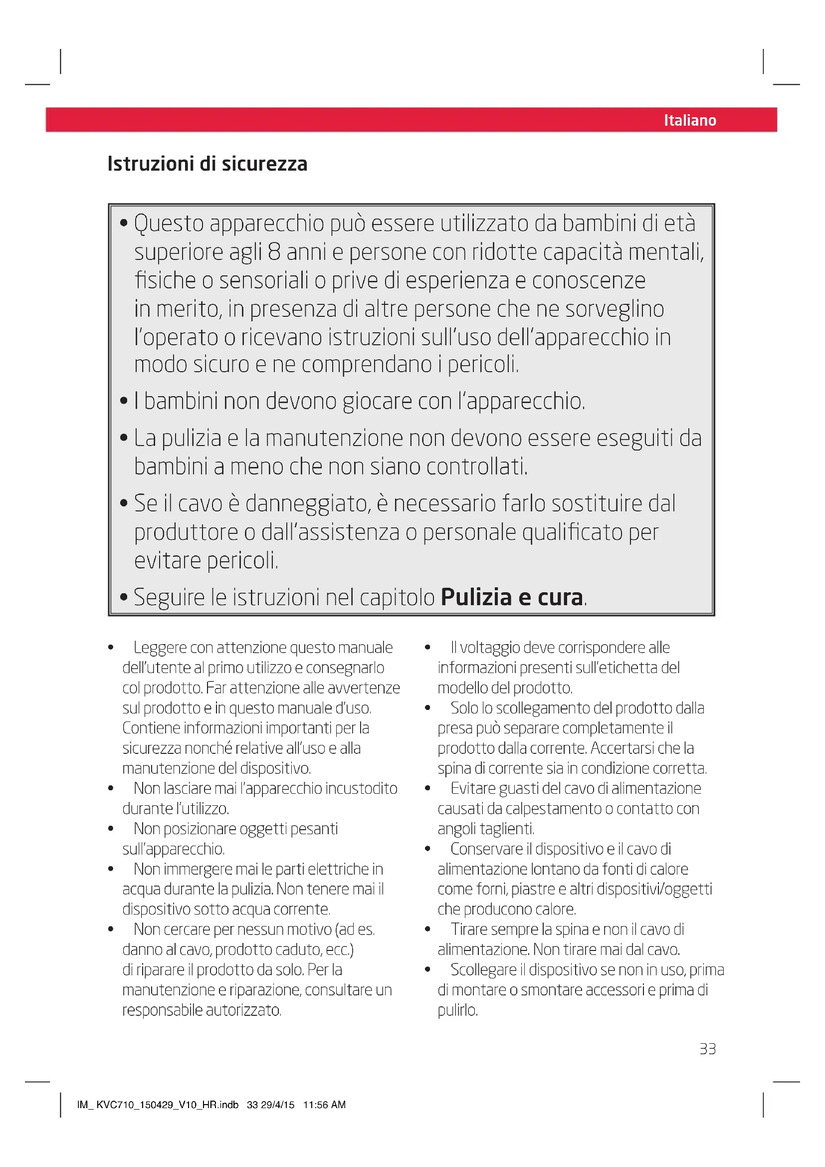 - Scollegare il dispositivo se non in uso, prima di montare o smontare accessori e prima di pulirlo. IM_ KVC710_150429_V10_HR.indb 33 29/4/15 11:56 AMItaliano