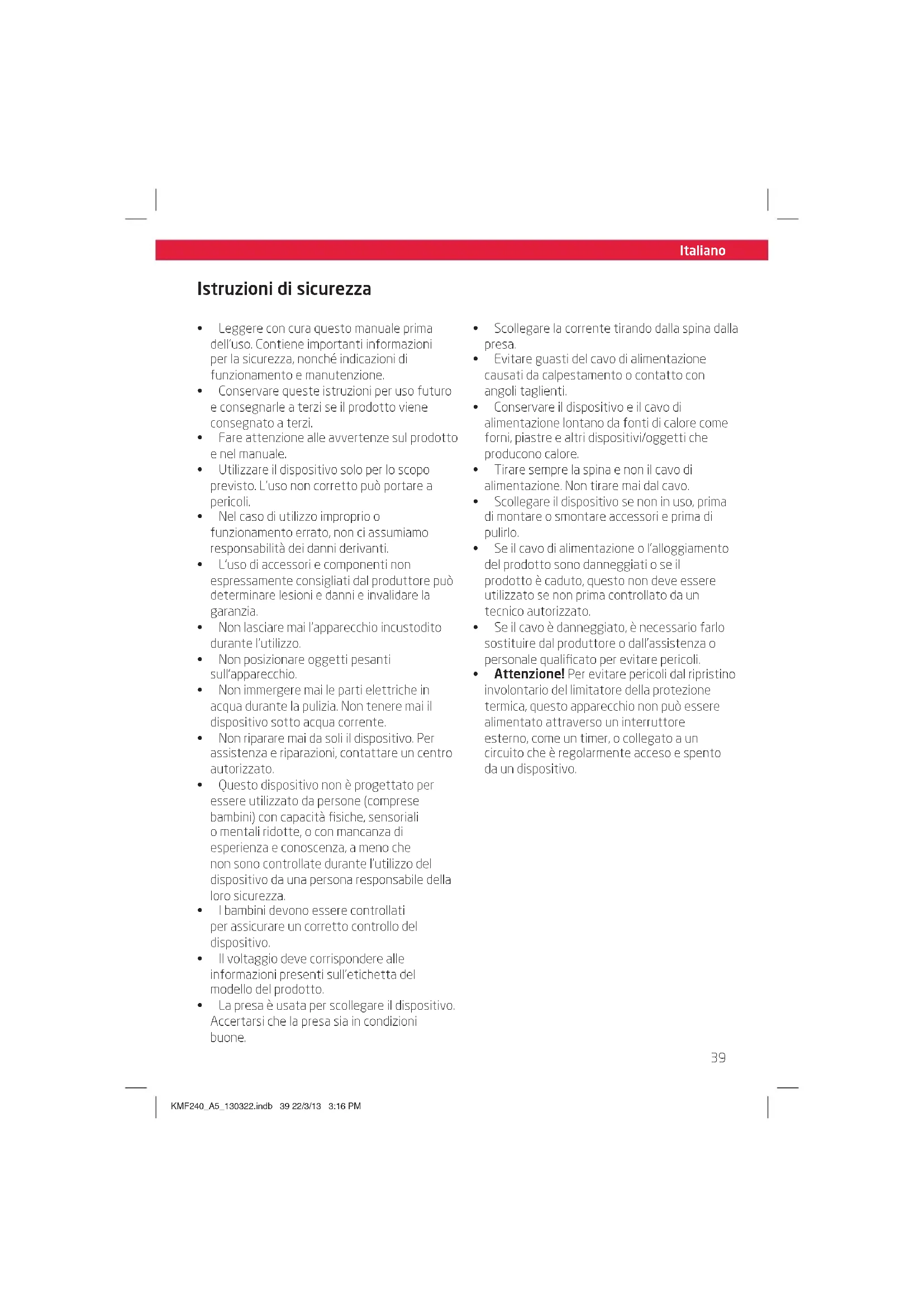 Œ Leggere con cura questo manuale prima dell’uso. Contiene importanti informazioni per la sicurezza, nonché indicazioni di funzionamento e manutenzione. Œ Conservare queste istruzioni per uso futuro e consegnarle a terzi se il prodotto viene consegnato a terzi. Œ Fare attenzione alle avvertenze sul prodotto e nel manuale. Œ Utilizzare il dispositivo solo per lo scopo previsto. L’uso non corretto può portare a pericoli. Œ Nel caso di utilizzo improprio o funzionamento errato, non ci assumiamo responsabilità dei danni derivanti. Œ L’uso di accessori e componenti non espressamente consigliati dal produttore può determinare lesioni e danni e invalidare la garanzia. Œ Non lasciare mai l’apparecchio incustodito durante l’utilizzo. Œ Non posizionare oggetti pesanti sull’apparecchio. Œ Non immergere mai le parti elettriche in acqua durante la pulizia. Non tenere mai il dispositivo sotto acqua corrente. Œ Non riparare mai da soli il dispositivo. Per assistenza e riparazioni, contattare un centro autorizzato. Œ Questo dispositivo non è progettato per essere utilizzato da persone (comprese bambini) con capacità fisiche, sensoriali o mentali ridotte, o con mancanza di esperienza e conoscenza, a meno che non sono controllate durante l’utilizzo del dispositivo da una persona responsabile della loro sicurezza. Œ I bambini devono essere controllati per assicurare un corretto controllo del dispositivo. Œ Il voltaggio deve corrispondere alle informazioni presenti sull’etichetta del modello del prodotto. Œ La presa è usata per scollegare il dispositivo. Accertarsi che la presa sia in condizioni buone. Œ Scollegare la corrente tirando dalla spina dalla presa. Œ Evitare guasti del cavo di alimentazione causati da calpestamento o contatto con angoli taglienti. Œ Conservare il dispositivo e il cavo di alimentazione lontano da fonti di calore come forni, piastre e altri dispositivi/oggetti che producono calore. Œ Tirare sempre la spina e non il cavo di alimentazione. Non tirare mai dal cavo. Œ Scollegare il dispositivo se non in uso, prima di montare o smontare accessori e prima di pulirlo. Œ Se il cavo di alimentazione o l’alloggiamento del prodotto sono danneggiati o se il prodotto è caduto, questo non deve essere utilizzato se non prima controllato da un tecnico autorizzato. Œ Se il cavo è danneggiato, è necessario farlo sostituire dal produttore o dall’assistenza o personale qualificato per evitare pericoli. Œ Attenzione! Per evitare pericoli dal ripristino involontario del limitatore della protezione termica, questo apparecchio non può essere alimentato attraverso un interruttore esterno, come un timer, o collegato a un circuito che è regolarmente acceso e spento da un dispositivo. Istruzioni di sicurezza KMF240_A5_130322.indb 39 22/3/13 3:16 PMItaliano
