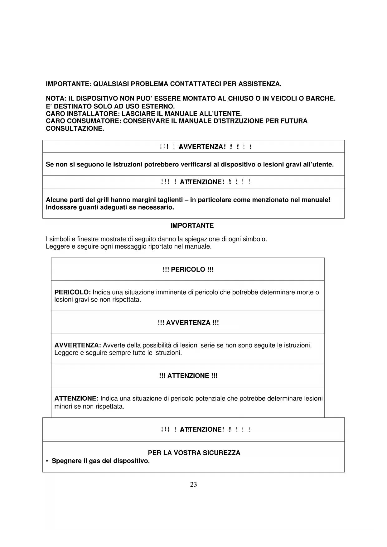 | PER LA VOSTRA SICUREZZA• Spegnere il gas del dispositivo. |
