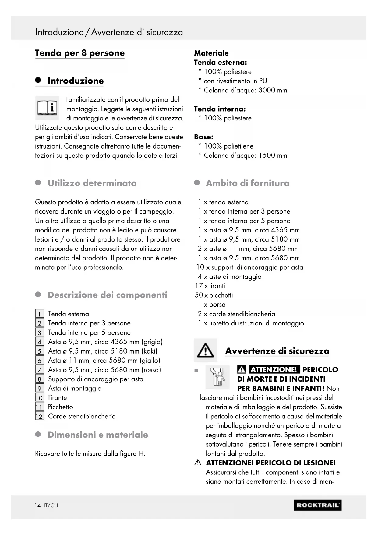 Ambito di fornitura 1 x tenda esterna 1 x tenda interna per 3 persone 1 x tenda interna per 5 persone 1 x asta ø 9,5 mm, circa 4365 mm 1 x asta ø 9,5 mm, circa 5180 mm 2 x aste ø 11 mm, circa 5680 mm 1 x asta ø 9,5 mm, circa 5680 mm 10 x supporti di ancoraggio per asta 4 x aste di montaggio 17 x tiranti 50 x picchetti 1 x borsa 2 x corde stendibiancheria 1 x libretto di istruzioni di montaggio Avvertenze di sicurezza