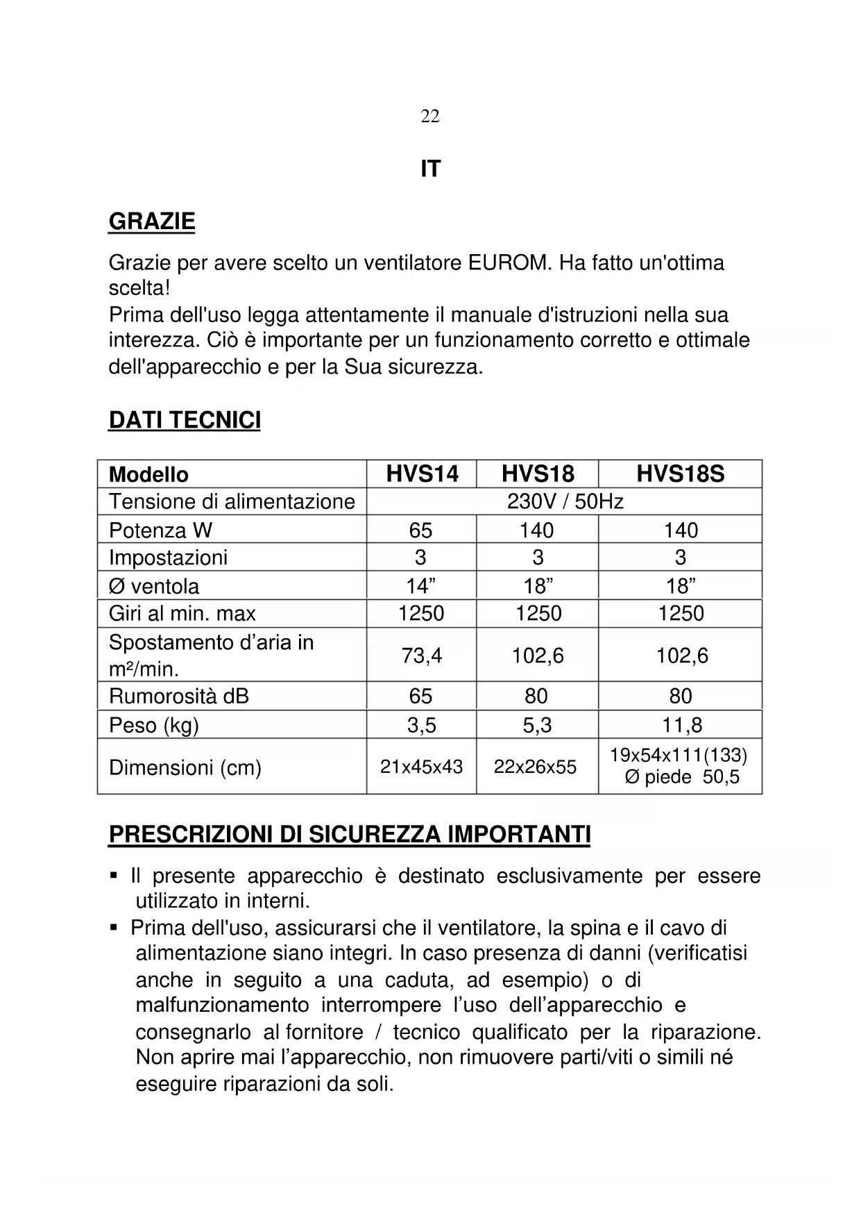 GRAZIE Grazie per avere scelto un ventilatore EUROM. Ha fatto un'ottima scelta! Prima dell'uso legga attentamente il manuale d'istruzioni nella sua interezza. Ciò è importante per un funzionamento corretto e ottimale dell'apparecchio e per la Sua sicurezza. DATI TECNICI Modello HVS14 HVS18 HVS18S Tensione di alimentazione 230V / 50Hz Potenza W