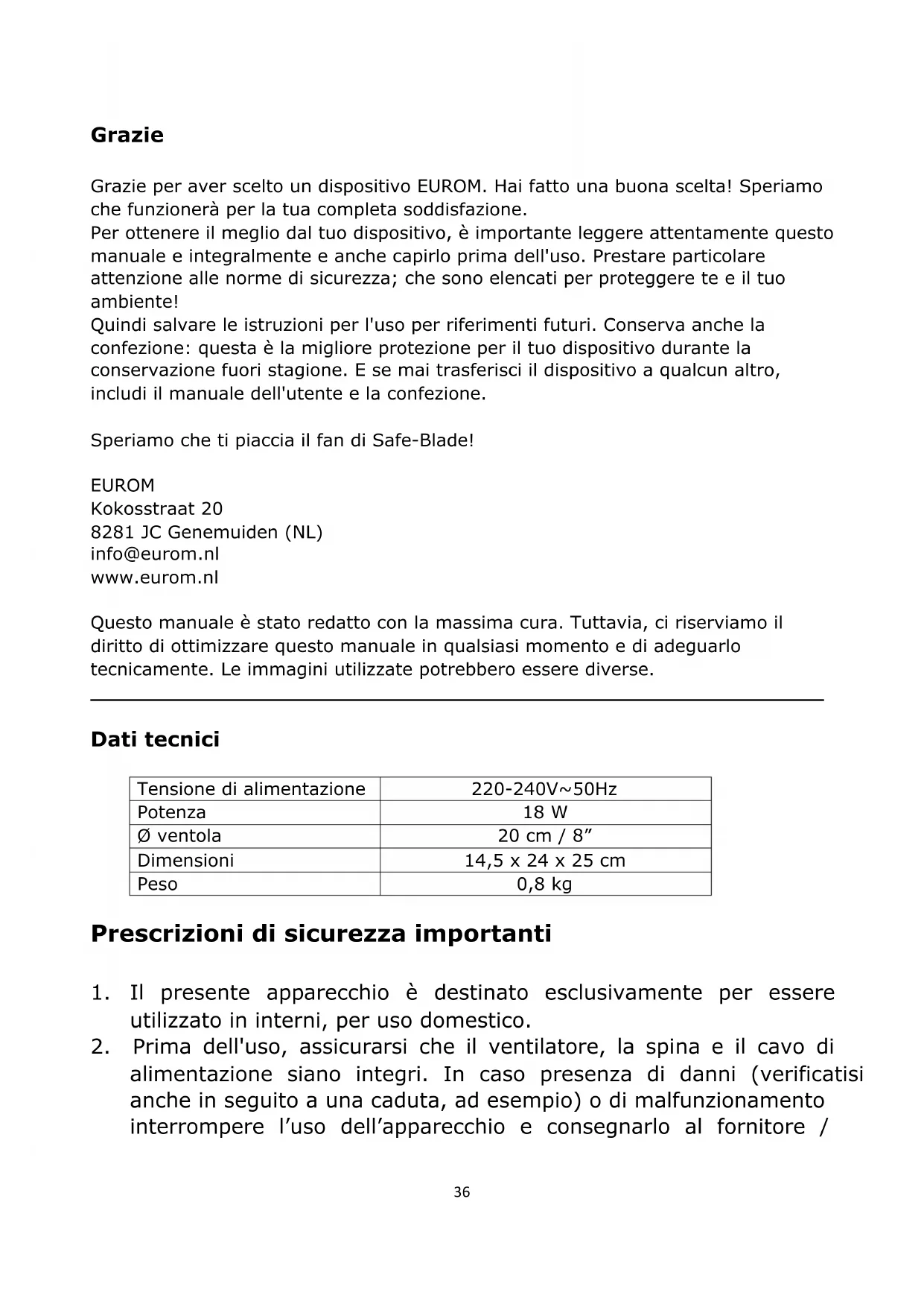 EN 61000-3-3:2013+A1:2019 RoHS 2011/65/EU&(EU)2015/863 Genemuiden, 07-10-2020 W.J. Bakker, alg. dir.36 Grazie Grazie per aver scelto un dispositivo EUROM. Hai fatto una buona scelta! Speriamo che funzionerà per la tua completa soddisfazione. Per ottenere il meglio dal tuo dispositivo, è importante leggere attentamente questo manuale e integralmente e anche capirlo prima dell'uso. Prestare particolare attenzione alle norme di sicurezza; che sono elencati per proteggere te e il tuo ambiente! Quindi salvare le istruzioni per l'uso per riferimenti futuri. Conserva anche la confezione: questa è la migliore protezione per il tuo dispositivo durante la conservazione fuori stagione. E se mai trasferisci il dispositivo a qualcun altro, includi il manuale dell'utente e la confezione. Speriamo che ti piaccia il fan di Safe-Blade! EUROM Kokosstraat 20 8281 JC Genemuiden (NL) info@eurom.nl www.eurom.nl Questo manuale è stato redatto con la massima cura. Tuttavia, ci riserviamo il diritto di ottimizzare questo manuale in qualsiasi momento e di adeguarlo tecnicamente. Le immagini utilizzate potrebbero essere diverse.