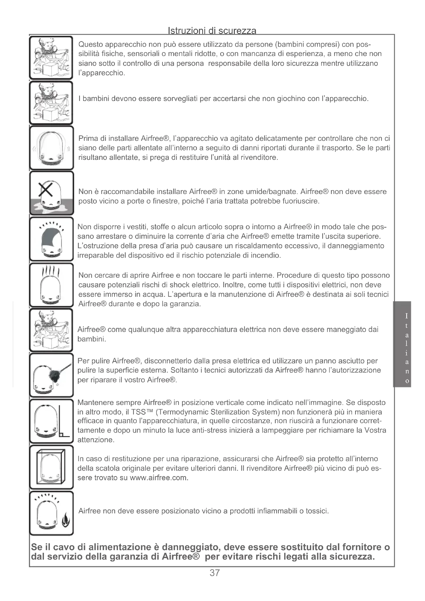 Non cercare di apririre Airfree e non toccare le parti interne. Procedure di quello tipo possono causare potenziali rischi di shock elettrico. Inoltre, come tutti i dispositivi elettrici, non deve essere immerso in acqua. L'apertura e la manutenzione di Airfree® è destinata ai soli tecnici Airfree® durante e dopo la garanzia.