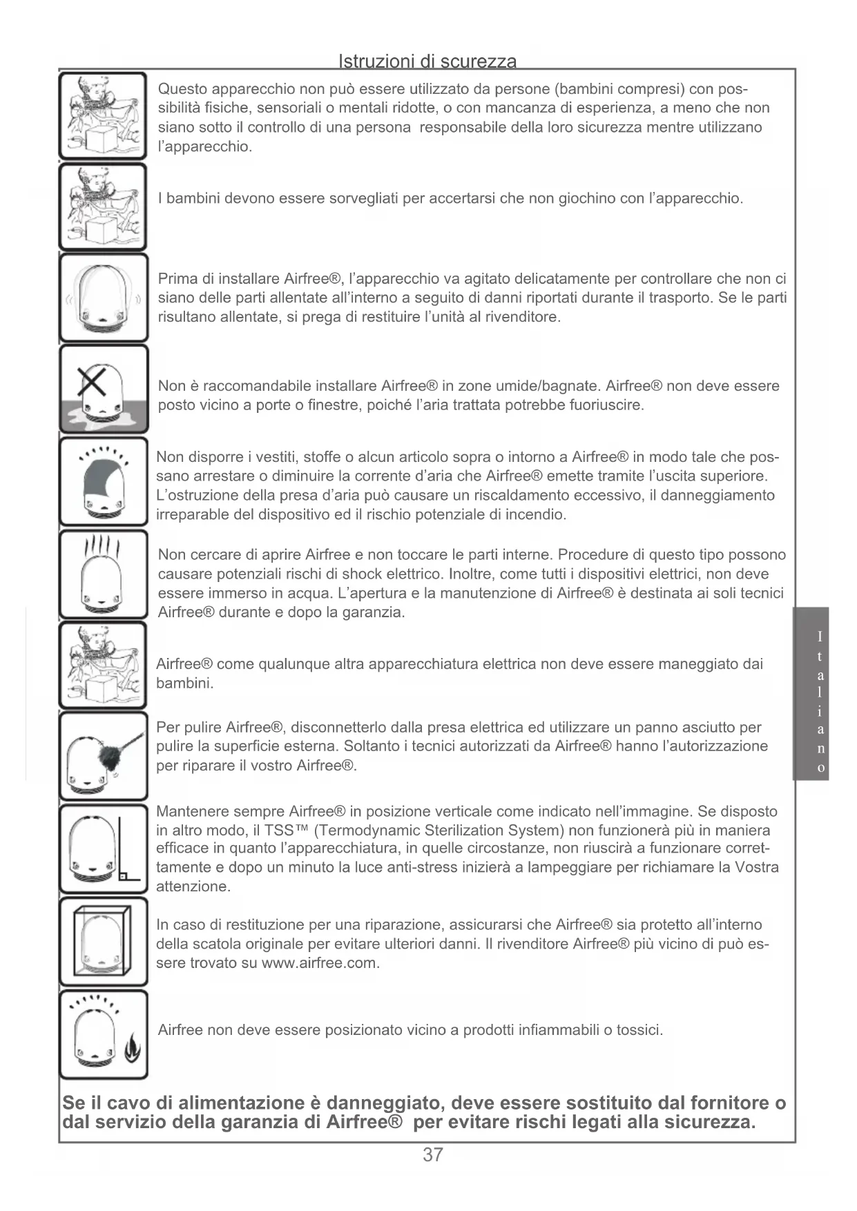 Istruzioni di scurezza Questo apparecchio non può essere utilizzato da persone (bambini compresi) con pos- sibilità siche, sensoriali o mentali ridotte, o con mancanza di esperienza, a meno che non siano sotto il controllo di una persona responsabile della loro sicurezza mentre utilizzano l’apparecchio. I bambini devono essere sorvegliati per accertarsi che non giochino con l’apparecchio. Prima di installare Airfree®, l’apparecchio va agitato delicatamente per controllare che non ci siano delle parti allentate all’interno a seguito di danni riportati durante il trasporto. Se le parti risultano allentate, si prega di restituire l’unità al rivenditore. Non è raccomandabile installare Airfree® in zone umide/bagnate. Airfree® non deve essere posto vicino a porte o nestre, poiché l’aria trattata potrebbe fuoriuscire. Non disporre i vestiti, stoffe o alcun articolo sopra o intorno a Airfree® in modo tale che pos- sano arrestare o diminuire la corrente d’aria che Airfree® emette tramite l’uscita superiore. L’ostruzione della presa d’aria può causare un riscaldamento eccessivo, il danneggiamento irreparable del dispositivo ed il rischio potenziale di incendio. Airfree® come qualunque altra apparecchiatura elettrica non deve essere maneggiato dai bambini. Mantenere sempre Airfree® in posizione verticale come indicato nell’immagine. Se disposto in altro modo, il TSS™ (Termodynamic Sterilization System) non funzionerà più in maniera efcace in quanto l’apparecchiatura, in quelle circostanze, non riuscirà a funzionare corret- tamente e dopo un minuto la luce anti-stress inizierà a lampeggiare per richiamare la Vostra attenzione. Airfree non deve essere posizionato vicino a prodotti inammabili o tossici. In caso di restituzione per una riparazione, assicurarsi che Airfree® sia protetto all’interno della scatola originale per evitare ulteriori danni. Il rivenditore Airfree® più vicino di può es- sere trovato su www.airfree.com. Non cercare di aprire Airfree e non toccare le parti interne. Procedure di questo tipo possono causare potenziali rischi di shock elettrico. Inoltre, come tutti i dispositivi elettrici, non deve essere immerso in acqua. L’apertura e la manutenzione di Airfree® è destinata ai soli tecnici Airfree® durante e dopo la garanzia. Per pulire Airfree®, disconnetterlo dalla presa elettrica ed utilizzare un panno asciutto per pulire la supercie esterna. Soltanto i tecnici autorizzati da Airfree® hanno l’autorizzazione per riparare il vostro Airfree®. Se il cavo di alimentazione è danneggiato, deve essere sostituito dal fornitore o dal servizio della garanzia di Airfree® per evitare rischi legati alla sicurezza.38 I nostri nemici invisibili La maggior parte delle persone trascorrono circa il 90% del loro tempo in casa o in ufcio. L’agenzia statunitense EPA - Environmental Protection Agency sostiene che la qualità dell’aria degli ambienti interni può essere 100 volte peggiore che all’aperto. Alcuni fattori contribuiscono alla contaminazione interna: - con un’alta concentrazione di persone aumentano i funghi, i batteri e lo sviluppo di virus e la contaminazione incrociata - le nuove tecniche di isolamento degli edici riducono gli interscambi di aria e di conseguenza i costi legati al condizionamento dell’aria, ma a loro volta aumentano drasticamente la muffa e lo sviluppo di colonie di batteri. - mancanza di pulizia nei condotti dell’aria condizionata. - concentrazione di materiale organico come libri, moquette, tende e divani. Una buona qualità dell’aria interna è indispensabile per le persone colpite da malattie respiratorie e da allergie. I contaminanti dell’aria interna (funghi, allergeni, pollini, ozono) possono innescare - asma, bronchiti, riniti e sinusiti. - infezioni fungine nei pazienti immunodecenti - irritazioni alla gola, occhi e naso - emicrania, irritabilità, sonnolenza - malessere e difcoltà di concentrazione Rapporto tra microrganismi e inerenti malattie. Inocolums(*) X Virulency (**)