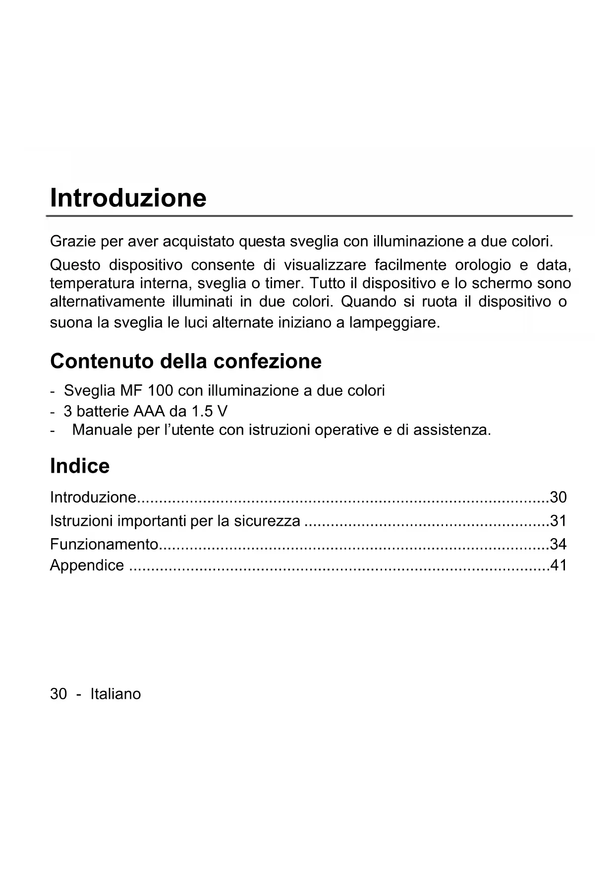 - Consente di spostarsi fra la visualizzazione della temperatura in gradi Centigradi e quella in gradi Fahrenheit. 3 SET Per avviare la programmazione di una funzione. 4 Altoparlante 5 Vano per le batterieItaliano - 35 Inserimento delle batterie Inserire le batterie nel dispositivo. - Aprire il vano per le batterie (5) spingendo il coperchio del pannello posteriore in direzione contraria a quella indicate dalla freccia. - Inserire le batterie in dotazione (AAA) nel dispositivo. Assicurarsi che le batterie siano disposte con la giusta polarità (+ e -). I simboli di polarità sono presenti sia sulle batterie sia nel relativo vano. - Far scivolare il coperchio del vano batterie al suo posto. Quando la visualizzazione dell’ora apparirà fioca, sostituire le batterie. Quando necessario, sostituire le batterie con altre nuove dello stesso tipo. Dopo la sostituzione delle batterie è necessario impostare nuovamente tutti i parametri. Specifiche Tecniche Modello Sveglia Auriol MF 100 con illuminazione a due colori Alimentazione 3 batterie AAA da 1.5 V Peso 68 g (senza le batterie) Dimensioni 76 x 76 x 38 mm (L x H x P)36 - Italiano Lo schermo Per spostarsi fra le varie modalità di visualizzazione della sveglia è sufficiente girare il dispositivo. [6] [7] [8] [9] Figura: Modalità operative dell’orologioItaliano - 37 Descrizione delle illustrazioni [6] Data e ora [7] Orario della sveglia [8] Conto alla rovescia [9] Temperatura Impostare data e ora È possibile spostarsi fra la visualizzazione su 12 ore e quella su 24. Premere il pulsante ADJ (2) per spostarsi fra i diversi formati. Questa scelta verrà applicata anche alla sveglia. Selezionando il formato su 12 ore, le ore pomeridiane saranno contrassegnate da “PM”. - Girare il dispositivo in modo da visualizzare l’orologio (vedere fig. 6). - Premere il pulsante SET (3) una volta. L’ora inizierà a lampeggiare. - Premere il pulsante ADJ (2) più volte per impostare l’ora. È possibile anche tenere premuto ADJ (2) per accelerare la regolazione dell’ora. - Premere nuovamente il pulsante SET (3). I minuti inizieranno a lampeggiare. - Premere il pulsante ADJ (2) più volte per impostare i minuti. - Procedere nello stesso modo per impostare mese, giorno e anno. - Una volta impostato l’anno l’operazione è conclusa.38 - Italiano Se si preme accidentalmente un’altra volta il pulsante SET (3), l’ora ricomincerà a lampeggiare. Continuare a premere SET (3) fino a quando i numeri non lampeggiano più. Impostazione della sveglia Questa funzione permette di impostare l’orario di sveglia quotidiano. - Girare il dispositivo in modo da visualizzare la sveglia (vedere fig. 7). - Premere il pulsante SET (3) una volta. L’ora inizierà a lampeggiare. - Premere il pulsante ADJ (2) più volte per impostare la sveglia. È possibile anche tenere premuto ADJ (2) per accelerare la regolazione dell’ora. - Premere nuovamente il pulsante SET (3). I minuti inizieranno a lampeggiare. - Premere il pulsante ADJ (2) più volte per impostare i minuti della sveglia. - Premere nuovamente il pulsante SET (3). La sveglia è impostata ed è stata attivata automaticamente. Un’icona con una campana indica che la sveglia è inserita. Per disattivarla, premere il pulsante SET (3) una volta. All’ora prestabilita il dispositivo emetterà un segnale acustico. Inoltre inizierà a lampeggiare alternativamente in due colori. Premere un pulsante o girare il dispositivo per disattivare il segnale acustico. La sveglia rimarrà in funzione e, dopo 24 ore, il segnale acustico ricomincerà a suonare.Italiano - 39 Per impostare un nuovo orario di sveglia o per riattivare un segnale acustico precedentemente disattivato, ripetere le operazioni di impostazione sveglia. Impostazione del timer del conto alla rovescia Il timer del conto alla rovescia può essere impostato per un intervallo di tempo massimo di 99 minuti e59 secondi. - Girare il dispositivo in modo da visualizzare il timer del conto alla rovescia (vedere fig. 8). Di default, lo schermo mostra “00:00”. - Premere il pulsante SET (3) una volta. I minuti inizieranno a lampeggiare. - Premere il pulsante ADJ (2) più volte per impostare i minuti del conto alla rovescia. È possibile anche tenere premuto ADJ (2) per accelerare la regolazione dell’ora. - Premere nuovamente il pulsante SET (3). I secondi inizieranno a lampeggiare. - Premere il pulsante ADJ (2) più volte per impostare i secondi del conto alla rovescia. - Premere nuovamente il pulsante SET (3). Il timer del conto alla rovescia è impostato e questa funzione è stata attivata automaticamente. Una volta trascorso l’intervallo di tempo prestabilito il dispositivo emetterà un segnale acustico. Premere un qualsiasi pulsante per sospendere il segnale. Il timer del conto alla rovescia verrà disattivato e sullo schermo apparirà “00:00”.40 - Italiano Per interrompere il segnale acustico è sufficiente anche girare il dispositivo. Riportando il dispositivo sulla visualizzazione del timer del conto alla rovescia, sullo schermo apparirà l’intervallo di tempo fissato precedentemente e il conto alla rovescia ripartirà dall’inizio. Visualizzazione della temperatura Girare il dispositivo in modo da visualizzare la temperaatura (vedere fig. 9). È possibile scegliere l’unità di misura fra gradi Centigradi e Fahrenheit. Premere il pulsante ADJ (2) per spostarsi fra le diverse unità di misura. L’unità selezionata è indicata dall’icona corrispondente. Ripristino di tutte le impostazioni Utilizzare un oggetto sottile (es. un’attache) per premere una volta il pulsante RESET (1). Tutte le impostazioni dell’orologio verranno riportate ai valori predefiniti di fabbrica.Italiano - 41 Appendice Riparazione e manutenzione Le riparazioni si rendono necessarie quando il prodotto ha subito dei danni come, per esempio, nel caso in cui del liquido sia penetrato all’interno di esso, il prodotto sia stato esposto a pioggia, in caso di malfunzionam