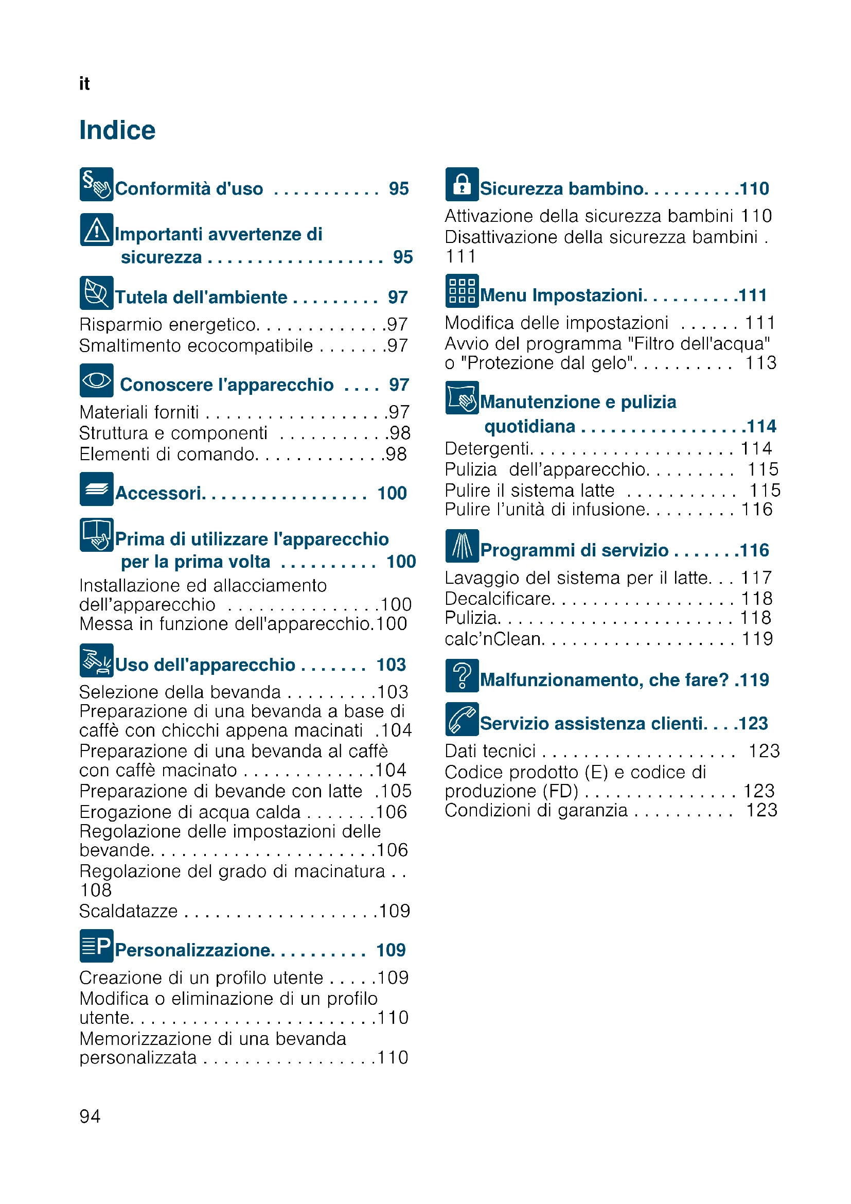 - Conoscere l'apparecchio . . . . 97 Materiali forniti . . . . . . . . . . . . . . . . . .97 Struttura e componenti . . . . . . . . . . .98 Elementi di comando. . . . . . . . . . . . .98 _ Accessori. . . . . . . . . . . . . . . . . 100 K Prima di utilizzare l'apparecchio per la prima volta . . . . . . . . . . 100 Installazione ed allacciamento dell’apparecchio . . . . . . . . . . . . . . .100 Messa in funzione dell'apparecchio.100 1 Uso dell'apparecchio . . . . . . . 103 Selezione della bevanda . . . . . . . . .103 Preparazione di una bevanda a base di caffè con chicchi appena macinati .104 Preparazione di una bevanda al caffè con caffè macinato . . . . . . . . . . . . .104 Preparazione di bevande con latte .105 Erogazione di acqua calda . . . . . . .106 Regolazione delle impostazioni delle bevande. . . . . . . . . . . . . . . . . . . . . .106 Regolazione del grado di macinatura . .