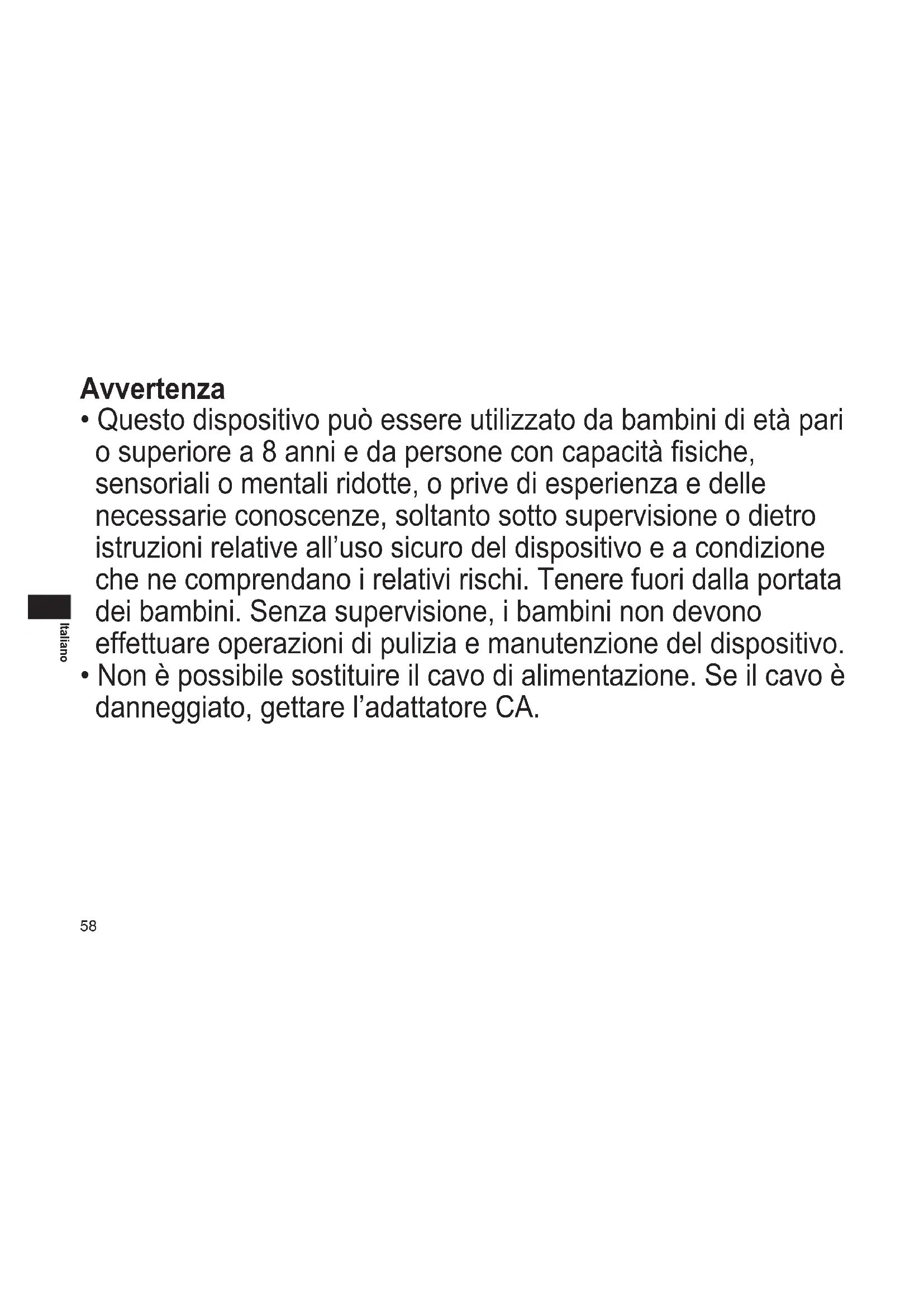 - Questodispositivopuòessereutilizzatodabambinidietàpari osuperiorea8anniedapersoneconcapacitàsiche, sensorialiomentaliridotte,oprivediesperienzaedelle necessarieconoscenze,soltantosottosupervisioneodietro istruzionirelativeall’usosicurodeldispositivoeacondizione chenecomprendanoirelativirischi.Tenerefuoridallaportata deibambini.Senzasupervisione,ibambininondevono effettuareoperazionidipuliziaemanutenzionedeldispositivo.