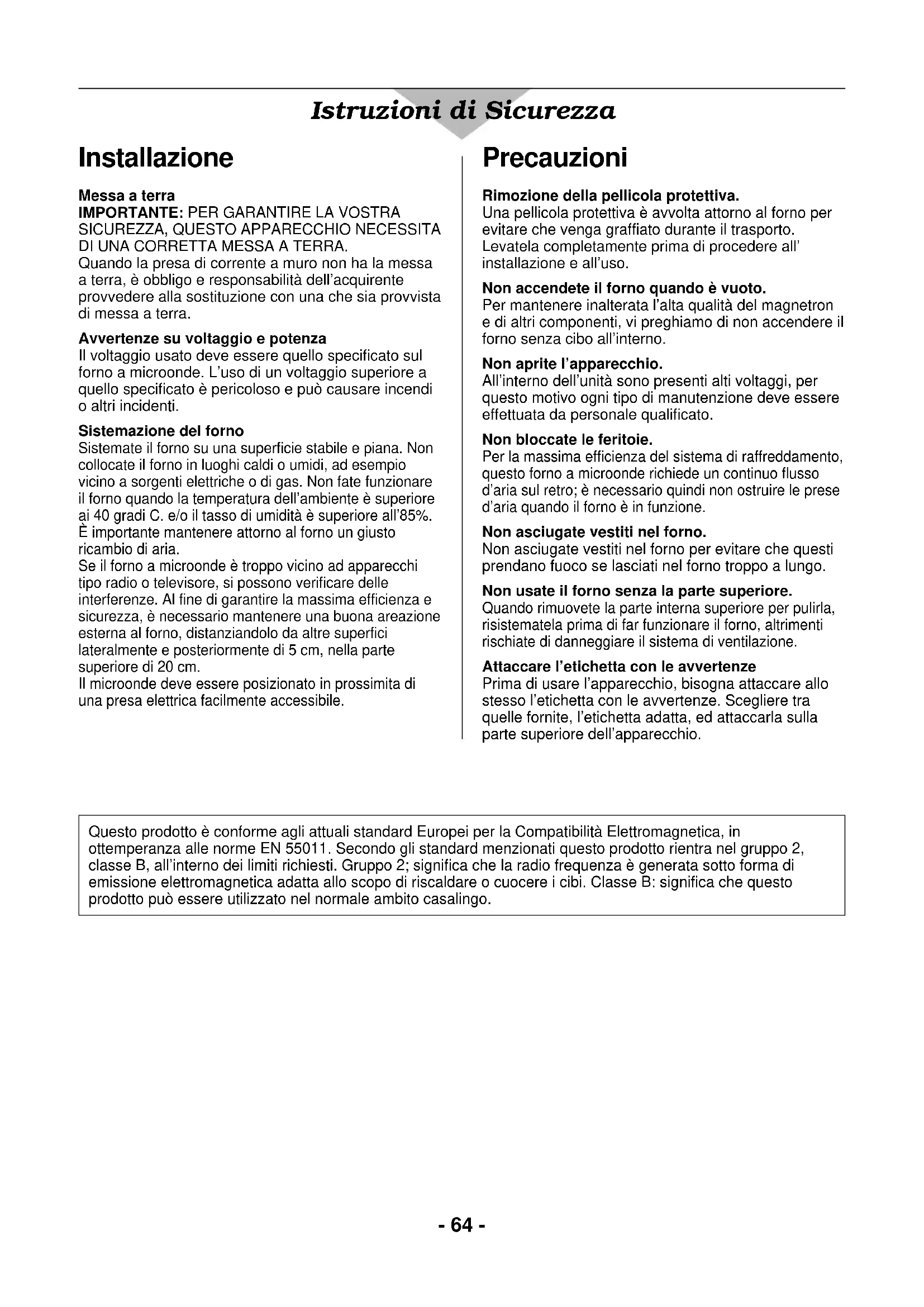 DI UNA CORRETTA MESSA A TERRA. Quando la presa di corrente a muro non ha la messa a terra, è obbligo e responsabilità dell’acquirente provvedere alla sostituzione con una che sia provvista di messa a terra. Avvertenze su voltaggio e potenza Il voltaggio usato deve essere quello specificato sul forno a microonde. L’uso di un voltaggio superiore a quello specificato è pericoloso e può causare incendi o altri incidenti. Sistemazione del forno Sistemate il forno su una superficie stabile e piana. Non collocate il forno in luoghi caldi o umidi, ad esempio vicino a sorgenti elettriche o di gas. Non fate funzionare il forno quando la temperatura dell’ambiente è superiore ai 40 gradi C. e/o il tasso di umidità è superiore all’85%. È importante mantenere attorno al forno un giusto ricambio di aria. Se il forno a microonde è troppo vicino ad apparecchi tipo radio o televisore, si possono verificare delle interferenze. Al fine di garantire la massima efficienza e sicurezza, è necessario mantenere una buona areazione esterna al forno, distanziandolo da altre superfici lateralmente e posteriormente di 5 cm, nella parte superiore di 20 cm. Il microonde deve essere posizionato in prossimita di una presa elettrica facilmente accessibile. Precauzioni Rimozione della pellicola protettiva. Una pellicola protettiva è avvolta attorno al forno per evitare che venga graffiato durante il trasporto. Levatela completamente prima di procedere all’ installazione e all’uso. Non accendete il forno quando è vuoto. Per mantenere inalterata l’alta qualità del magnetron e di altri componenti, vi preghiamo di non accendere il forno senza cibo all’interno. Non aprite l’apparecchio. All’interno dell’unità sono presenti alti voltaggi, per questo motivo ogni tipo di manutenzione deve essere effettuata da personale qualificato. Non bloccate le feritoie. Per la massima efficienza del sistema di raffreddamento, questo forno a microonde richiede un continuo flusso d’aria sul retro; è necessario quindi non ostruire le prese d’aria quando il forno è in funzione. Non asciugate vestiti nel forno. Non asciugate vestiti nel forno per evitare che questi prendano fuoco se lasciati nel forno troppo a lungo. Non usate il forno senza la parte superiore. Quando rimuovete la parte interna superiore per pulirla, risistematela prima di far funzionare il forno, altrimenti rischiate di danneggiare il sistema di ventilazione. Attaccare l’etichetta con le avvertenze Prima di usare l’apparecchio, bisogna attaccare allo stesso l’etichetta con le avvertenze. Scegliere tra quelle fornite, l’etichetta adatta, ed attaccarla sulla parte superiore dell’apparecchio. Questo prodotto è conforme agli attuali standard Europei per la Compatibilità Elettromagnetica, in ottemperanza alle norme EN 55011. Secondo gli standard menzionati questo prodotto rientra nel gruppo 2, classe B, all’interno dei limiti richiesti. Gruppo 2; significa che la radio frequenza è generata sotto forma di emissione elettromagnetica adatta allo scopo di riscaldare o cuocere i cibi. Classe B: significa che questo prodotto può essere utilizzato nel normale ambito casalingo.- 65 - Italiano Avvertenze