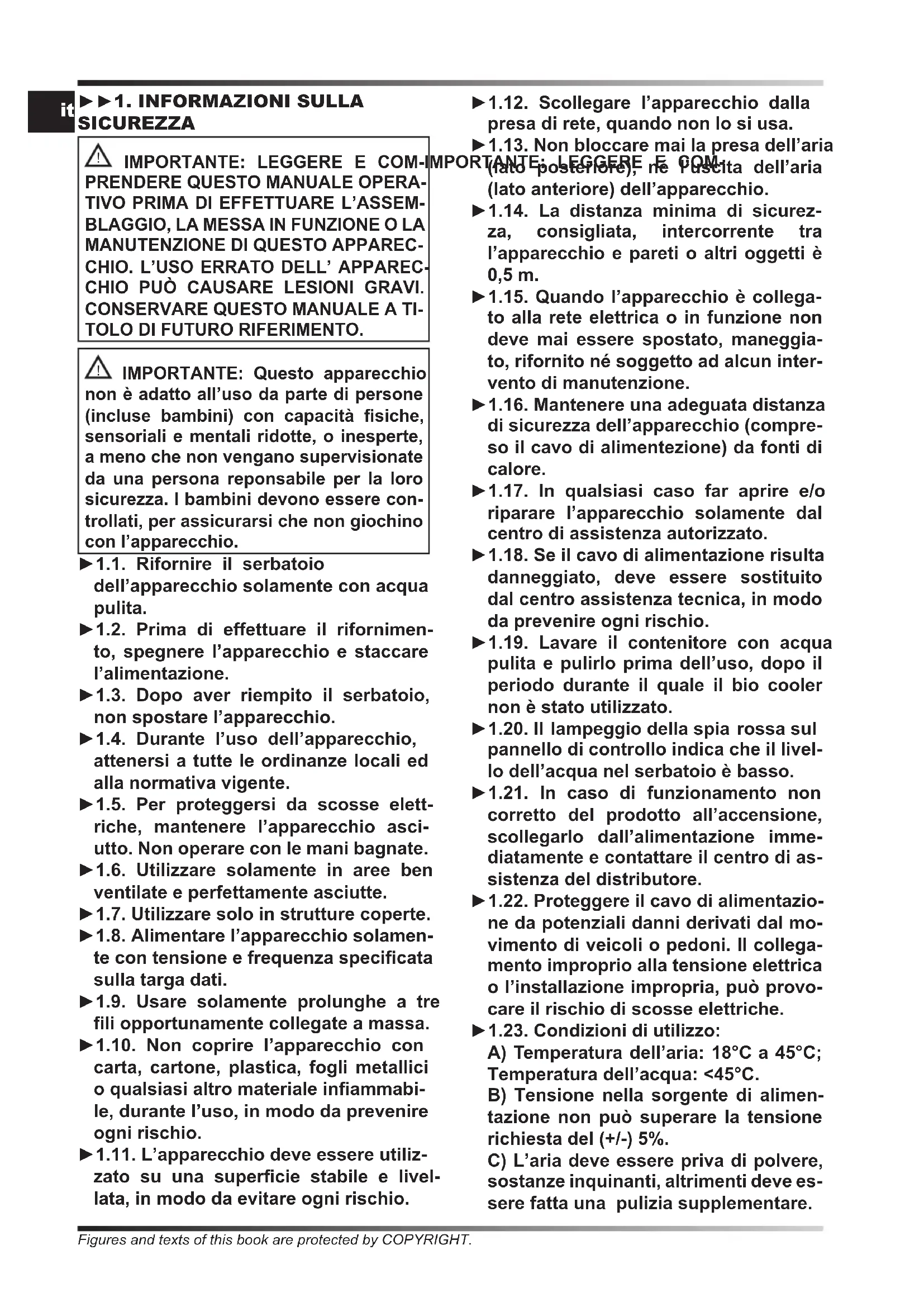 IMPORTANTE: Questo apparecchio non è adatto all’uso da parte di persone (incluse bambini) con capacità siche, sensoriali e mentali ridotte, o inesperte, a meno che non vengano supervisionate da una persona reponsabile per la loro sicurezza. I bambini devono essere con- trollati, per assicurarsi che non giochino con l’apparecchio. ►1.1. Rifornire il serbatoio dell’apparecchio solamente con acqua pulita. ►1.2. Prima di effettuare il rifornimen- to, spegnere l’apparecchio e staccare l’alimentazione. ►1.3. Dopo aver riempito il serbatoio, non spostare l’apparecchio. ►1.4. Durante l’uso dell’apparecchio, attenersi a tutte le ordinanze locali ed alla normativa vigente. ►1.5. Per proteggersi da scosse elett- riche, mantenere l’apparecchio asci- utto. Non operare con le mani bagnate. ►1.6. Utilizzare solamente in aree ben ventilate e perfettamente asciutte. ►1.7. Utilizzare solo in strutture coperte. ►1.8. Alimentare l’apparecchio solamen- te con tensione e frequenza specicata sulla targa dati. ►1.9. Usare solamente prolunghe a tre li opportunamente collegate a massa. ►1.10. Non coprire l’apparecchio con carta, cartone, plastica, fogli metallici o qualsiasi altro materiale inammabi- le, durante l’uso, in modo da prevenire ogni rischio. ►1.11. L’apparecchio deve essere utiliz- zato su una supercie stabile e livel- lata, in modo da evitare ogni rischio. ►1.12. Scollegare l’apparecchio dalla presa di rete, quando non lo si usa. ►1.13. Non bloccare mai la presa dell’aria (lato posteriore), né l’uscita dell’aria (lato anteriore) dell’apparecchio. ►1.14. La distanza minima di sicurez- za, consigliata, intercorrente tra l’apparecchio e pareti o altri oggetti è 0,5 m. ►1.15. Quando l’apparecchio è collega- to alla rete elettrica o in funzione non deve mai essere spostato, maneggia- to, rifornito né soggetto ad alcun inter- vento di manutenzione. ►1.16. Mantenere una adeguata distanza di sicurezza dell’apparecchio (compre- so il cavo di alimentezione) da fonti di calore. ►1.17. In qualsiasi caso far aprire e/o riparare l’apparecchio solamente dal centro di assistenza autorizzato. ►1.18. Se il cavo di alimentazione risulta danneggiato, deve essere sostituito dal centro assistenza tecnica, in modo da prevenire ogni rischio. ►1.19. Lavare il contenitore con acqua pulita e pulirlo prima dell’uso, dopo il periodo durante il quale il bio cooler non è stato utilizzato. ►1.20. Il lampeggio della spia rossa sul pannello di controllo indica che il livel- lo dell’acqua nel serbatoio è basso. ►1.21. In caso di funzionamento non corretto del prodotto all’accensione, scollegarlo dall’alimentazione imme- diatamente e contattare il centro di as- sistenza del distributore. ►1.22. Proteggere il cavo di alimentazio- ne da potenziali danni derivati dal mo- vimento di veicoli o pedoni. Il collega- mento improprio alla tensione elettrica o l’installazione impropria, può provo- care il rischio di scosse elettriche. ►1.23. Condizioni di utilizzo: A) Temperatura dell’aria: 18°C a 45°C; Temperatura dell’acqua: <45°C. B) Tensione nella sorgente di alimen- tazione non può superare la tensione richiesta del (+/-) 5%. C) L’aria deve essere priva di polvere, sostanze inquinanti, altrimenti deve es- sere fatta una pulizia supplementare. Figures and texts of this book are protected by COPYRIGHT.it ►►2. DISIMBALLAGGIO ►2.1. Rimuovere tutti i materiali di imbal- laggio usati per confezionare e spedire l’apparecchio e smaltirli secondo le norme vigenti. ►2.2. Estrarre tutti gli articoli dall’imballo. ►2.3. Controllare eventuali danni subiti du- rante il trasporto. Se l’apparecchio appare danneggiato, informare immediatamente il concessionario presso il quale è stato acquistato. ►►3. ASSEMBLAGGIO L’apparecchio è dotato di ruote per agevo- lare la movimentazione. A seconda del mo- dello, le ruote si possono trovare installate, oppure sono da installare. I componenti, completi della relativa bulloneria di montag- gio, sono situati all’interno dell’imballo (Fig. 1). ►►4. FUNZIONAMENTO AVVERTENZA: Leggere attentamente le ”INFORMAZIONI SULLA SICUREZZA”, prima di accendere l’apparecchio. AVVERTENZA: Usare solamente acqua pulita, per evitare guasti o altre anomalie. AVVERTENZA: Vericare la corretta messa a terra del vostro impianto elettrico. Il collegamento alla rete elettrica va fatto in accordo con le norme nazionali vigenti. Alimentare l’apparecchio solamente con tensione e frequenza specicata sulla targa dati. NOTA: Questi modelli possono essere collegati alla rete idrica, collegando il tubo al raccordo (Fig. 10). ►►4.1. ACCENSIONE: ►4.1.1. Aprire lo sportello del serbatoio (Fig. 2). ►4.1.2. Rifornire d’acqua il sebatoio (Fig. 3), il livello dell’acqua deve essere compreso tra MIN e MAX della scala graduata, posta sul anco dell’apparecchio (Fig. 4), al ne di evitare rischi. ►4.1.3. Chiudere lo sportello del serbatoio (Fig. 5). ►4.1.4. Collegare la spina di alimentazione alla rete elettrica (Fig. 6). ►4.1.5. Premere il pulsante ON/OFF per accendere l’apparecchio (Fig. 9). ►►4.2. PANNELLO DI CONTROLLO,