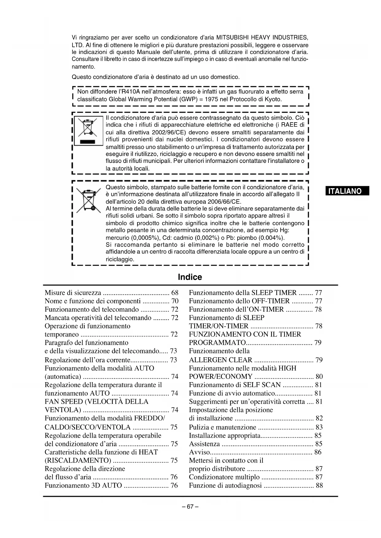 - Vi ringraziamo per aver scelto un condizionatore d’aria MITSUBISHI HEAVY INDUSTRIES, LTD. Al fine di ottenere le migliori e più durature prestazioni possibili, leggere e osservare le indicazioni di questo Manuale dell’utente, prima di utilizzare il condizionatore d’aria. Consultare il libretto in caso di incertezze sull’impiego o in caso di eventuali anomalie nel funzio- namento. Questo condizionatore d’aria è destinato ad un uso domestico. Indice ITALIANO Non diffondere l’R410A nell’atmosfera: esso è infatti un gas fluorurato a effetto serra classificato Global Warming Potential (GWP) = 1975 nel Protocollo di Kyoto. Misure di sicurezza p. 68