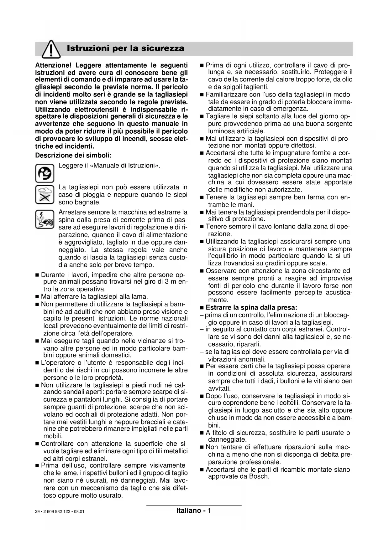 ZIONE! MAI TOCCARE LE LAME IN MOVI- MENTO. 30 • 2 609 932 122 • 08.01Italiano - 3 Sicurezza elettrica La Vostra macchina presenta un doppio isolamento di sicurezza e non richiede la messa a terra. La ten- sione operativa è di 230 V CA, 50 Hz. Utilizzare solo una prolunga omologata. Per maggiori dettagli, met- tersi in contatto con l’incaricato dell’assistenza. È permesso utilizzare soltanto cavi di prolunga del tipo H05VV-F oppure H05RN-F. Per una maggiore sicurezza, si consiglia di usare un dispositivo di protezione dalla corrente residua (RCD) con una corrente di apertura non superiore ai 30 mA. Controllare sempre tale dispositivo ogni volta che si usa il tosaerba. Indicazione per prodotti che non vengono venduti in GB: ATTENZIONE: Per la Vostra sicurezza è ne- cessario che la spina 6 applicata alla macchina sia collegata al cavo di prolunga 8 come rappresentato nella figura. Il raccordo del cavo di prolunga deve essere protetto contro gli spruzzi dell’acqua, deve essere di gomma oppure essere coperto da gomma. Il cavo di prolunga deve essere usato con un dispo- sitivo di scarico della trazione. Il cavo di collegamento deve essere controllato re- golarmente e può essere utilizzato soltanto quando è in perfetto stato. Un cavo di collegamento danneggiato può essere ri- parato esclusivamente presso uno dei centri autoriz- zati per il Servizio Tecnico Bosch. Avviare: Premere l’interruttore avvio/arresto all’impugnatura posteriore 5 e tenerlo premuto. Premere la leva di comando 3. Arrestare: Rilasciare la leva di comando 3 e l’interruttore av- vio/arresto 5. Afferrare la tagliasiepi con entrambe le mani e tenerla sempre ad una distanza suf- ficiente dal proprio corpo. Stare sempre attenti a prendere una sicura posizione di lavoro. Tenere il cavo di prolunga sulla propria spalla verso l’indietro ed accertarsi che durante l’operazione di taglio resta sempre dietro. Mai poggiare il cavo sulla siepe perché potrebbe facilmente essere preso dai coltelli. È possibile tagliare rami che arrivano ad un diametro massimo di 24 mm. Per cominciare a tagliare i ra- moscelli con i coltelli della lama, avanzare con la tagliasiepi uniformemente in avanti sulla linea di ta- glio. La lama a doppio taglio permette di tagliare in ambedue le direzioni oppure mediante moto pendo- lare da una parte all’altra. Tagliare prima i lati della siepe e poi il bordo supe- riore. Per riuscire ad avere lati piani, raccomandiamo di ta- gliare seguendo la direzione della vegetazione par- tendo dal basso e proseguendo verso l’alto. Ta- gliando dall’alto verso il basso, i ramoscelli più sottili si spostano verso l’esterno provocando in questo modo parti più sottili oppure buchi. Per poter infine tagliare uniformemente il bordo su- periore, tendere su tutta la lunghezza della siepe un’apposita corda regolata all’altezza che si ritiene necessaria. Fare sempre attenzione a non tagliare oggetti come per esempio fili metallici perché questi potrebbero danneggiare le lame oppure il motore della mac- china. Periodi in cui si taglia: – Il periodo migliore per tagliare le siepi di latifoglie è in giugno ed in ottobre. – Le siepi di conifera si tagliano in aprile ed in ago- sto. – Siepi di conifera ed altri tipi di siepi a crescita ve- loce si tagliano a partire da maggio ogni 6 setti- mane circa. – Le siepi dovrebbero essere tagliate in una forma che corrisponde a quella rappresentata nella fi- gura. Prima di eseguire ogni intervento di manu- tenzione, estrarre la spina di rete. Nota: Per garantire un funzionamento durevole ed affidabile, eseguire regolarmente le seguenti opera- zioni di manutenzione. Controllare regolarmente se la tagliasiepi abbia dei difetti visibili come per esempio potrebbe essere una lama libera, sbalzata fuori della guida oppure anche danneggiata, fissaggi liberi e usurati oppure compo- nenti danneggiati. Controllare se i coperchi ed i dispositivi di protezione sono intatti e se sono stati montati correttamente. Riparazioni necessarie oppure lavori di manuten- zione devono essere eseguiti prima di cominciare ad usare la tagliasiepi. Se nonostante gli accurati procedimenti di produ- zione e di controllo la tagliasiepi dovesse guastarsi, la riparazione va fatta effettuare da un punto di assi- stenza autorizzato per gli elettroutensili Bosch. Comunicare sempre il codice di ordinazione a 10 cifre dell’elettroutensile in caso di richieste o di ordinazione di pezzi di ricambio! Avvio e Arresto Lavorare con la tagliasiepi