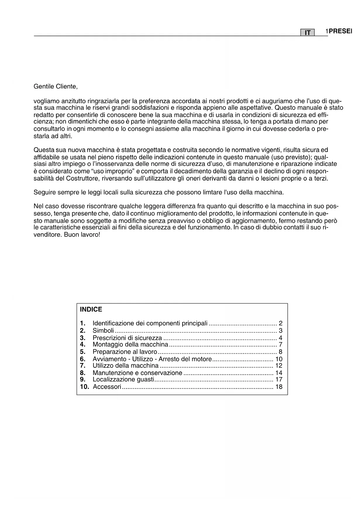 25viGentile Cliente, vogliamo anzitutto ringraziarla per la preferenza accordata ai nostri prodotti e ci auguriamo che l’uso di que- sta sua macchina le riservi grandi soddisfazioni e risponda appieno alle aspettative. Questo manuale è stato redatto per consentirle di conoscere bene la sua macchina e di usarla in condizioni di sicurezza ed effi- cienza; non dimentichi che esso è parte integrante della macchina stessa, lo tenga a portata di mano per consultarlo in ogni momento e lo consegni assieme alla macchina il giorno in cui dovesse cederla o pre- starla ad altri. Questa sua nuova macchina è stata progettata e costruita secondo le normative vigenti, risulta sicura ed affidabile se usata nel pieno rispetto delle indicazioni contenute in questo manuale (uso previsto); qual- siasi altro impiego o l’inosservanza delle norme di sicurezza d’uso, di manutenzione e riparazione indicate è considerato come “uso improprio” e comporta il decadimento della garanzia e il declino di ogni respon- sabilità del Costruttore, riversando sull’utilizzatore gli oneri derivanti da danni o lesioni proprie o a terzi. Seguire sempre le leggi locali sulla sicurezza che possono limtare l'uso della macchina. Nel caso dovesse riscontrare qualche leggera differenza fra quanto qui descritto e la macchina in suo pos- sesso, tenga presente che, dato il continuo miglioramento del prodotto, le informazioni contenute in que- sto manuale sono soggette a modifiche senza preavviso o obbligo di aggiornamento, fermo restando però le caratteristiche essenziali ai fini della sicurezza e del funzionamento. In caso di dubbio contatti il suo ri- venditore. Buon lavoro! INDICE