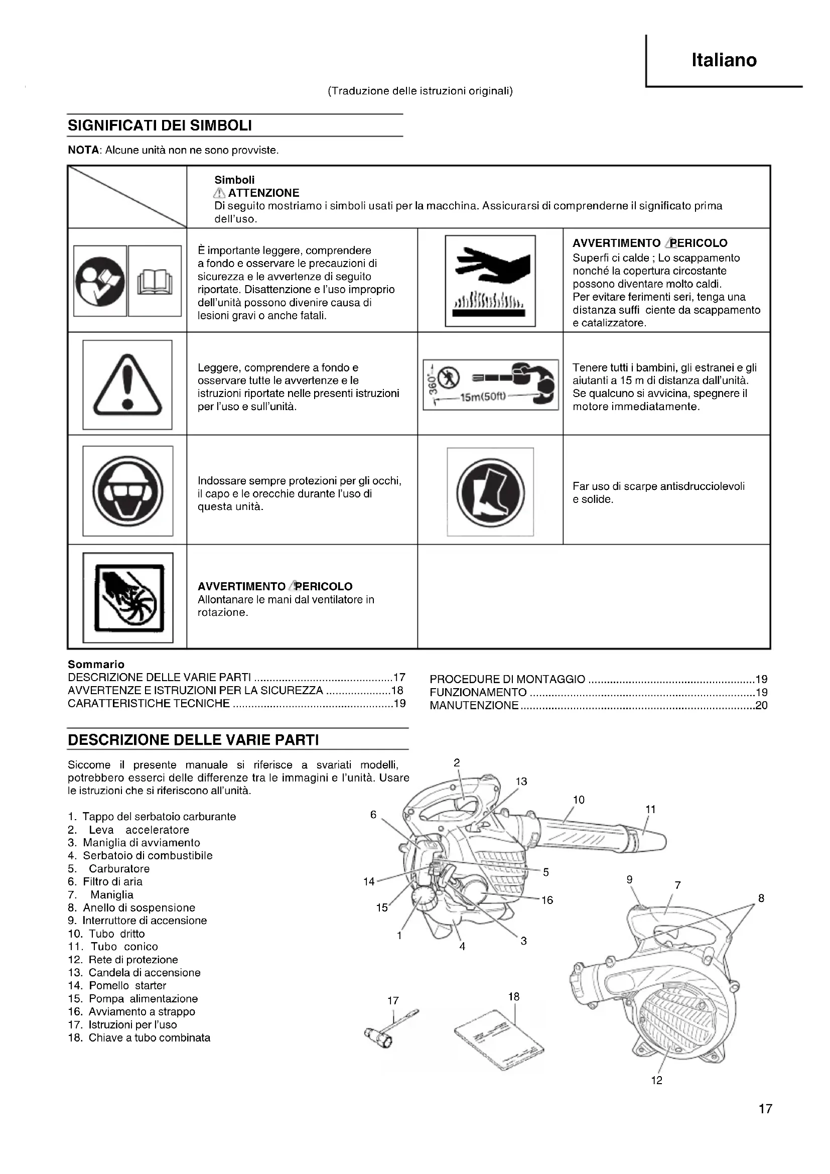 NOTA: Alcune unità non ne sono provviste. Simboli ATTENZIONE Di seguito mostriamo i simboli usati per la macchina. Assicurarsi di comprenderne il signifi cato prima dell’uso. È importante leggere, comprendere a fondo e osservare le precauzioni di sicurezza e le avvertenze di seguito riportate. Disattenzione e l’uso improprio dell’unità possono divenire causa di lesioni gravi o anche fatali. AVVERTIMENTO PERICOLO Superfi ci calde ; Lo scappamento nonché la copertura circostante possono diventare molto caldi. Per evitare ferimenti seri, tenga una distanza suffi ciente da scappamento e catalizzatore. Leggere, comprendere a fondo e osservare tutte le avvertenze e le istruzioni riportate nelle presenti istruzioni per l’uso e sull’unità. Tenere tutti i bambini, gli estranei e gli aiutanti a 15 m di distanza dall’unità. Se qualcuno si avvicina, spegnere il motore immediatamente. Indossare sempre protezioni per gli occhi, il capo e le orecchie durante l’uso di questa unità. Far uso di scarpe antisdrucciolevoli e solide. AVVERTIMENTO PERICOLO Allontanare le mani dal ventilatore in rotazione. Sommario