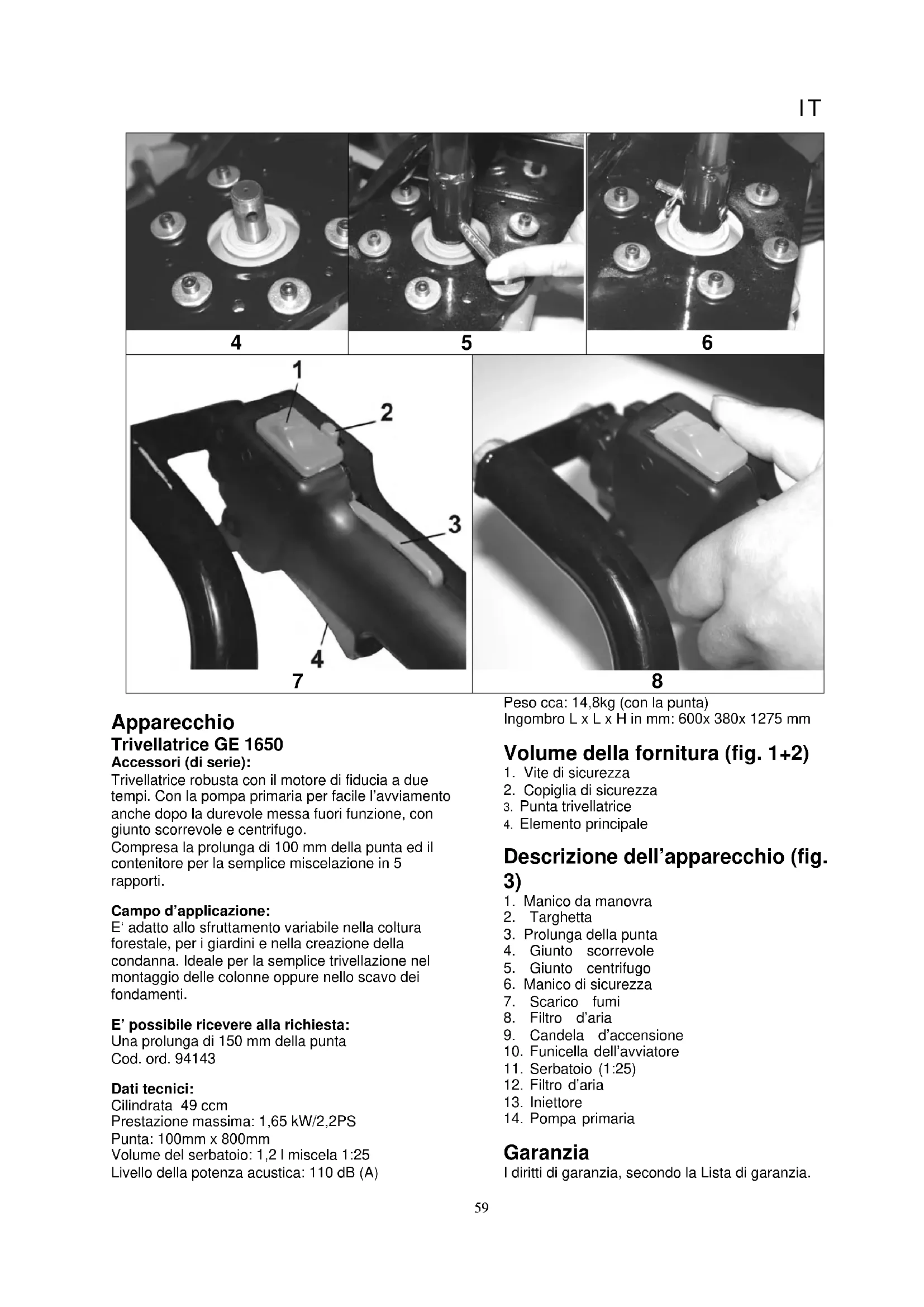 Apparecchio Trivellatrice GE 1650 Accessori (di serie): Trivellatrice robusta con il motore di fiducia a due tempi. Con la pompa primaria per facile l’avviamento anche dopo la durevole messa fuori funzione, con giunto scorrevole e centrifugo. Compresa la prolunga di 100 mm della punta ed il contenitore per la semplice miscelazione in 5 rapporti. Campo d’applicazione: E‘ adatto allo sfruttamento variabile nella coltura forestale, per i giardini e nella creazione della condanna. Ideale per la semplice trivellazione nel montaggio delle colonne oppure nello scavo dei fondamenti. E’ possibile ricevere alla richiesta: Una prolunga di 150 mm della punta Cod. ord. 94143 Dati tecnici: Cilindrata 49 ccm Prestazione massima: 1,65 kW/2,2PS Punta: 100mm x 800mm Volume del serbatoio: 1,2 l miscela 1:25 Livello della potenza acustica: 110 dB (A) Peso cca: 14,8kg (con la punta) Ingombro L x L x H in mm: 600x 380x 1275 mm Volume della fornitura (fig. 1+2)