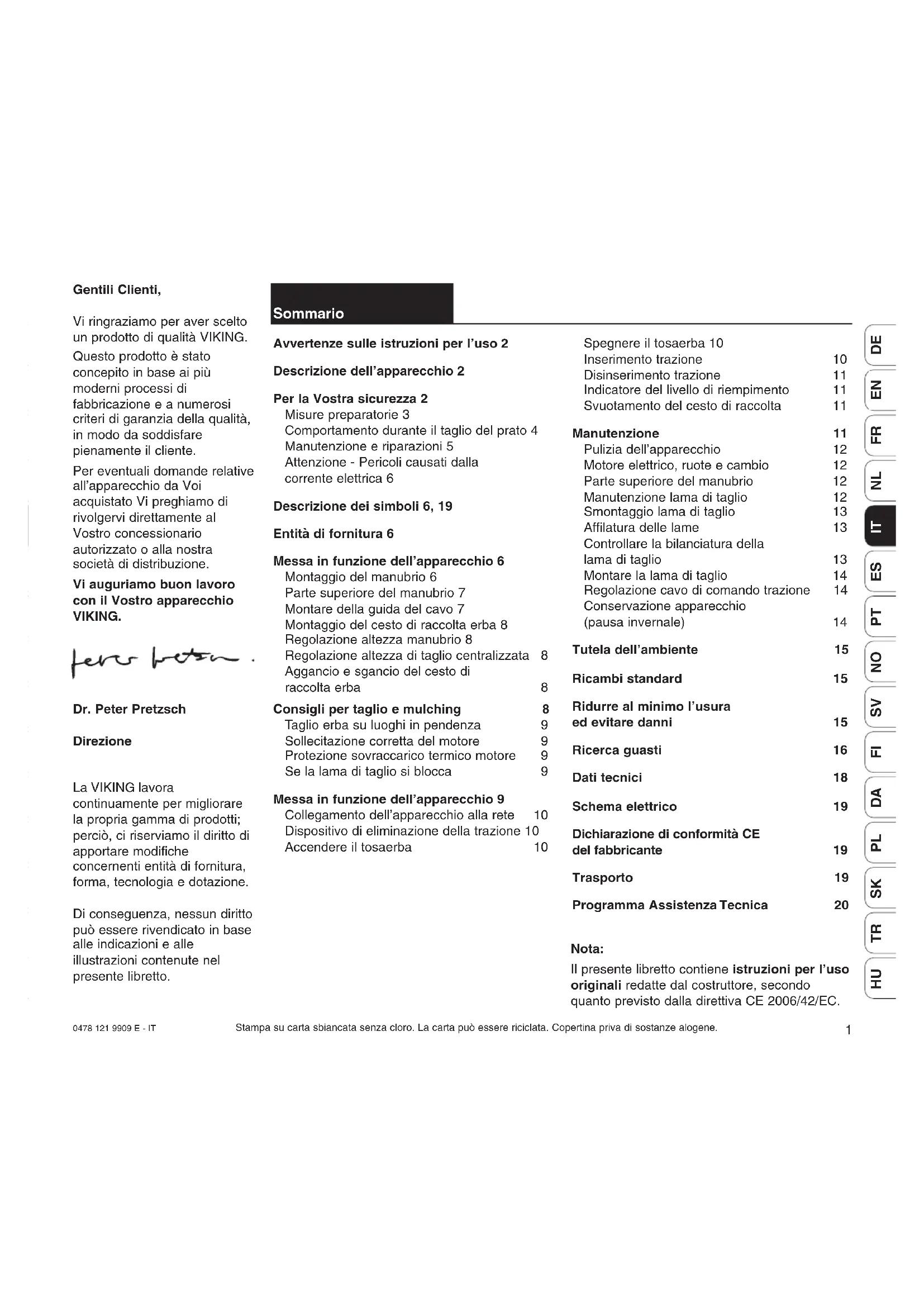Gentili Clienti, Vi ringraziamo per aver scelto un prodotto di qualità VIKING. Questo prodotto è stato concepito in base ai più moderni processi di fabbricazione e a numerosi criteri di garanzia della qualità, in modo da soddisfare pienamente il cliente. Per eventuali domande relative all’apparecchio da Voi acquistato Vi preghiamo di rivolgervi direttamente al Vostro concessionario autorizzato o alla nostra società di distribuzione. Vi auguriamo buon lavoro con il Vostro apparecchio VIKING. Dr. Peter Pretzsch Direzione La VIKING lavora continuamente per migliorare la propria gamma di prodotti; perciò, ci riserviamo il diritto di apportare modifiche concernenti entità di fornitura, forma, tecnologia e dotazione. Di conseguenza, nessun diritto può essere rivendicato in base alle indicazioni e alle illustrazioni contenute nel presente libretto. Sommario Avvertenze sulle istruzioni per l’uso 2 Descrizione dell’apparecchio 2 Per la Vostra sicurezza 2 Misure preparatorie 3 Comportamento durante il taglio del prato 4 Manutenzione e riparazioni 5 Attenzione - Pericoli causati dalla corrente elettrica 6 Descrizione dei simboli 6, 19 Entità di fornitura 6 Messa in funzione dell’apparecchio 6 Montaggio del manubrio 6 Parte superiore del manubrio 7 Montare della guida del cavo 7 Montaggio del cesto di raccolta erba 8 Regolazione altezza manubrio 8 Regolazione altezza di taglio centralizzata 8 Aggancio e sgancio del cesto di raccolta erba 8 Consigli per taglio e mulching 8 Taglio erba su luoghi in pendenza 9 Sollecitazione corretta del motore 9 Protezione sovraccarico termico motore 9 Se la lama di taglio si blocca 9 Messa in funzione dell’apparecchio 9 Collegamento dell’apparecchio alla rete 10 Dispositivo di eliminazione della trazione 10 Accendere il tosaerba 10 Spegnere il tosaerba 10 Inserimento trazione 10 Disinserimento trazione 11 Indicatore del livello di riempimento 11 Svuotamento del cesto di raccolta 11 Manutenzione 11 Pulizia dell’apparecchio 12 Motore elettrico, ruote e cambio 12 Parte superiore del manubrio 12 Manutenzione lama di taglio 12 Smontaggio lama di taglio 13 Affilatura delle lame 13 Controllare la bilanciatura della lama di taglio 13 Montare la lama di taglio 14 Regolazione cavo di comando trazione 14 Conservazione apparecchio (pausa invernale) 14 Tutela dell’ambiente 15 Ricambi standard 15 Ridurre al minimo l’usura ed evitare danni 15 Ricerca guasti 16 Dati tecnici 18 Schema elettrico 19 Dichiarazione di conformità CE del fabbricante 19 Trasporto 19 Programma Assistenza Tecnica 20