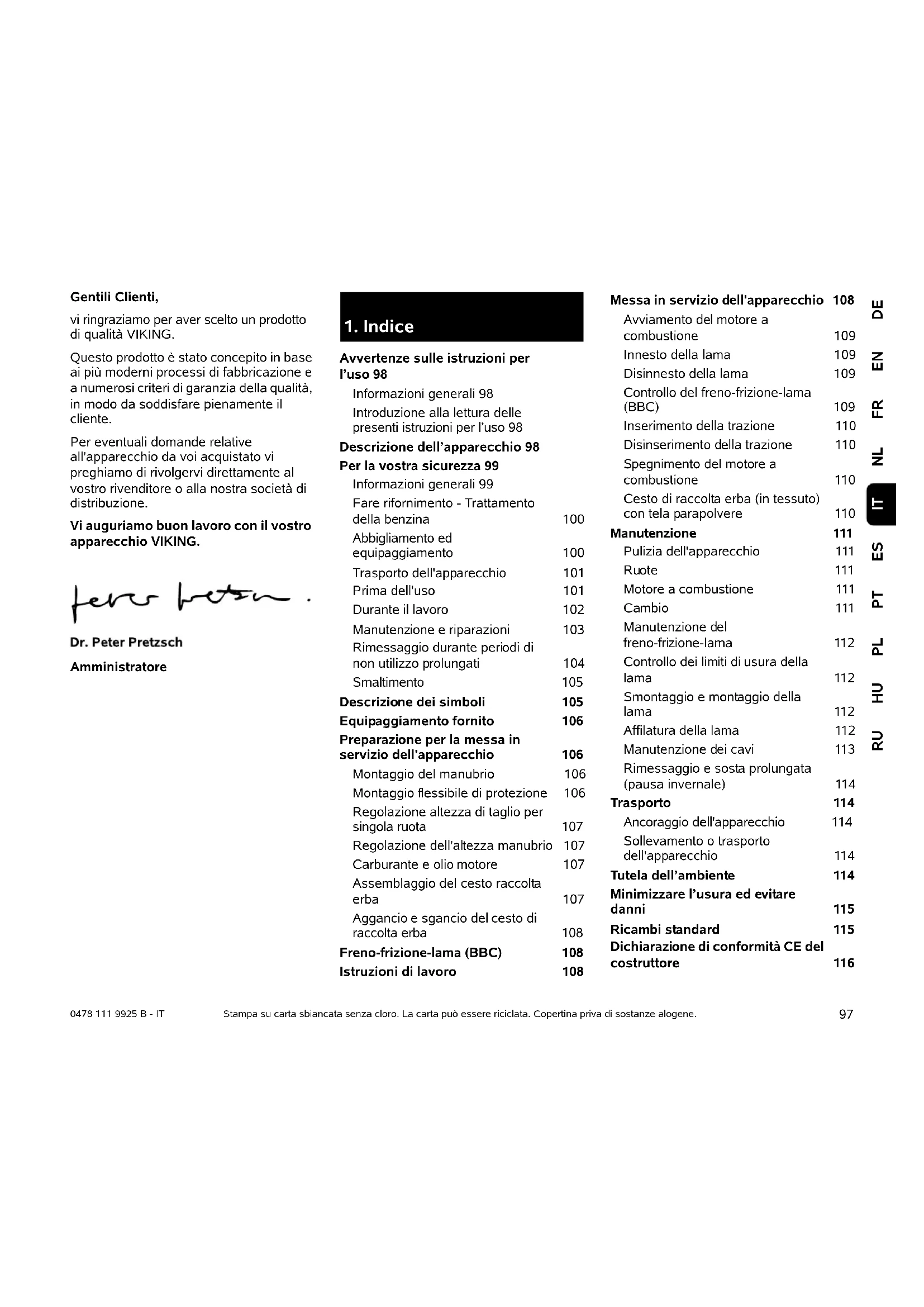 Avvertenze sulle istruzioni per l’uso 98 Informazioni generali 98 Introduzione alla lettura delle presenti istruzioni per l’uso 98 Descrizione dell’apparecchio 98 Per la vostra sicurezza 99 Informazioni generali 99 Fare rifornimento - Trattamento della benzina 100 Abbigliamento ed equipaggiamento 100 Trasporto dell'apparecchio 101 Prima dell'uso 101 Durante il lavoro 102 Manutenzione e riparazioni 103 Rimessaggio durante periodi di non utilizzo prolungati 104 Smaltimento 105 Descrizione dei simboli 105 Equipaggiamento fornito 106 Preparazione per la messa in servizio dell'apparecchio 106 Montaggio del manubrio 106 Montaggio flessibile di protezione 106 Regolazione altezza di taglio per singola ruota 107 Regolazione dell'altezza manubrio 107 Carburante e olio motore 107 Assemblaggio del cesto raccolta erba 107 Aggancio e sgancio del cesto di raccolta erba 108 Freno-frizione-lama (BBC) 108 Istruzioni di lavoro 108 Messa in servizio dell'apparecchio 108 Avviamento del motore a combustione 109 Innesto della lama 109 Disinnesto della lama 109 Controllo del freno-frizione-lama (BBC) 109 Inserimento della trazione 110 Disinserimento della trazione 110 Spegnimento del motore a combustione 110 Cesto di raccolta erba (in tessuto) con tela parapolvere 110 Manutenzione 111 Pulizia dell'apparecchio 111 Ruote 111 Motore a combustione 111 Cambio 111 Manutenzione del freno-frizione-lama 112 Controllo dei limiti di usura della lama 112 Smontaggio e montaggio della lama 112 Affilatura della lama 112 Manutenzione dei cavi 113 Rimessaggio e sosta prolungata (pausa invernale) 114 Trasporto 114 Ancoraggio dell'apparecchio 114 Sollevamento o trasporto dell'apparecchio 114 Tutela dell’ambiente 114 Minimizzare l’usura ed evitare danni 115 Ricambi standard 115 Dichiarazione di conformità CE del costruttore 1160478 111 9925 B - IT