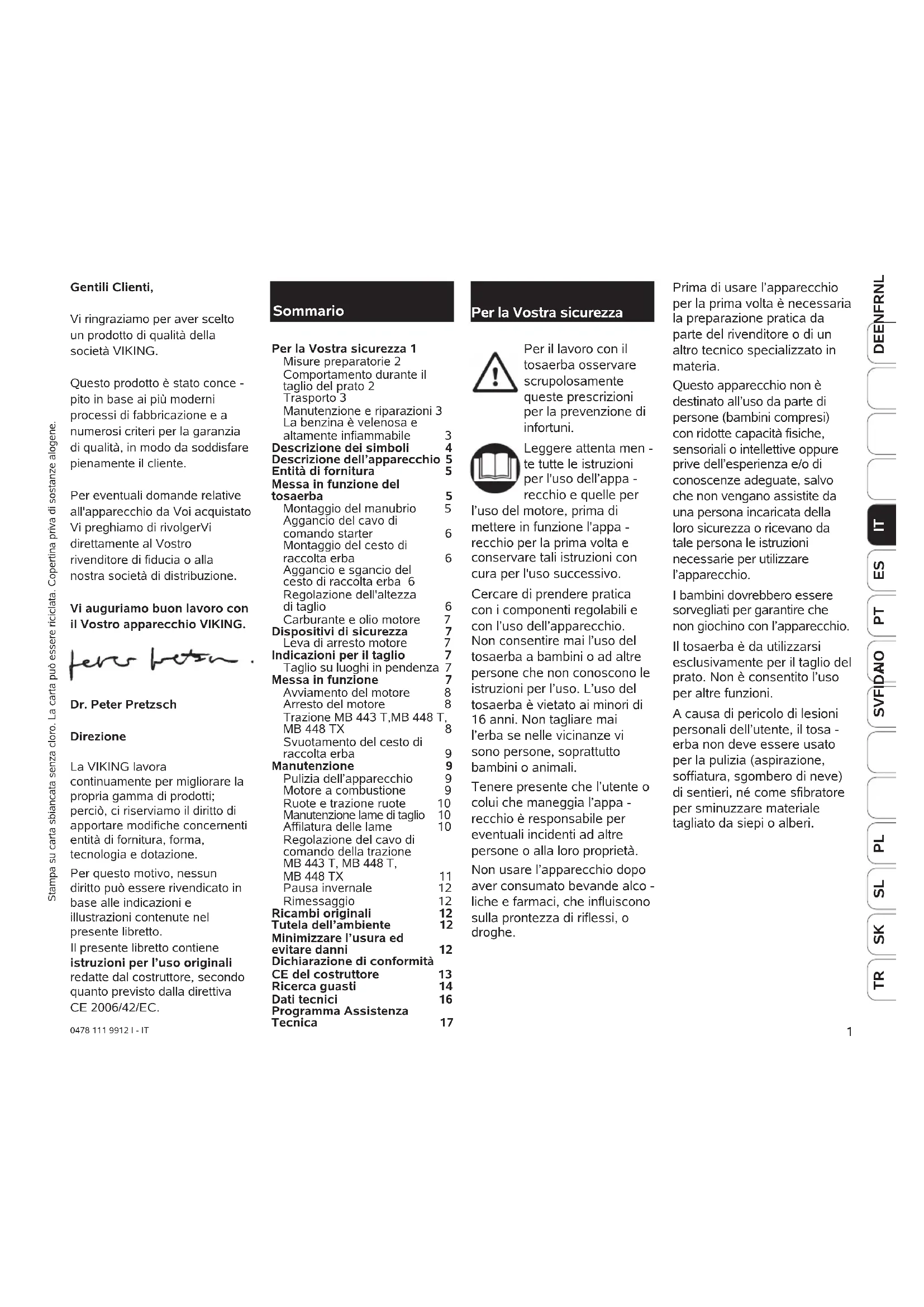 Per il lavoro con il tosaerba osservare scrupolosamente queste prescrizioni per la prevenzione di infortuni. Leggere attenta men - te tutte le istruzioni per l'uso dell’appa - recchio e quelle per l’uso del motore, prima di mettere in funzione l'appa - recchio per la prima volta e conservare tali istruzioni con cura per l'uso successivo. Cercare di prendere pratica con i componenti regolabili e con l’uso dell’apparecchio. Non consentire mai l’uso del tosaerba a bambini o ad altre persone che non conoscono le istruzioni per l’uso. L’uso del tosaerba è vietato ai minori di 16 anni. Non tagliare mai l’erba se nelle vicinanze vi sono persone, soprattutto bambini o animali. Tenere presente che l’utente o colui che maneggia l’appa - recchio è responsabile per eventuali incidenti ad altre persone o alla loro proprietà. Non usare l’apparecchio dopo aver consumato bevande alco - liche e farmaci, che influiscono sulla prontezza di riflessi, o droghe. Gentili Clienti, Vi ringraziamo per aver scelto un prodotto di qualità della società VIKING. Questo prodotto è stato conce - pito in base ai più moderni processi di fabbricazione e a numerosi criteri per la garanzia di qualità, in modo da soddisfare pienamente il cliente. Per eventuali domande relative all'apparecchio da Voi acquistato Vi preghiamo di rivolgerVi direttamente al Vostro rivenditore di fiducia o alla nostra società di distribuzione. Vi auguriamo buon lavoro con il Vostro apparecchio VIKING. Dr. Peter Pretzsch Direzione La VIKING lavora continuamente per migliorare la propria gamma di prodotti; perciò, ci riserviamo il diritto di apportare modifiche concernenti entità di fornitura, forma, tecnologia e dotazione. Per questo motivo, nessun diritto può essere rivendicato in base alle indicazioni e illustrazioni contenute nel presente libretto. Il presente libretto contiene istruzioni per l’uso originali redatte dal costruttore, secondo quanto previsto dalla direttiva CE 2006/42/EC. Sommario Per la Vostra sicurezza 1 Misure preparatorie 2 Comportamento durante il taglio del prato 2 Trasporto 3 Manutenzione e riparazioni 3 La benzina è velenosa e altamente infiammabile 3 Descrizione dei simboli 4 Descrizione dell’apparecchio 5 Entità di fornitura 5 Messa in funzione del tosaerba 5 Montaggio del manubrio 5 Aggancio del cavo di comando starter 6 Montaggio del cesto di raccolta erba 6 Aggancio e sgancio del cesto di raccolta erba 6 Regolazione dell'altezza di taglio 6 Carburante e olio motore 7 Dispositivi di sicurezza 7 Leva di arresto motore 7 Indicazioni per il taglio 7 Taglio su luoghi in pendenza 7 Messa in funzione 7 Avviamento del motore 8 Arresto del motore 8 Trazione MB 443 T,MB 448 T, MB 448 TX 8 Svuotamento del cesto di raccolta erba 9 Manutenzione 9 Pulizia dell’apparecchio 9 Motore a combustione 9 Ruote e trazione ruote 10 Manutenzione lame di taglio 10 Affilatura delle lame 10 Regolazione del cavo di comando della trazione MB 443 T, MB 448 T, MB 448 TX 11 Pausa invernale 12 Rimessaggio 12 Ricambi originali 12 Tutela dell’ambiente 12 Minimizzare l’usura ed evitare danni 12 Dichiarazione di conformità CE del costruttore 13 Ricerca guasti 14 Dati tecnici 16 Programma Assistenza Tecnica 17 Per la Vostra sicurezza Prima di usare l’apparecchio per la prima volta è necessaria la preparazione pratica da parte del rivenditore o di un altro tecnico specializzato in materia. Questo apparecchio non è destinato all’uso da parte di persone (bambini compresi) con ridotte capacità fisiche, sensoriali o intellettive oppure prive dell’esperienza e/o di conoscenze adeguate, salvo che non vengano assistite da una persona incaricata della loro sicurezza o ricevano da tale persona le istruzioni necessarie per utilizzare l’apparecchio. I bambini dovrebbero essere sorvegliati per garantire che non giochino con l’apparecchio. Il tosaerba è da utilizzarsi esclusivamente per il taglio del prato. Non è consentito l’uso per altre funzioni. A causa di pericolo di lesioni personali dell’utente, il tosa - erba non deve essere usato per la pulizia (aspirazione, soffiatura, sgombero di neve) di sentieri, né come sfibratore per sminuzzare materiale tagliato da siepi o alberi. Stampa su carta sbiancata senza cloro. La carta può essere riciclata. Copertina priva di sostanze alogene.2 0478 111 9912 I - IT