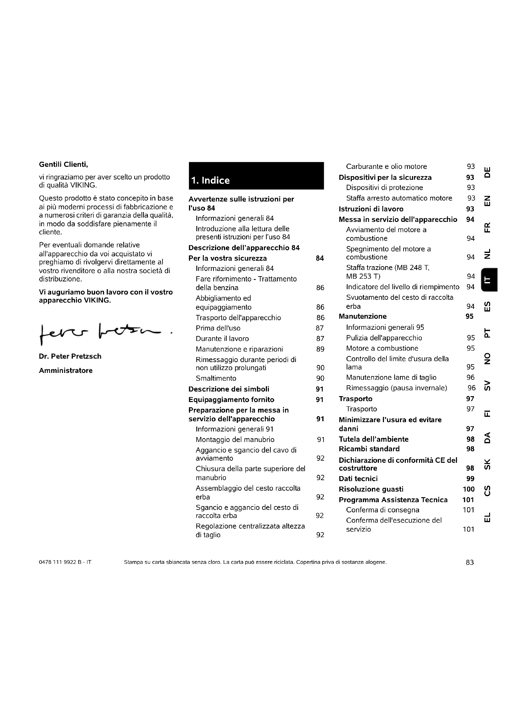 Avvertenze sulle istruzioni per l’uso 84 Informazioni generali 84 Introduzione alla lettura delle presenti istruzioni per l’uso 84 Descrizione dell’apparecchio 84 Per la vostra sicurezza 84 Informazioni generali 84 Fare rifornimento - Trattamento della benzina 86 Abbigliamento ed equipaggiamento 86 Trasporto dell'apparecchio 86 Prima dell'uso 87 Durante il lavoro 87 Manutenzione e riparazioni 89 Rimessaggio durante periodi di non utilizzo prolungati 90 Smaltimento 90 Descrizione dei simboli 91 Equipaggiamento fornito 91 Preparazione per la messa in servizio dell'apparecchio 91 Informazioni generali 91 Montaggio del manubrio 91 Aggancio e sgancio del cavo di avviamento 92 Chiusura della parte superiore del manubrio 92 Assemblaggio del cesto raccolta erba 92 Sgancio e aggancio del cesto di raccolta erba 92 Regolazione centralizzata altezza di taglio 92 Carburante e olio motore 93 Dispositivi per la sicurezza 93 Dispositivi di protezione 93 Staffa arresto automatico motore 93 Istruzioni di lavoro 93 Messa in servizio dell'apparecchio 94 Avviamento del motore a combustione 94 Spegnimento del motore a combustione 94 Staffa trazione (MB 248 T, MB 253 T) 94 Indicatore del livello di riempimento 94 Svuotamento del cesto di raccolta erba 94 Manutenzione 95 Informazioni generali 95 Pulizia dell'apparecchio 95 Motore a combustione 95 Controllo del limite d'usura della lama 95 Manutenzione lame di taglio 96 Rimessaggio (pausa invernale) 96 Trasporto 97 Trasporto 97 Minimizzare l’usura ed evitare danni 97 Tutela dell’ambiente 98 Ricambi standard 98 Dichiarazione di conformità CE del costruttore 98 Dati tecnici 99 Risoluzione guasti 100 Programma Assistenza Tecnica 101 Conferma di consegna 101 Conferma dell'esecuzione del servizio 1010478 111 9922 B - IT