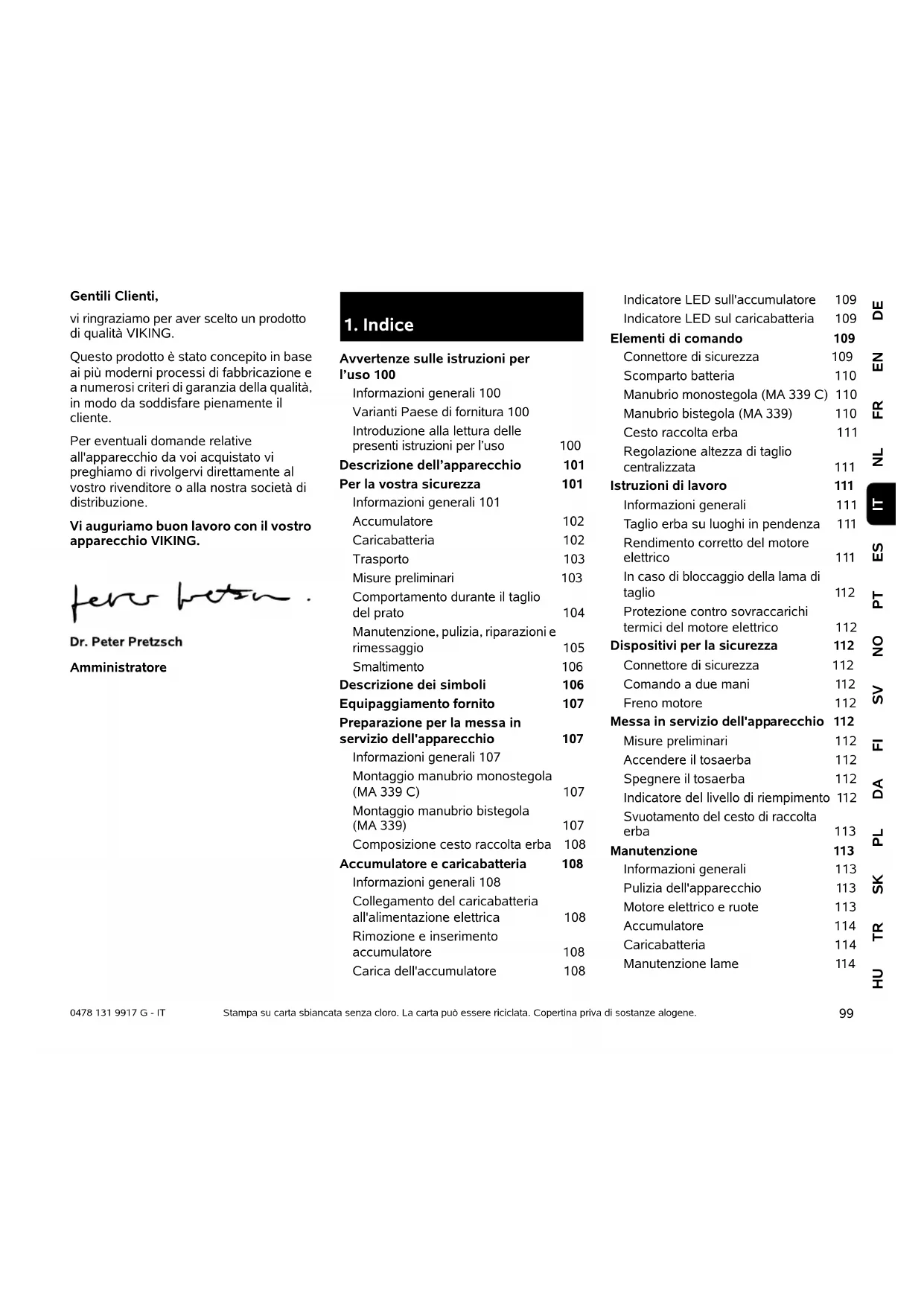Avvertenze sulle istruzioni per l’uso 100 Informazioni generali 100 Varianti Paese di fornitura 100 Introduzione alla lettura delle presenti istruzioni per l’uso 100 Descrizione dell’apparecchio 101 Per la vostra sicurezza 101 Informazioni generali 101 Accumulatore 102 Caricabatteria 102 Trasporto 103 Misure preliminari 103 Comportamento durante il taglio del prato 104 Manutenzione, pulizia, riparazioni e rimessaggio 105 Smaltimento 106 Descrizione dei simboli 106 Equipaggiamento fornito 107 Preparazione per la messa in servizio dell'apparecchio 107 Informazioni generali 107 Montaggio manubrio monostegola (MA 339 C) 107 Montaggio manubrio bistegola (MA 339) 107 Composizione cesto raccolta erba 108 Accumulatore e caricabatteria 108 Informazioni generali 108 Collegamento del caricabatteria all'alimentazione elettrica 108 Rimozione e inserimento accumulatore 108 Carica dell'accumulatore 108 Indicatore LED sull'accumulatore 109 Indicatore LED sul caricabatteria 109 Elementi di comando 109 Connettore di sicurezza 109 Scomparto batteria 110 Manubrio monostegola (MA 339 C) 110 Manubrio bistegola (MA 339) 110 Cesto raccolta erba 111 Regolazione altezza di taglio centralizzata 111 Istruzioni di lavoro 111 Informazioni generali 111 Taglio erba su luoghi in pendenza 111 Rendimento corretto del motore elettrico 111 In caso di bloccaggio della lama di taglio 112 Protezione contro sovraccarichi termici del motore elettrico 112 Dispositivi per la sicurezza 112 Connettore di sicurezza 112 Comando a due mani 112 Freno motore 112 Messa in servizio dell'apparecchio 112 Misure preliminari 112 Accendere il tosaerba 112 Spegnere il tosaerba 112 Indicatore del livello di riempimento 112 Svuotamento del cesto di raccolta erba 113 Manutenzione 113 Informazioni generali 113 Pulizia dell'apparecchio 113 Motore elettrico e ruote 113 Accumulatore 114 Caricabatteria 114 Manutenzione lame 1140478 131 9917 G - IT
