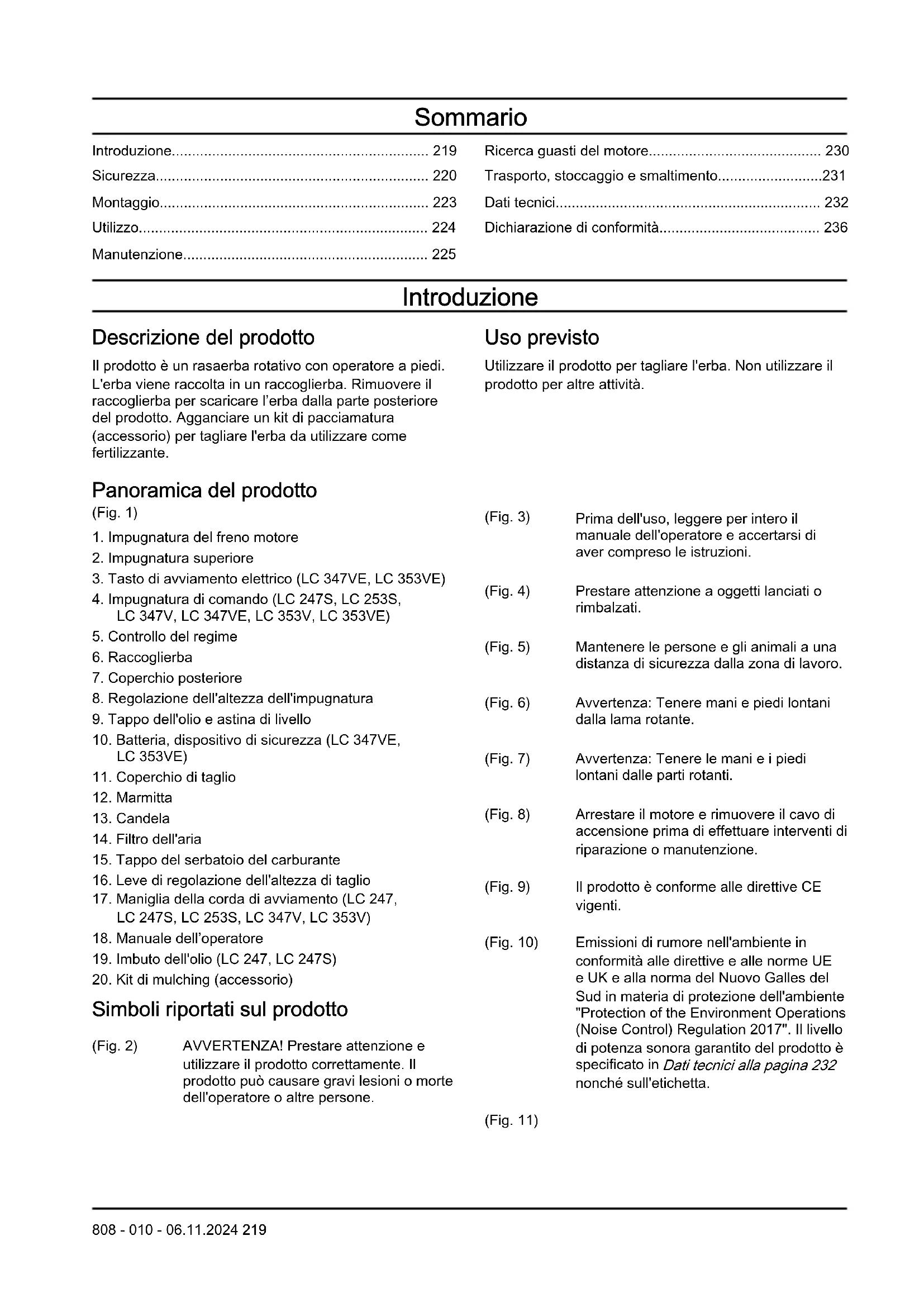Simboli riportati sul prodotto (Fig. 2) AVVERTENZA! Prestare attenzione e utilizzare il prodotto correttamente. Il prodotto può causare gravi lesioni o morte dell'operatore o altre persone. (Fig. 3) Prima dell'uso, leggere per intero il manuale dell'operatore e accertarsi di aver compreso le istruzioni. (Fig. 4) Prestare attenzione a oggetti lanciati o rimbalzati. (Fig. 5) Mantenere le persone e gli animali a una distanza di sicurezza dalla zona di lavoro. (Fig. 6) Avvertenza: Tenere mani e piedi lontani dalla lama rotante. (Fig. 7) Avvertenza: Tenere le mani e i piedi lontani dalle parti rotanti. (Fig. 8) Arrestare il motore e rimuovere il cavo di accensione prima di effettuare interventi di riparazione o manutenzione. (Fig. 9) Il prodotto è conforme alle direttive CE vigenti. (Fig. 10) Emissioni di rumore nell'ambiente in conformità alle direttive e alle norme UE e UK e alla norma del Nuovo Galles del Sud in materia di protezione dell'ambiente "Protection of the Environment Operations (Noise Control) Regulation 2017". Il livello di potenza sonora garantito del prodotto è specificato in Dati tecnici alla pagina 232 nonché sull'etichetta. (Fig. 11)
