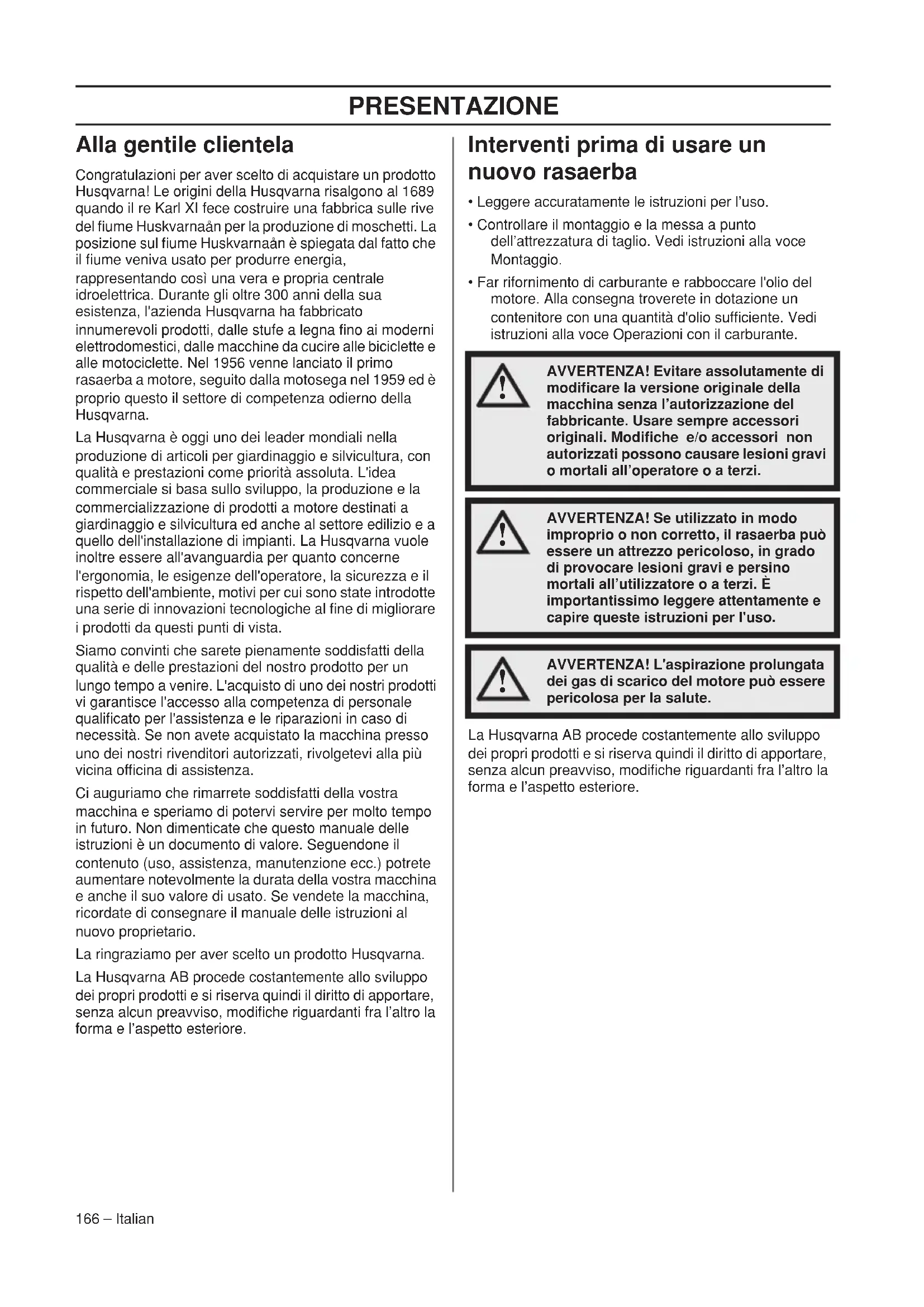 - Dichiarazione di conformità CE PRESENTAZIONE 166 – Italian Alla gentile clientela Congratulazioni per aver scelto di acquistare un prodotto Husqvarna! Le origini della Husqvarna risalgono al 1689 quando il re Karl XI fece costruire una fabbrica sulle rive del fiume Huskvarnaån per la produzione di moschetti. La posizione sul fiume Huskvarnaån è spiegata dal fatto che il fiume veniva usato per produrre energia, rappresentando così una vera e propria centrale idroelettrica. Durante gli oltre 300 anni della sua esistenza, l'azienda Husqvarna ha fabbricato innumerevoli prodotti, dalle stufe a legna fino ai moderni elettrodomestici, dalle macchine da cucire alle biciclette e alle motociclette. Nel 1956 venne lanciato il primo rasaerba a motore, seguito dalla motosega nel 1959 ed è proprio questo il settore di competenza odierno della Husqvarna. La Husqvarna è oggi uno dei leader mondiali nella produzione di articoli per giardinaggio e silvicultura, con qualità e prestazioni come priorità assoluta. L'idea commerciale si basa sullo sviluppo, la produzione e la commercializzazione di prodotti a motore destinati a giardinaggio e silvicultura ed anche al settore edilizio e a quello dell'installazione di impianti. La Husqvarna vuole inoltre essere all'avanguardia per quanto concerne l'ergonomia, le esigenze dell'operatore, la sicurezza e il rispetto dell'ambiente, motivi per cui sono state introdotte una serie di innovazioni tecnologiche al fine di migliorare i prodotti da questi punti di vista. Siamo convinti che sarete pienamente soddisfatti della qualità e delle prestazioni del nostro prodotto per un lungo tempo a venire. L'acquisto di uno dei nostri prodotti vi garantisce l'accesso alla competenza di personale qualificato per l'assistenza e le riparazioni in caso di necessità. Se non avete acquistato la macchina presso uno dei nostri rivenditori autorizzati, rivolgetevi alla più vicina officina di assistenza. Ci auguriamo che rimarrete soddisfatti della vostra macchina e speriamo di potervi servire per molto tempo in futuro. Non dimenticate che questo manuale delle istruzioni è un documento di valore. Seguendone il contenuto (uso, assistenza, manutenzione ecc.) potrete aumentare notevolmente la durata della vostra macchina e anche il suo valore di usato. Se vendete la macchina, ricordate di consegnare il manuale delle istruzioni al nuovo proprietario. La ringraziamo per aver scelto un prodotto Husqvarna. La Husqvarna AB procede costantemente allo sviluppo dei propri prodotti e si riserva quindi il diritto di apportare, senza alcun preavviso, modifiche riguardanti fra l’altro la forma e l’aspetto esteriore. Interventi prima di usare un nuovo rasaerba p. 181