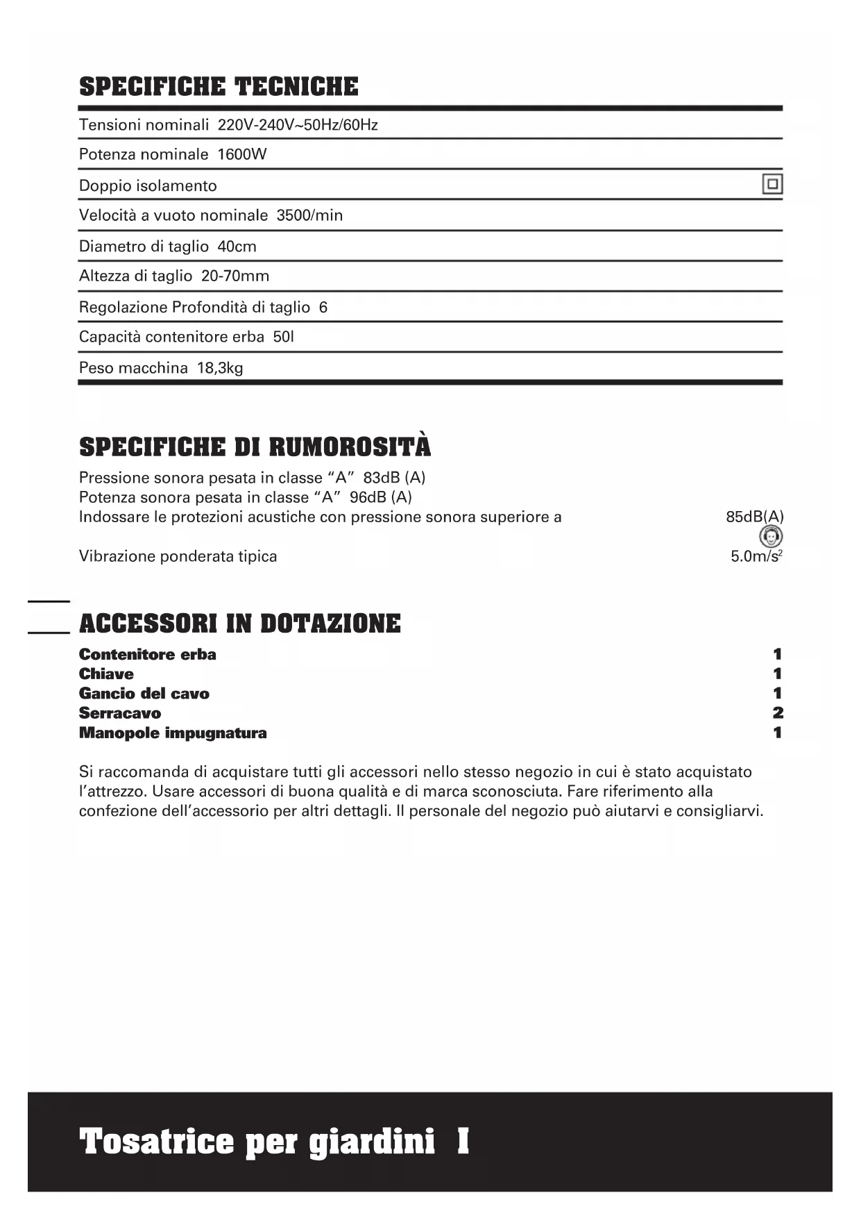 SPECIFICHE TECNICHE Tensioni nominali 220V-240V~50Hz/60Hz Potenza nominale 1600W Doppio isolamento Velocità a vuoto nominale 3500/min Diametro di taglio 40cm Altezza di taglio 20-70mm Regolazione Profondità di taglio 6 Capacità contenitore erba 50l Peso macchina 18,3kg
