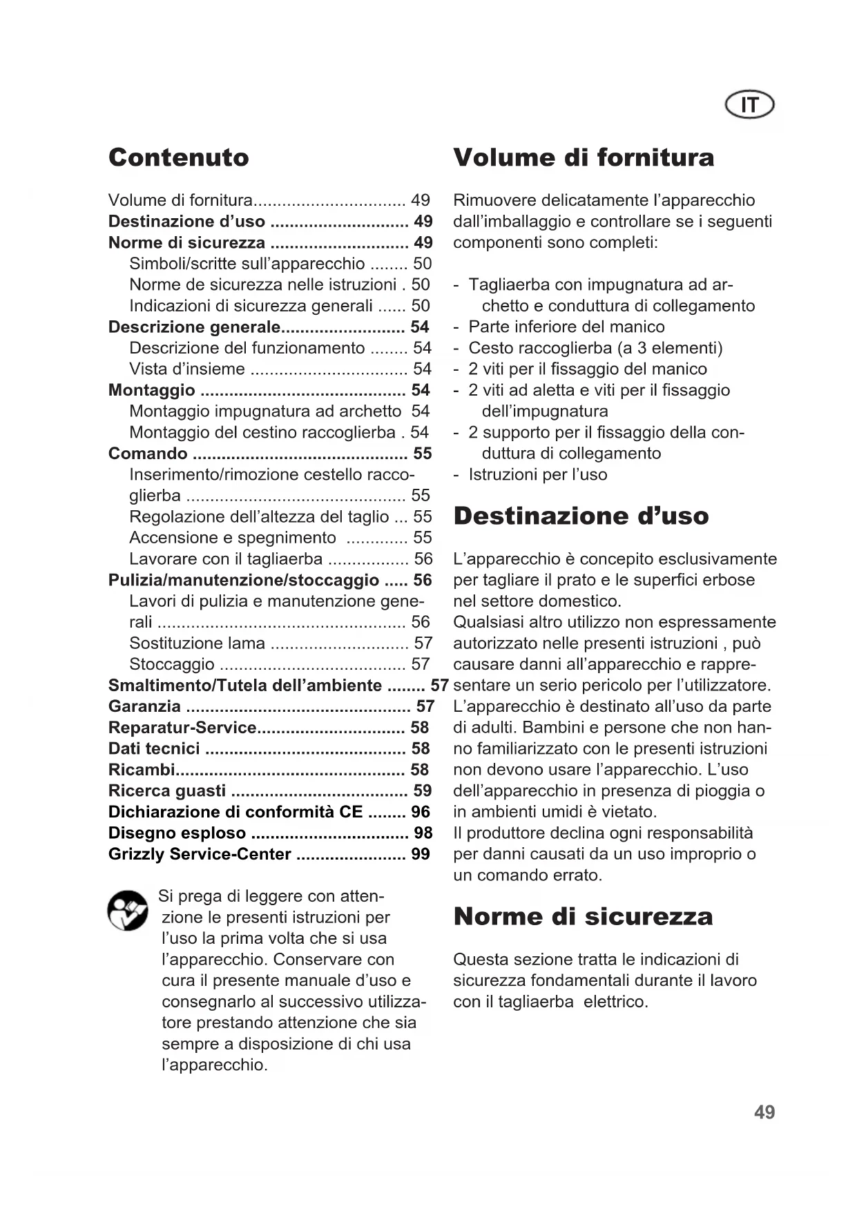 - Grizzly Service-Center Si prega di leggere con atten- zione le presenti istruzioni per l’uso la prima volta che si usa l’apparecchio. Conservare con cura il presente manuale d’uso e consegnarlo al successivo utilizza- tore prestando attenzione che sia sempre a disposizione di chi usa l’apparecchio. Volume di fornitura Rimuovere delicatamente l’apparecchio dall’imballaggio e controllare se i seguenti componenti sono completi: - Tagliaerba con impugnatura ad ar- chetto e conduttura di collegamento - Parte inferiore del manico - Cesto raccoglierba (a 3 elementi) - 2 viti per il ssaggio del manico - 2 viti ad aletta e viti per il ssaggio dell’impugnatura - 2 supporto per il ssaggio della con- duttura di collegamento - Istruzioni per l’uso Destinazione d’uso L’apparecchio è concepito esclusivamente per tagliare il prato e le superci erbose nel settore domestico. Qualsiasi altro utilizzo non espressamente autorizzato nelle presenti istruzioni , può causare danni all’apparecchio e rappre- sentare un serio pericolo per l’utilizzatore. L’apparecchio è destinato all’uso da parte di adulti. Bambini e persone che non han- no familiarizzato con le presenti istruzioni non devono usare l’apparecchio. L’uso dell’apparecchio in presenza di pioggia o in ambienti umidi è vietato. Il produttore declina ogni responsabilità per danni causati da un uso improprio o un comando errato. Norme di sicurezza Questa sezione tratta le indicazioni di sicurezza fondamentali durante il lavoro con il tagliaerba elettrico.IT p. 99