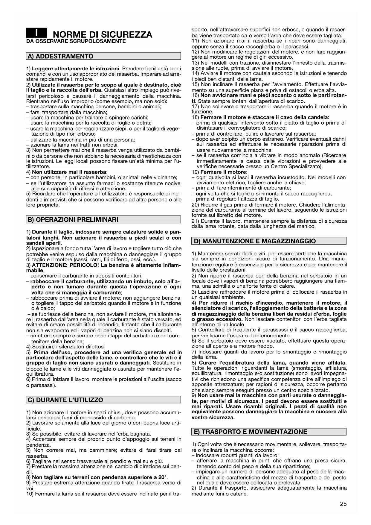 Ogni tipologia di erba presenta caratteristiche diverse e può richiedere quindi diverse modalità per la cura del prato; leggere sempre le indicazioni contenute nelle confezioni delle sementi riguardo l’altezza di rasatura, rapportate alle condizioni di crescita della zona in cui si opera. Occorre tenere presente che la maggior parte dell’erba è composta da uno stelo e da una o più foglie. Se le foglie vengono tagliate completamente, il prato si danneggia e la ricrescita sarà più difficile. In linea generale, possono valere le seguenti indicazioni: – un taglio troppo basso provoca strappi e diradamenti nel tappeto erboso, con un aspetto “a macchie”; – in estate, il taglio deve essere più alto per evitare il dis- seccamento del terreno; – non tagliare l’erba quando è bagnata; ciò può ridurre l’ef- ficienza della lama per l’erba che vi si attacca e provo- care strappi nel tappeto erboso; – nel caso di erba particolarmente alta, è bene eseguire una prima rasatura alla massima altezza consentita dalla macchina, seguita da una seconda rasatura a distanza di due o tre giorni. Al termine del lavoro, rilasciare la leva (1) del freno e scollegare il cappuccio della candela (2). ATTENDERE L’ARRESTO DELLA LAMA prima di effettuare qualsiasi tipo di intervento IMPORTANTE – La manutenzione regolare e accurata è indispensabile per mantenere nel tempo i livelli di sicu- rezza e le prestazioni originali della macchina. Conservare il rasaerba in luogo asciutto.