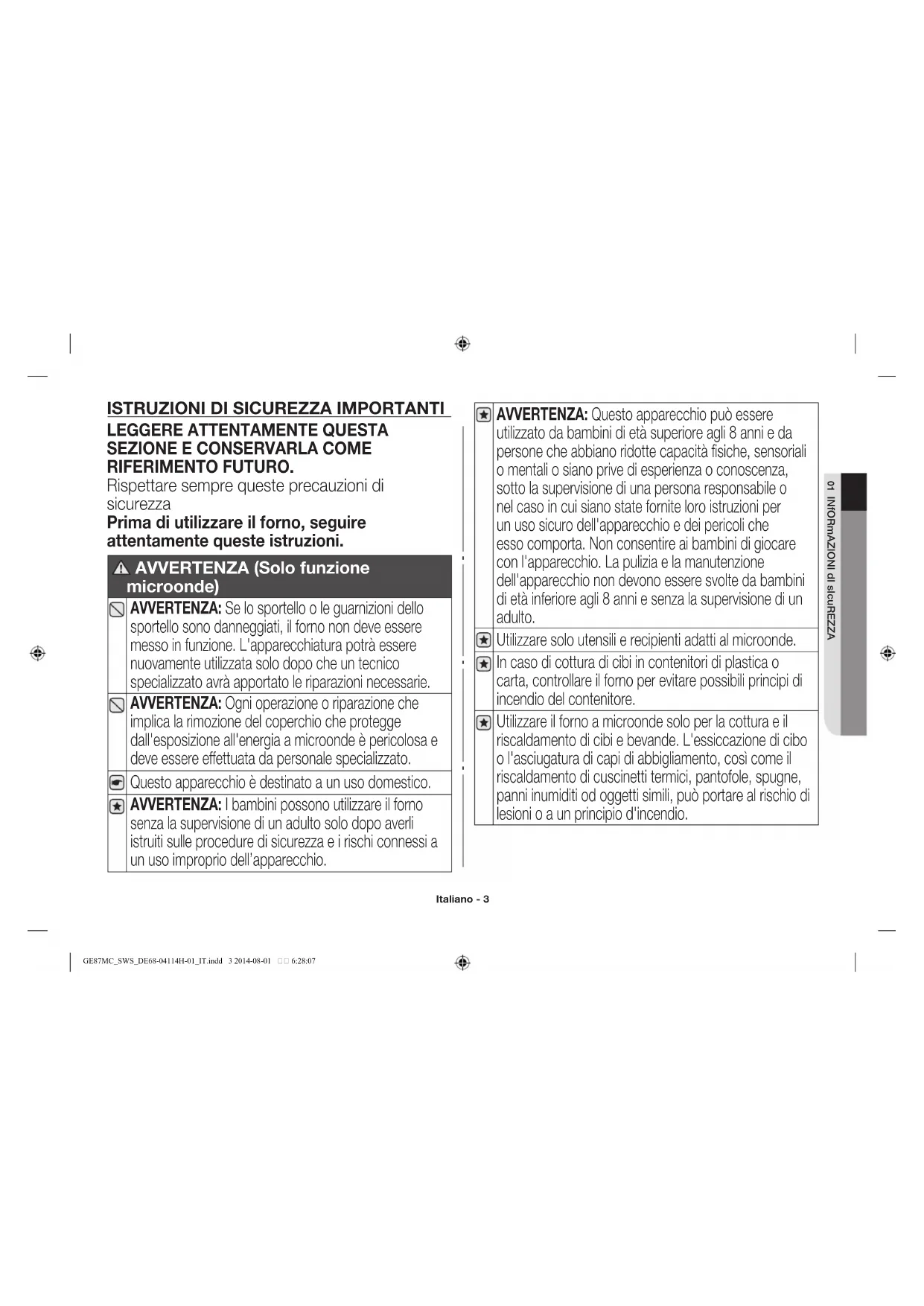 RIFERIMENTO FUTURO. Rispettare sempre queste precauzioni di sicurezza Prima di utilizzare il forno, seguire attentamente queste istruzioni. AVVERTENZA (Solo funzione microonde) AVVERTENZA: Se lo sportello o le guarnizioni dello sportello sono danneggiati, il forno non deve essere messo in funzione. L'apparecchiatura potrà essere nuovamente utilizzata solo dopo che un tecnico specializzato avrà apportato le riparazioni necessarie. AVVERTENZA: Ogni operazione o riparazione che implica la rimozione del coperchio che protegge dall'esposizione all'energia a microonde è pericolosa e deve essere eettuata da personale specializzato. Questo apparecchio è destinato a un uso domestico. AVVERTENZA: I bambini possono utilizzare il forno senza la supervisione di un adulto solo dopo averli istruiti sulle procedure di sicurezza e i rischi connessi a un uso improprio dell’apparecchio. AVVERTENZA: Questo apparecchio può essere utilizzato da bambini di età superiore agli 8 anni e da persone che abbiano ridotte capacità fisiche, sensoriali o mentali o siano prive di esperienza o conoscenza, sotto la supervisione di una persona responsabile o nel caso in cui siano state fornite loro istruzioni per un uso sicuro dell'apparecchio e dei pericoli che esso comporta. Non consentire ai bambini di giocare con l'apparecchio. La pulizia e la manutenzione dell'apparecchio non devono essere svolte da bambini di età inferiore agli 8 anni e senza la supervisione di un adulto. Utilizzare solo utensili e recipienti adatti al microonde. In caso di cottura di cibi in contenitori di plastica o carta, controllare il forno per evitare possibili principi di incendio del contenitore. Utilizzare il forno a microonde solo per la cottura e il riscaldamento di cibi e bevande. L'essiccazione di cibo o l'asciugatura di capi di abbigliamento, così come il riscaldamento di cuscinetti termici, pantofole, spugne, panni inumiditi od oggetti simili, può portare al rischio di lesioni o a un principio d'incendio. GE87MC_SWS_DE68-04114H-01_IT.indd 3 2014-08-01 6:28:07Italiano - 4 In caso di fumo, spegnere o scollegare l’apparecchiatura dalla rete elettrica e tenere chiuso lo sportello del forno per evitare di far propagare eventuali fiamme. AVVERTENZA: Il riscaldamento di bevande nel microonde può causare una bollitura ritardata, prestare quindi attenzione durante la manipolazione del contenitore; AVVERTENZA:Perevitarescottature,primadella somministrazione il contenuto di biberon e vasetti di alimenti per bambini deve essere agitato o mescolato e la temperatura controllata. Non cuocere mai le uova con il guscio e non scaldare mai le uova sode con il guscio; potrebbero esplodere, perfino al termine del riscaldamento nel microonde. Pulireilfornoregolarmentefacendoattenzionea rimuovere ogni residuo di cibo. Se il forno non viene mantenuto in condizioni di pulizia ottimali, la superficie potrebbe deteriorarsi danneggiando l’apparecchiatura e provocando eventuali situazioni pericolose. L'apparecchio non è inteso per l'installazione su veicoli, caravan o simili. Questo apparecchio non è inteso per l’uso da parte di persone (bambini inclusi) che abbiano ridotte capacità fisiche, sensoriali o mentali, o siano prive di esperienza o conoscenza, a meno che siano state fornite loro istruzioni per l’uso da parte di una persona responsabile della loro sicurezza o che sovrintenda all'uso dell'apparecchio. Controllarecheibambininongiochinoconquesto apparecchio. Se il cavo di alimentazione è danneggiato, richiederne la sostituzione al costruttore, al centro assistenza o a un tecnico qualificato per evitare di incorrere in eventuali pericoli. AVVERTENZA: Liquidi e altri alimenti non devono essere riscaldati all'interno di contenitori sigillati poiché potrebbero esplodere; Non pulire l’apparecchiatura usando getti d’acqua. Posizionareilfornoinunadirezioneeaun'altezzatali da permettere un facile accesso alla cavità del forno e all'area di controllo. Primadiutilizzareilfornoperlaprimavolta,attivarloper 10 minuti collocando all'interno un contenitore d'acqua. GE87MC_SWS_DE68-04114H-01_IT.indd 4 2014-08-01 6:28:07Italiano - 5 01 INfORmAZIONI dI sIcuREZZA Se l'apparecchio emette un rumore anomalo, odore di bruciato o fumo, scollegare immediatamente la spina di alimentazione e rivolgersi al più vicino centro assistenza. Il forno a microonde deve essere posizionato in modo che la presa sia accessibile. L'installazione del forno a microonde è consentita solo su un banco o un piano di lavoro. Non è consentita l'installazione a incasso. AVVERTENZA (Solo funzione forno) - Opzionale AVVERTENZA: Quando l’apparecchio viene utilizzato in modalità combinata, consentire ai bambini di utilizzare il forno solo in presenza di un adulto a causa delle alte temperature generate. Durantel’usol’apparecchiaturadiventacalda.Prestare attenzione a non toccare gli elementi riscaldanti all’interno del forno. AVVERTENZA: Durante l’uso le parti accessibili possono diventare calde. Tenere i bambini lontano dall’apparecchio. Non utilizzare un pulitore a vapore. AVVERTENZA: Assicurarsi che l'apparecchio sia spento prima di sostituire la lampadina in modo da evitare possibili scariche elettriche. AVVERTENZA: L'apparecchio e le sue parti accessibili si surriscaldano durante l'uso. Prestareattenzioneanontoccareglielementi riscaldanti. Senza una costante supervisione da parte di un adulto, i bambini di età inferiore agli 8 anni devono essere tenuti lontani dall'apparecchio. Questo apparecchio può essere utilizzato da bambini di età superiore agli 8 anni e da persone che abbiano ridotte capacità fisiche, sensoriali o mentali o siano prive di esperienza o conoscenza, sotto la supervisione di una persona responsabile o nel caso in cui siano state fornite loro istruzioni per un uso sicuro dell'apparecchio e dei pericoli che esso comporta. Non consentire ai bambini di giocare con l'apparecchio. La pulizia e la manutenzione dell'apparecchio non devono essere 