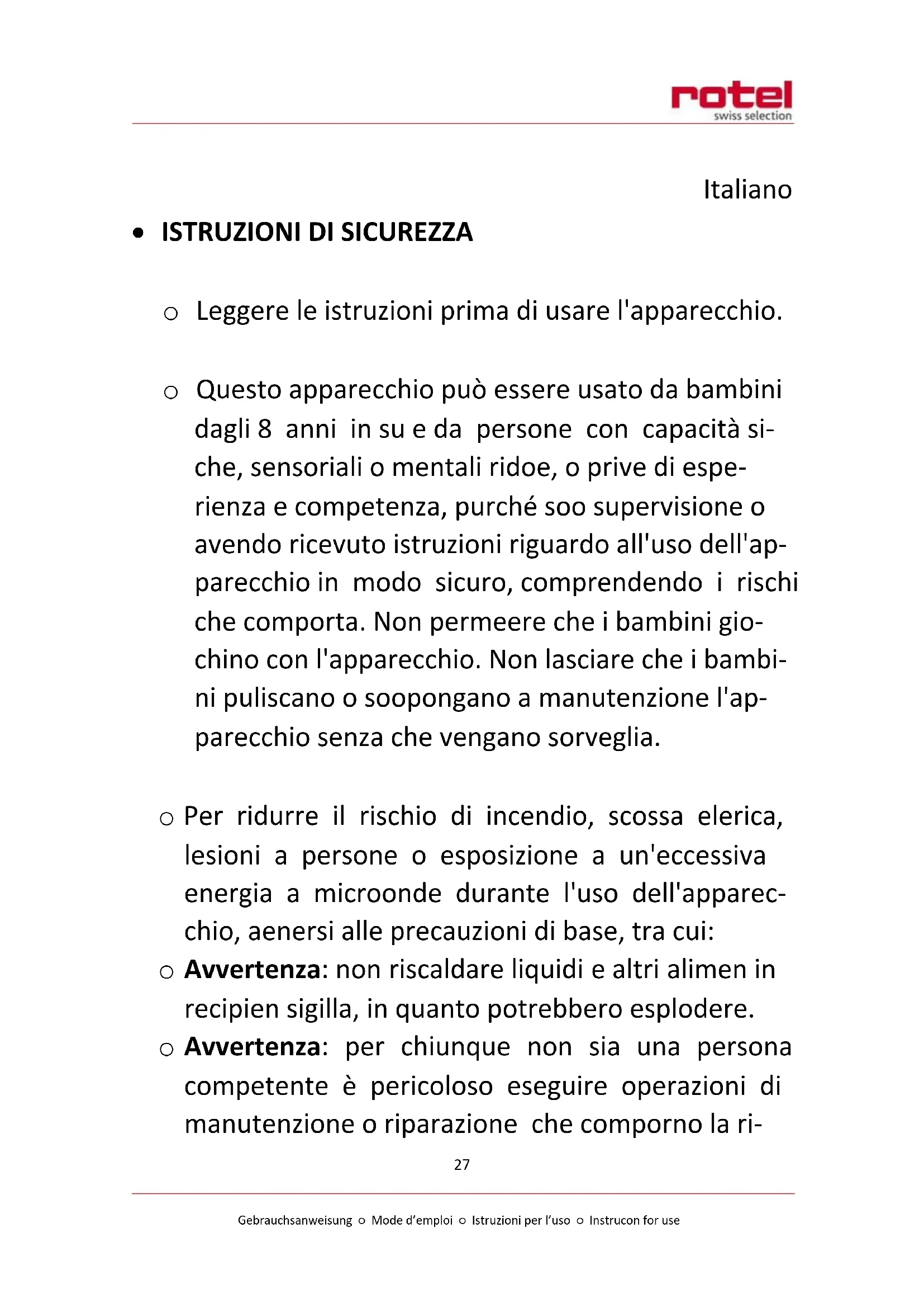 o Leggere le istruzioni prima di usare l'apparecchio. o Questo apparecchio può essere usato da bambini dagli 8 anni in su e da persone con capacità fisi- che, sensoriali o mentali ridotte, o prive di espe- rienza e competenza, purché sotto supervisione o avendo ricevuto istruzioni riguardo all'uso dell'ap- parecchio in modo sicuro, comprendendo i rischi che comporta. Non permettere che i bambini gio- chino con l'apparecchio. Non lasciare che i bambi- ni puliscano o sottopongano a manutenzione l'ap- parecchio senza che vengano sorvegliati. o Per ridurre il rischio di incendio, scossa elettrica, lesioni a persone o esposizione a un'eccessiva energia a microonde durante l'uso dell'apparec- chio, attenersi alle precauzioni di base, tra cui: o Avvertenza: non riscaldare liquidi e altri alimenti in recipienti sigillati, in quanto potrebbero esplodere. o Avvertenza: per chiunque non sia una persona competente è pericoloso eseguire operazioni di manutenzione o riparazione che comportino la ri-Gebrauchsanweisung ○ Mode d’emploi ○ Istruzioni per l’uso ○ Instruction for use