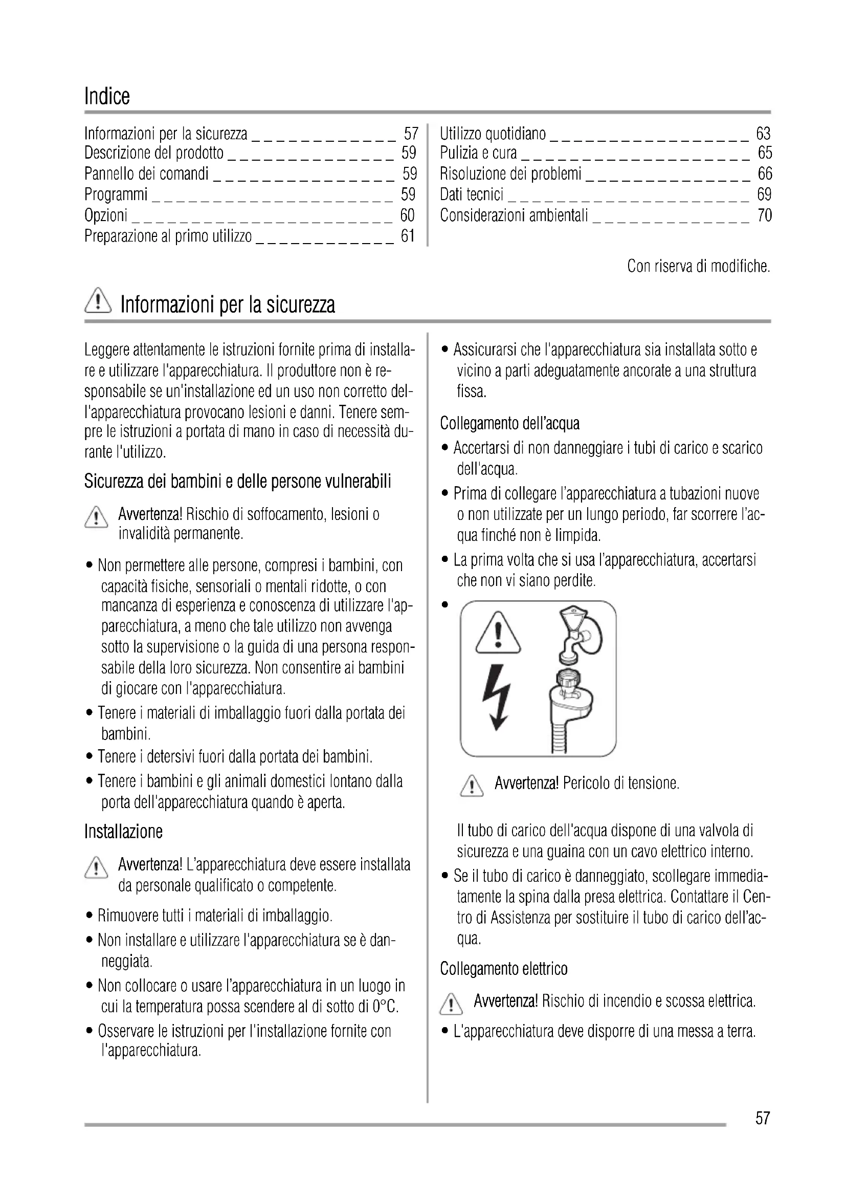 56Indice Informazioni per la sicurezza _ _ _ _ _ _ _ _ _ _ _ _ 57 Descrizione del prodotto _ _ _ _ _ _ _ _ _ _ _ _ _ _ 59 Pannello dei comandi _ _ _ _ _ _ _ _ _ _ _ _ _ _ _ 59 Programmi _ _ _ _ _ _ _ _ _ _ _ _ _ _ _ _ _ _ _ _ 59 Opzioni _ _ _ _ _ _ _ _ _ _ _ _ _ _ _ _ _ _ _ _ _ _ 60 Preparazione al primo utilizzo _ _ _ _ _ _ _ _ _ _ _ _ 61 Utilizzo quotidiano _ _ _ _ _ _ _ _ _ _ _ _ _ _ _ _ _ 63 Pulizia e cura _ _ _ _ _ _ _ _ _ _ _ _ _ _ _ _ _ _ _ 65 Risoluzione dei problemi _ _ _ _ _ _ _ _ _ _ _ _ _ _ 66 Dati tecnici _ _ _ _ _ _ _ _ _ _ _ _ _ _ _ _ _ _ _ _ 69 Considerazioni ambientali _ _ _ _ _ _ _ _ _ _ _ _ _ 70 Con riserva di modifiche. Informazioni per la sicurezza Leggere attentamente le istruzioni fornite prima di installa- re e utilizzare l'apparecchiatura. Il produttore non è re- sponsabile se un'installazione ed un uso non corretto del- l'apparecchiatura provocano lesioni e danni. Tenere sem- pre le istruzioni a portata di mano in caso di necessità du- rante l'utilizzo. Sicurezza dei bambini e delle persone vulnerabili Avvertenza! Rischio di soffocamento, lesioni o invalidità permanente.