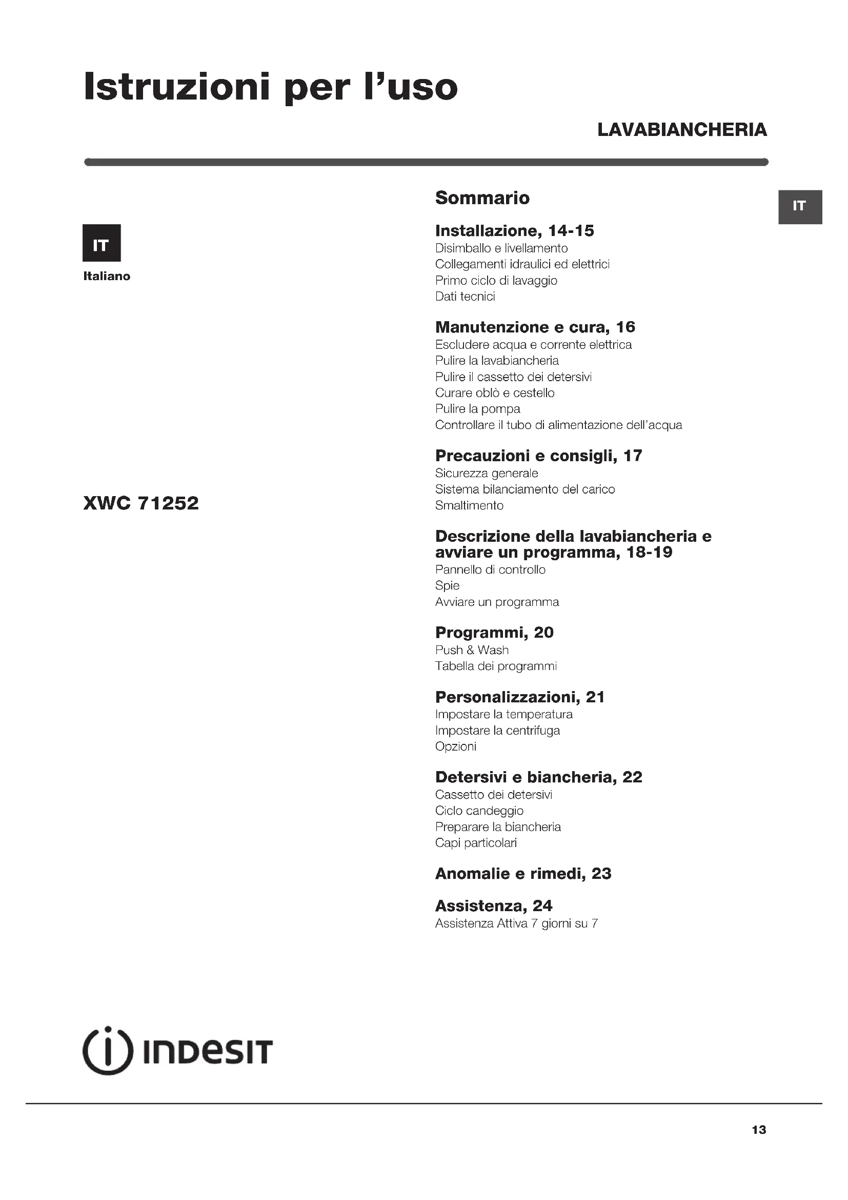 Scarica le istruzioni per il tuo Lavatrice in formato PDF gratuitamente! Trova il tuo manuale XWC 71252 - INDESIT e riprendi in mano il tuo dispositivo elettronico. In questa pagina sono pubblicati tutti i documenti necessari per l'utilizzo del tuo dispositivo. XWC 71252 del marchio INDESIT.