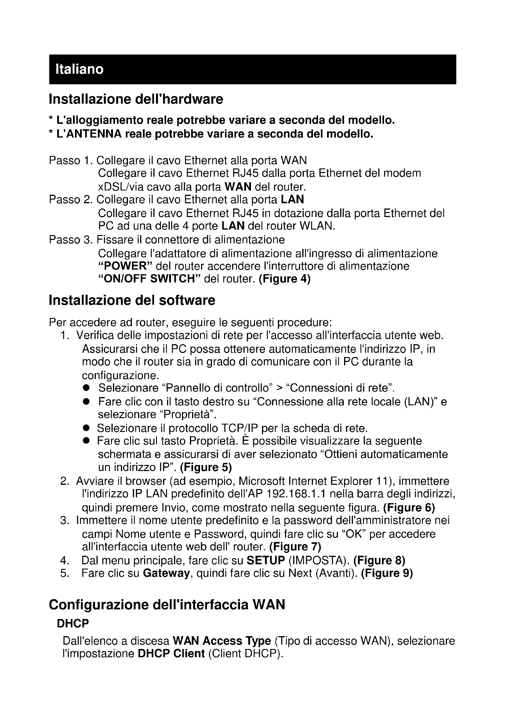 - L'ANTENNA reale potrebbe variare a seconda del modello. Passo 1. Collegare il cavo Ethernet alla porta WAN Collegare il cavo Ethernet RJ45 dalla porta Ethernet del modem xDSL/via cavo alla porta WAN del router. Passo 2. Collegare il cavo Ethernet alla porta LAN Collegare il cavo Ethernet RJ45 in dotazione dalla porta Ethernet del PC ad una delle 4 porte LAN del router WLAN. Passo 3. Fissare il connettore di alimentazione Collegare l'adattatore di alimentazione all'ingresso di alimentazione “POWER” del router accendere l'interruttore di alimentazione “ON/OFF SWITCH” del router. (Figure 4) Installazione del software Per accedere ad router, eseguire le seguenti procedure: