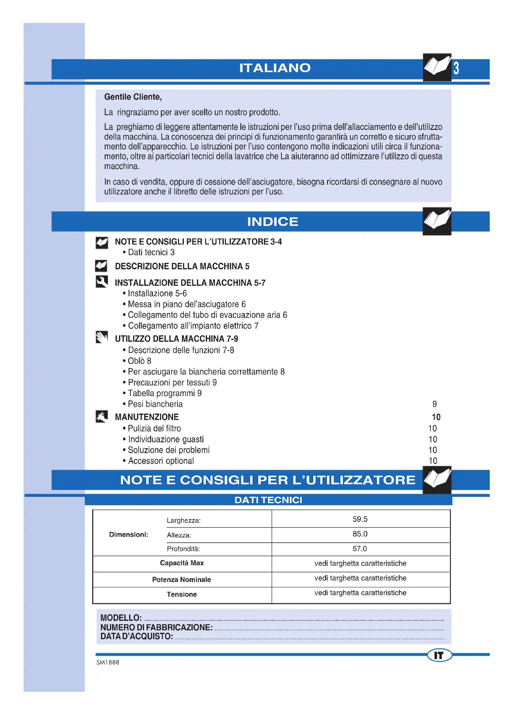 RU3 SM1888 INDICE MODELLO: ..................................................................................................................................................................................................................... NUMERO DI FABBRICAZIONE: .................................................................................................................................................................. DATA D’ACQUISTO: ................................................................................................................................................................................................. ITALIANO Gentile Cliente, La ringraziamo per aver scelto un nostro prodotto. La preghiamo di leggere attentamente le istruzioni per l’uso prima dell’allacciamento e dell’utilizzo della macchina. La conoscenza dei principi di funzionamento garantirà un corretto e sicuro sfrutta- mento dell’apparecchio. Le istruzioni per l’uso contengono molte indicazioni utili circa il funziona- mento, oltre ai particolari tecnici della lavatrice che La aiuteranno ad ottimizzare l’utilizzo di questa macchina. In caso di vendita, oppure di cessione dell’asciugatore, bisogna ricordarsi di consegnare al nuovo utilizzatore anche il libretto delle istruzioni per l’uso.