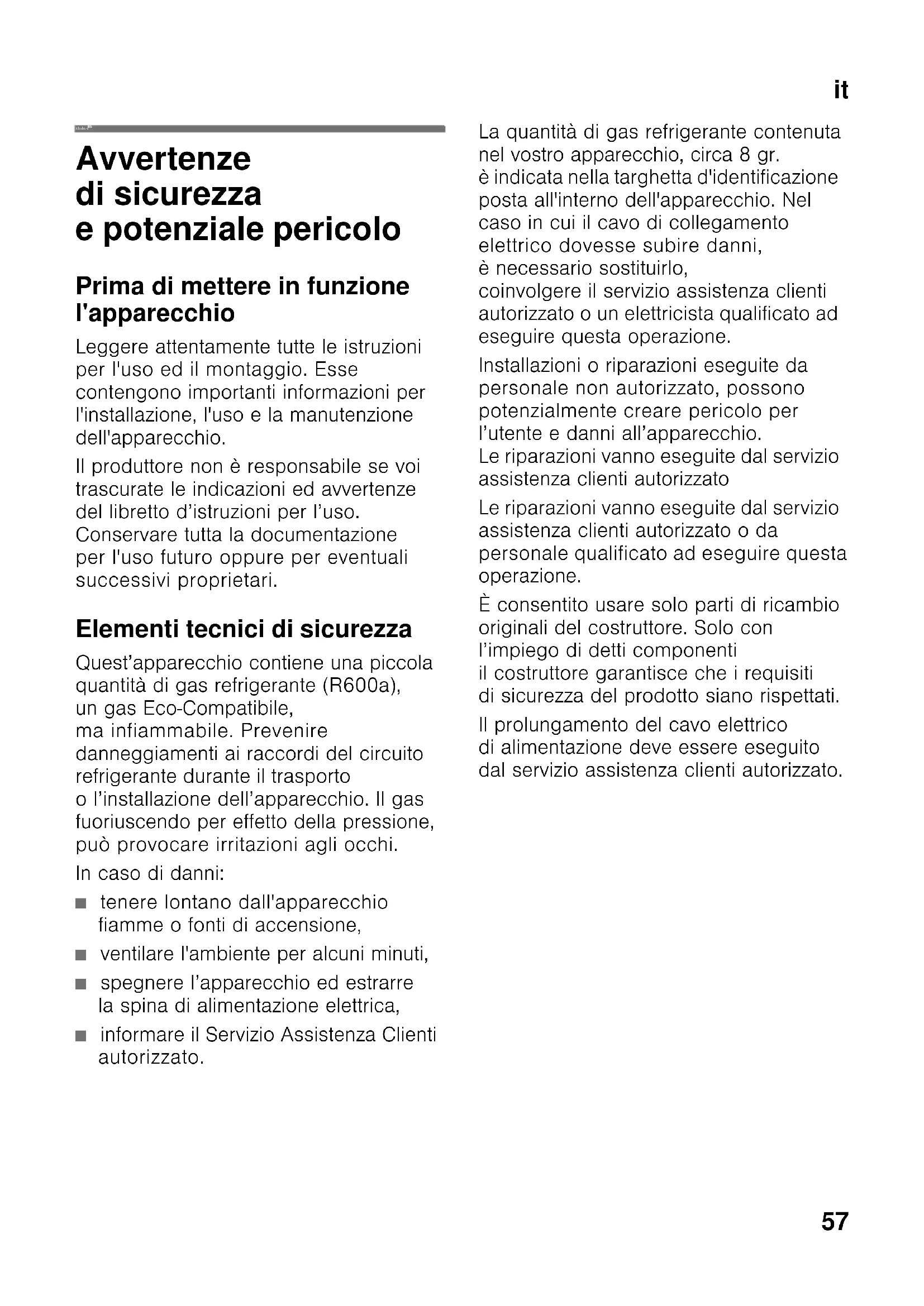 Nell’uso ■ Non usare mai apparecchi elettrici nell’interno di questo apparecchio (per es. apparecchi di riscaldamento, produttori di ghiaccio elettrici ecc.). Pericolo di esplosione! ■ Non sbrinare o pulire mai l’apparecchio con una pulitrice a vapore. Il vapore può raggiungere parti elettriche e provocare un cortocircuito. Pericolo di scarica elettrica! ■ Non utilizzare oggetti appuntiti o affilati per rimuovere gli strati di brina o ghiaccio. Così facendo si possono danneggiare i raccordi del circuito refrigerante. Il gas fuoriuscendo sotto effetto della pressione, può provocare infiammazione agli occhi. ■ Non conservare nell’apparecchio prodotti contenenti propellenti gassosi combustibili (per es. bombolette spray) e sostanze esplosive. Pericolo di esplosione! ■ Non usare impropriamente lo zoccolo, i cassetti estraibili, le porte ecc. come pedana d’appoggio oppure come sostegno. ■ Per lo sbrinamento e la pulizia estrarre la spina d’alimentazione o disinserire l’interruttore di sicurezza. Evitare di esercitare trazioni sul cordone elelttrico, ma impugnare correttamente la spina. ■ Conservare alcool ad alta gradazione solo ermeticamente chiuso ed in posizione verticale. ■ Evitare che olii o grassi imbrattino parti plastiche o le guanizioni delle porte. Altrimenti le parti di materiale plastico e la guarnizione della porta diventano porose. ■ Non ostruire le aperture di passaggio dell’aria di aereazione dell’apparercchio. ■ L’uso di questo apparecchio è consentito a persone (bambini compresi) con ridotte capacità fisiche, sensoriali o psichiche o insufficienti conoscenze solo se sorvegliate da una persona responsabile della loro sicurezza o se da questa adeguatamente istruite nell’uso dell’apparecchio. ■ Non conservare nel congelatore liquidi in bottiglia e lattine (specialmente le bevande contenenti anidride carbonica). Bottiglie e lattine possono rompersi! ■ Non mettere in bocca alimenti congelati appena presi dal congelatore. Pericolo di ustioni! ■ Evitare il contatto prolungato delle mani con alimenti congelati, ghiaccio o i raccordi dell’evaporatore ecc.. Pericolo di ustioni! Bambini in casa ■ Non abbandonare parti dell'imballaggio che possano essere fonte di gioco per i bambini. Pericolo di soffocamento causato da scatole di cartone, fogli di plastica, polistirolo! ■ L'apparecchio non è un giocattolo per bambini! ■ Per apparecchi con serratura della porta: conservare la chiave fuori della portata dei bambini!it