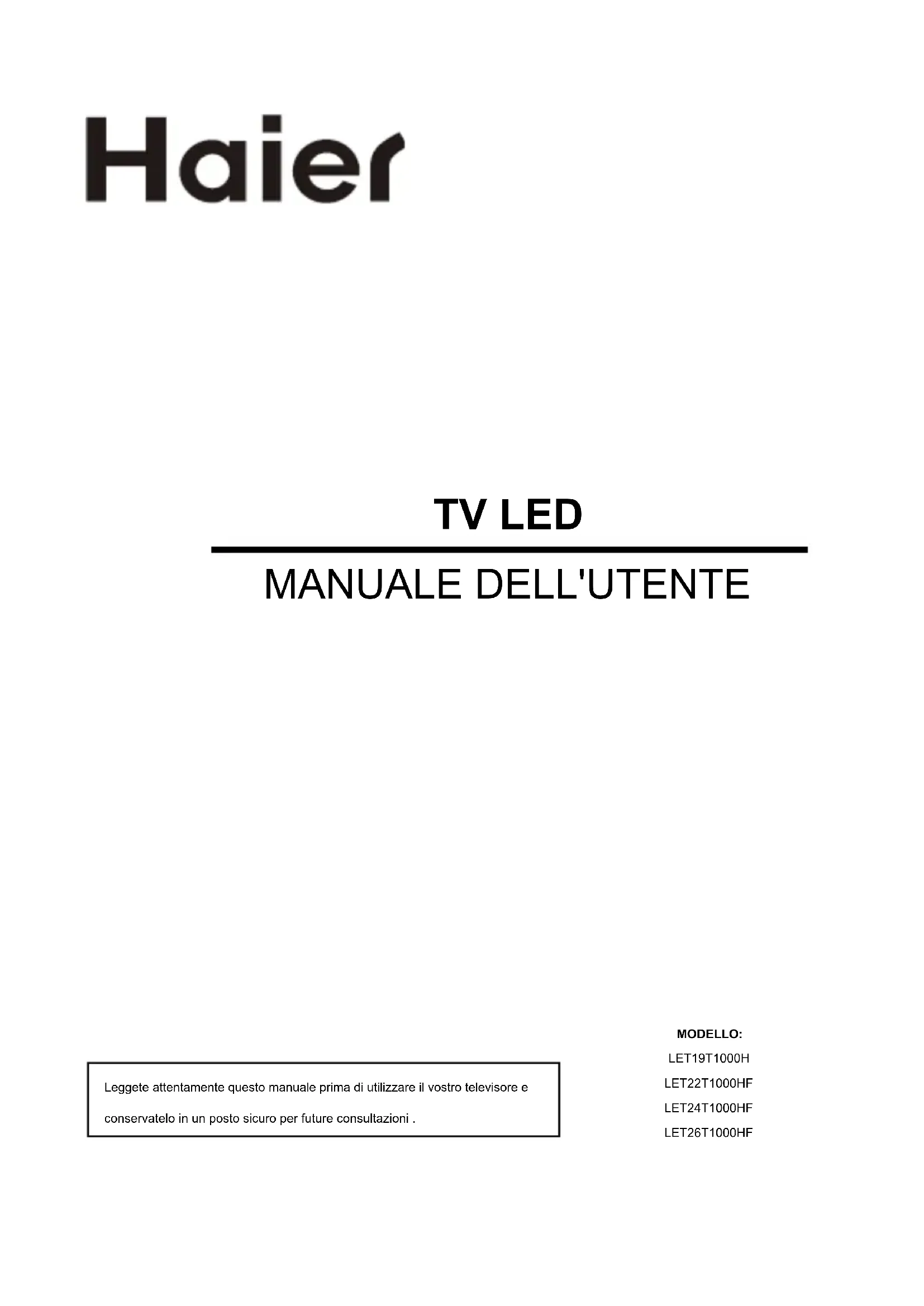 Scarica le istruzioni per il tuo Televisore in formato PDF gratuitamente! Trova il tuo manuale LET19T1000H - HAIER e riprendi in mano il tuo dispositivo elettronico. In questa pagina sono pubblicati tutti i documenti necessari per l'utilizzo del tuo dispositivo. LET19T1000H del marchio HAIER.