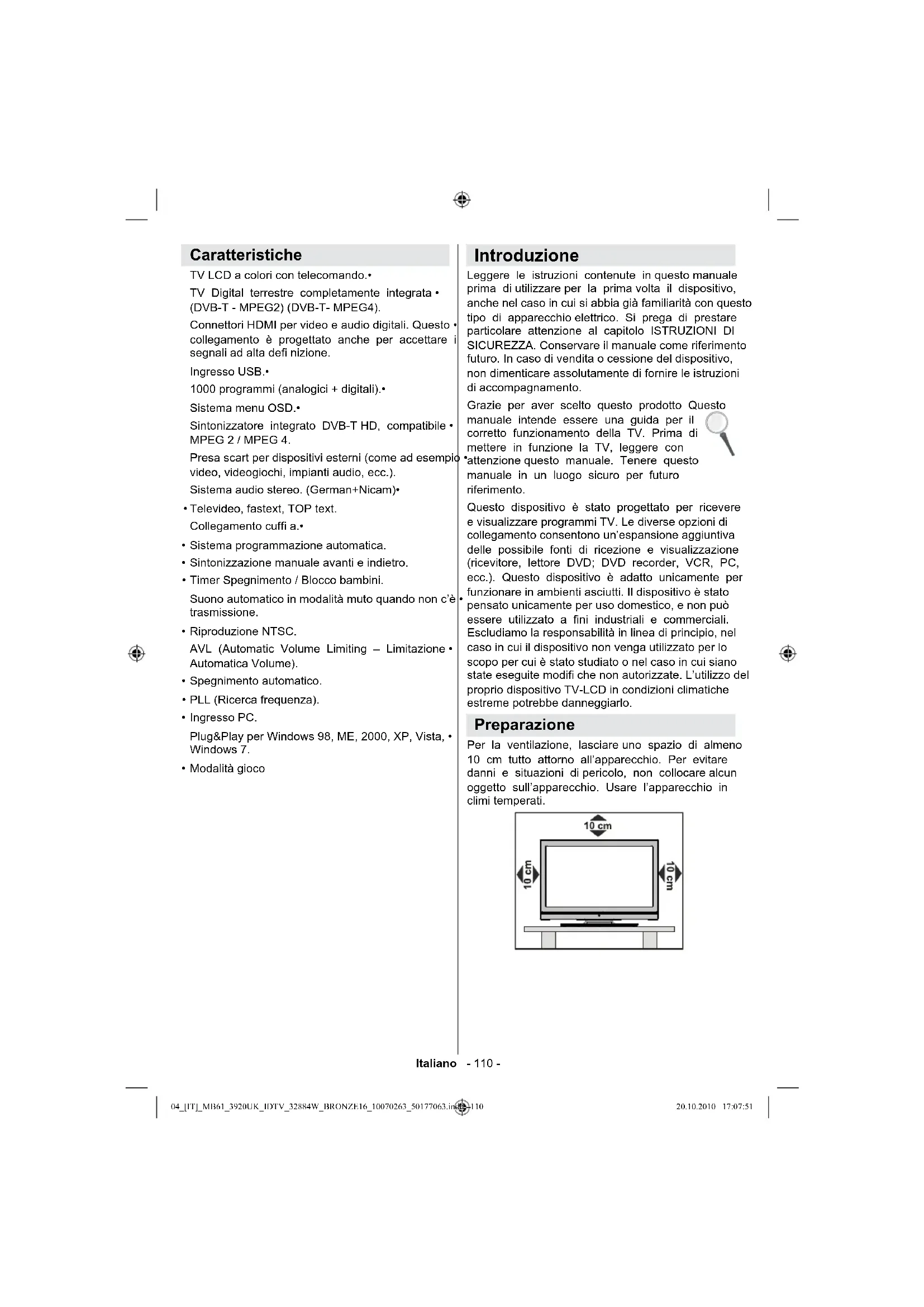 - Nel caso in cui dopo 10 minuti la TV non si sia riavviata, scollegarla dalla presa per 10 minuti, quindi ricollegarla. La TV dovrebbe riavviarsi con il nuovo software. Nel caso in cui ancora la TV non funzioni, eseguire nuovamente la procedura di scollegamento/collegamento per alcune volte. Nel caso in cui comunque la TV non funzioni si prega di contattare il Centro Assistenza per risolvere il problema. Attenzione: Mentre il LED lampeggia in fase di riavvio, non scollegare la TV dalla corrente. Questa operazione potrebbe impedirne ulteriori accensioni comportando così la necessità di intervento dell’Assistenza Tecnica. 04_[IT]_MB61_3920UK_IDTV_32884W_BRONZE16_10070263_50177063.indd 139 20.10.2010 17:08:08Italiano - 140 - Speci che TRASMISSIONE TV PAL/SECAM B/G D/K K’ I/I’ L/L’ CANALI RICEVENTI VHF (BANDA I/III) UHF (BANDA U) HYPERBAND