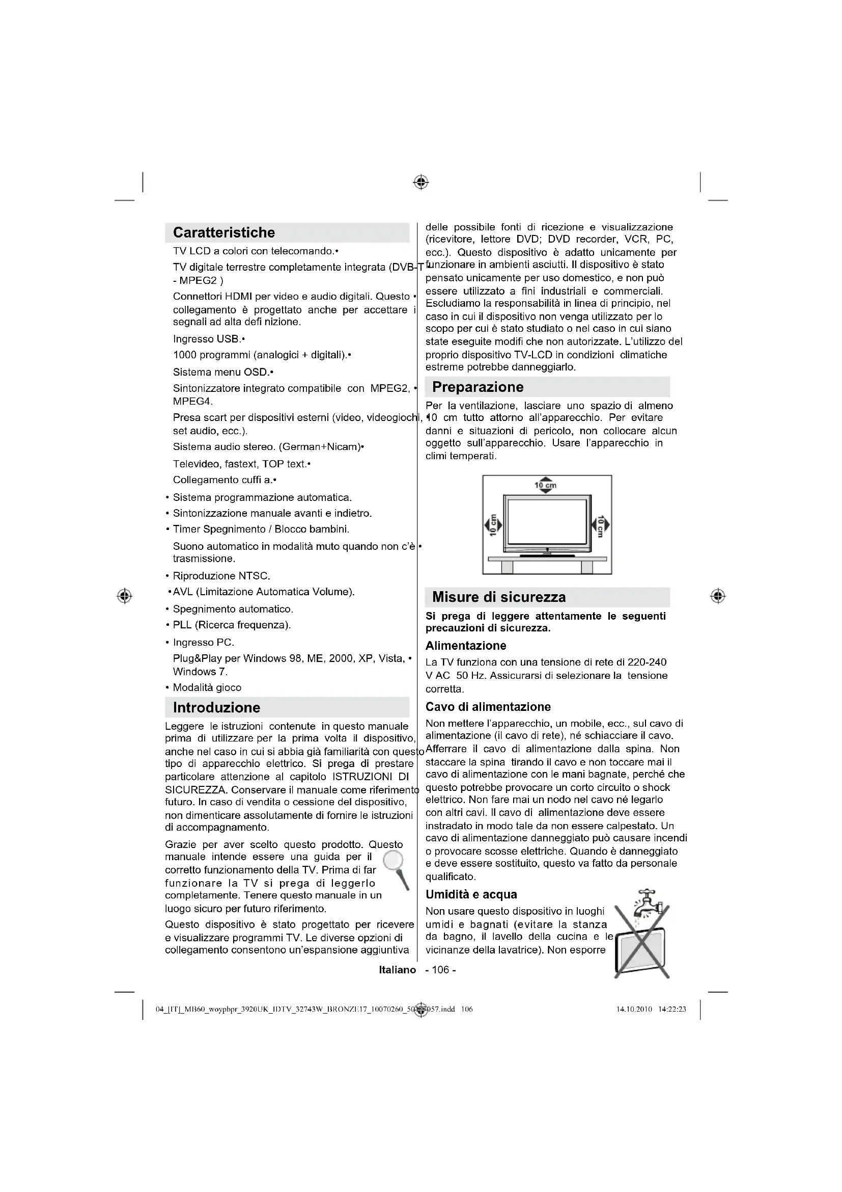 - Speci che 04_[IT]_MB60_woypbpr_3920UK_IDTV_32743W_BRONZE17_10070260_50177057.indd 105 14.10.2010 14:22:22Italiano - 106 - Caratteristiche TV LCD a colori con telecomando.• TV digitale terrestre completamente integrata (DVB-T • - MPEG2 ) Connettori HDMI per video e audio digitali. Questo • collegamento è progettato anche per accettare i segnali ad alta de nizione. Ingresso USB.• 1000 programmi (analogici + digitali).• Sistema menu OSD.• Sintonizzatore integrato compatibile con MPEG2, • MPEG4. Presa scart per dispositivi esterni (video, videogiochi, • set audio, ecc.). Sistema audio stereo. (German+Nicam)• Televideo, fastext, TOP text.• Collegamento cuf a.• Sistema programmazione automatica.• Sintonizzazione manuale avanti e indietro.• Timer Spegnimento / Blocco bambini.• Suono automatico in modalità muto quando non c’è • trasmissione. Riproduzione NTSC. • AVL (Limitazione Automatica Volume).• Spegnimento automatico.• PLL (Ricerca frequenza).• Ingresso PC. • Plug&Play per Windows 98, ME, 2000, XP, Vista, • Windows 7. Modalità gioco • Introduzione Leggere le istruzioni contenute in questo manuale prima di utilizzare per la prima volta il dispositivo, anche nel caso in cui si abbia già familiarità con questo tipo di apparecchio elettrico. Si prega di prestare particolare attenzione al capitolo ISTRUZIONI DI SICUREZZA. Conservare il manuale come riferimento futuro. In caso di vendita o cessione del dispositivo, non dimenticare assolutamente di fornire le istruzioni di accompagnamento. Grazie per aver scelto questo prodotto. Questo manuale intende essere una guida per il corretto funzionamento della TV. Prima di far funzionare la TV si prega di leggerlo completamente. Tenere questo manuale in un luogo sicuro per futuro riferimento. Questo dispositivo è stato progettato per ricevere e visualizzare programmi TV. Le diverse opzioni di collegamento consentono un’espansione aggiuntiva delle possibile fonti di ricezione e visualizzazione (ricevitore, lettore DVD; DVD recorder, VCR, PC, ecc.). Questo dispositivo è adatto unicamente per funzionare in ambienti asciutti. Il dispositivo è stato pensato unicamente per uso domestico, e non può essere utilizzato a fini industriali e commerciali. Escludiamo la responsabilità in linea di principio, nel caso in cui il dispositivo non venga utilizzato per lo scopo per cui è stato studiato o nel caso in cui siano state eseguite modi che non autorizzate. L’utilizzo del proprio dispositivo TV-LCD in condizioni climatiche estreme potrebbe danneggiarlo. Preparazione Per la ventilazione, lasciare uno spazio di almeno 10 cm tutto attorno all’apparecchio. Per evitare danni e situazioni di pericolo, non collocare alcun oggetto sull’apparecchio. Usare l’apparecchio in climi temperati. Misure di sicurezza Si prega di leggere attentamente le seguenti precauzioni di sicurezza. Alimentazione La TV funziona con una tensione di rete di 220-240 V AC 50 Hz. Assicurarsi di selezionare la tensione corretta. Cavo di alimentazione Non mettere l’apparecchio, un mobile, ecc., sul cavo di alimentazione (il cavo di rete), né schiacciare il cavo. Afferrare il cavo di alimentazione dalla spina. Non staccare la spina tirando il cavo e non toccare mai il cavo di alimentazione con le mani bagnate, perché che questo potrebbe provocare un corto circuito o shock elettrico. Non fare mai un nodo nel cavo né legarlo con altri cavi. Il cavo di alimentazione deve essere instradato in modo tale da non essere calpestato. Un cavo di alimentazione danneggiato può causare incendi o provocare scosse elettriche. Quando è danneggiato e deve essere sostituito, questo va fatto da personale quali cato. Umidità e acqua Non usare questo dispositivo in luoghi umidi e bagnati (evitare la stanza da bagno, il lavello della cucina e le vicinanze della lavatrice). Non esporre 04_[IT]_MB60_woypbpr_3920UK_IDTV_32743W_BRONZE17_10070260_50177057.indd 106 14.10.2010 14:22:23Italiano - 107 - questo dispositivo alla pioggia o all’acqua, perché ciò può essere pericoloso, e non posare oggetti pieni di liquido, come vasi di ori, su di esso. Tenere lontano da gocciolii e spruzzi. Se un qualunque oggetto solido o liquido cade all’interno, scollegare la TV e farla controllare da personale qualificato prima di farla funzionare ulteriormente. Pulizia Prima di pulire, staccare la TV dalla presa a parete. Non usare detergenti liquidi o spray. Usare un panno morbido e asciutto. Ventilazione Le fessure e le aperture sulla TV sono destinate alla ventilazione e ad assicurare un funzionamento af dabile. Per evitare il surriscaldamento, queste aperture non devono essere bloccate o coperte in alcun modo. Calore e amme L’apparecchio non deve essere messo accanto a amme libere o fonti di calore intenso, come una stufa elettrica. Assicurarsi che nessuna fonte di amma viva, come candele accese, sia posta sulla TV. Le batterie non devono essere esposte a calore eccessivo, come luce solare, fuoco o simili. Fulmini In caso di temporali e fulmini o quando si va in vacanza, scollegare il cavo di alimentazione dalla presa di corrente a parete. Pezzi di ricambio Quando sono richiesti dei pezzi di ricambio, assicurarsi che il tecnico del servizio abbia usato i pezzi di ricambio che sono speci cati dal produttore o abbiano le stesse caratteristiche dell’originale. Le sostituzioni non autorizzate possono causare incendi, scosse elettriche o altri rischi. Assistenza Per l’assistenza, si prega di rivolgersi al personale specializzato. Non togliere da soli il coperchio per evitare di esporsi a scosse elettriche. Smaltimento ri uti Istruzioni per lo smaltimento dei ri uti:• La confezione e i materiali di imballaggio sono riciclabili e dovrebbero essere riciclati per primi. I materiali di imballaggio, come la pellicola di rivestimento, devono essere tenuti fuori dalla portata dei bambini. Le batterie, comprese quelle senza metalli pesanti, non devono essere smaltite co