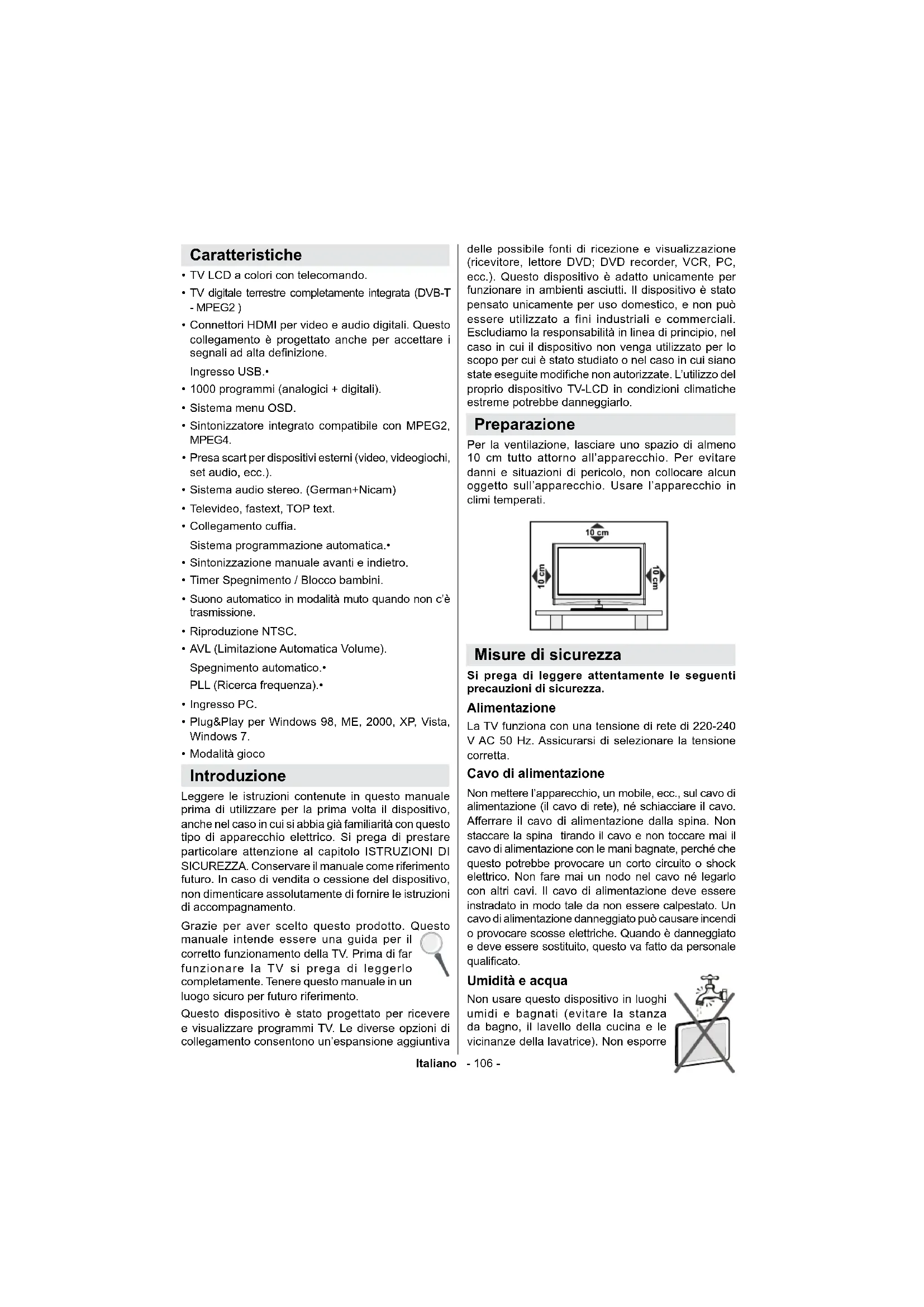 - Speci che Italiano - 106 - Caratteristiche TV LCD a colori con telecomando.• TV digitale terrestre completamente integrata (DVB-T • - MPEG2 ) Connettori HDMI per video e audio digitali. Questo • collegamento è progettato anche per accettare i segnali ad alta de nizione. Ingresso USB.• 1000 programmi (analogici + digitali).• Sistema menu OSD.• Sintonizzatore integrato compatibile con MPEG2, • MPEG4. Presa scart per dispositivi esterni (video, videogiochi, • set audio, ecc.). Sistema audio stereo. (German+Nicam)• Televideo, fastext, TOP text.• Collegamento cuf a.• Sistema programmazione automatica.• Sintonizzazione manuale avanti e indietro.• Timer Spegnimento / Blocco bambini.• Suono automatico in modalità muto quando non c’è • trasmissione. Riproduzione NTSC. • AVL (Limitazione Automatica Volume).• Spegnimento automatico.• PLL (Ricerca frequenza).• Ingresso PC. • Plug&Play per Windows 98, ME, 2000, XP, Vista, • Windows 7. Modalità gioco • Introduzione Leggere le istruzioni contenute in questo manuale prima di utilizzare per la prima volta il dispositivo, anche nel caso in cui si abbia già familiarità con questo tipo di apparecchio elettrico. Si prega di prestare particolare attenzione al capitolo ISTRUZIONI DI SICUREZZA. Conservare il manuale come riferimento futuro. In caso di vendita o cessione del dispositivo, non dimenticare assolutamente di fornire le istruzioni di accompagnamento. Grazie per aver scelto questo prodotto. Questo manuale intende essere una guida per il corretto funzionamento della TV. Prima di far funzionare la TV si prega di leggerlo completamente. Tenere questo manuale in un luogo sicuro per futuro riferimento. Questo dispositivo è stato progettato per ricevere e visualizzare programmi TV. Le diverse opzioni di collegamento consentono un’espansione aggiuntiva delle possibile fonti di ricezione e visualizzazione (ricevitore, lettore DVD; DVD recorder, VCR, PC, ecc.). Questo dispositivo è adatto unicamente per funzionare in ambienti asciutti. Il dispositivo è stato pensato unicamente per uso domestico, e non può essere utilizzato a fini industriali e commerciali. Escludiamo la responsabilità in linea di principio, nel caso in cui il dispositivo non venga utilizzato per lo scopo per cui è stato studiato o nel caso in cui siano state eseguite modi che non autorizzate. L’utilizzo del proprio dispositivo TV-LCD in condizioni climatiche estreme potrebbe danneggiarlo. Preparazione Per la ventilazione, lasciare uno spazio di almeno 10 cm tutto attorno all’apparecchio. Per evitare danni e situazioni di pericolo, non collocare alcun oggetto sull’apparecchio. Usare l’apparecchio in climi temperati. Misure di sicurezza Si prega di leggere attentamente le seguenti precauzioni di sicurezza. Alimentazione La TV funziona con una tensione di rete di 220-240 V AC 50 Hz. Assicurarsi di selezionare la tensione corretta. Cavo di alimentazione Non mettere l’apparecchio, un mobile, ecc., sul cavo di alimentazione (il cavo di rete), né schiacciare il cavo. Afferrare il cavo di alimentazione dalla spina. Non staccare la spina tirando il cavo e non toccare mai il cavo di alimentazione con le mani bagnate, perché che questo potrebbe provocare un corto circuito o shock elettrico. Non fare mai un nodo nel cavo né legarlo con altri cavi. Il cavo di alimentazione deve essere instradato in modo tale da non essere calpestato. Un cavo di alimentazione danneggiato può causare incendi o provocare scosse elettriche. Quando è danneggiato e deve essere sostituito, questo va fatto da personale quali cato. Umidità e acqua Non usare questo dispositivo in luoghi umidi e bagnati (evitare la stanza da bagno, il lavello della cucina e le vicinanze della lavatrice). Non esporreItaliano - 107 - questo dispositivo alla pioggia o all’acqua, perché ciò può essere pericoloso, e non posare oggetti pieni di liquido, come vasi di ori, su di esso. Tenere lontano da gocciolii e spruzzi. Se un qualunque oggetto solido o liquido cade all’interno, scollegare la TV e farla controllare da personale qualificato prima di farla funzionare ulteriormente. Pulizia Prima di pulire, staccare la TV dalla presa a parete. Non usare detergenti liquidi o spray. Usare un panno morbido e asciutto. Ventilazione Le fessure e le aperture sulla TV sono destinate alla ventilazione e ad assicurare un funzionamento af dabile. Per evitare il surriscaldamento, queste aperture non devono essere bloccate o coperte in alcun modo. Calore e amme L’apparecchio non deve essere messo accanto a amme libere o fonti di calore intenso, come una stufa elettrica. Assicurarsi che nessuna fonte di amma viva, come candele accese, sia posta sulla TV. Le batterie non devono essere esposte a calore eccessivo, come luce solare, fuoco o simili. Fulmini In caso di temporali e fulmini o quando si va in vacanza, scollegare il cavo di alimentazione dalla presa di corrente a parete. Pezzi di ricambio Quando sono richiesti dei pezzi di ricambio, assicurarsi che il tecnico del servizio abbia usato i pezzi di ricambio che sono speci cati dal produttore o abbiano le stesse caratteristiche dell’originale. Le sostituzioni non autorizzate possono causare incendi, scosse elettriche o altri rischi. Assistenza Per l’assistenza, si prega di rivolgersi al personale specializzato. Non togliere da soli il coperchio per evitare di esporsi a scosse elettriche. Smaltimento ri uti Istruzioni per lo smaltimento dei ri uti:• La confezione e i materiali di imballaggio sono riciclabili e dovrebbero essere riciclati per primi. I materiali di imballaggio, come la pellicola di rivestimento, devono essere tenuti fuori dalla portata dei bambini. Le batterie, comprese quelle senza metalli pesanti, non devono essere smaltite con i ri uti domestici. Smaltire le batterie usate in modo rispettoso dell’ambiente. Informarsi sulle normative in vigore nella propria zona. p. 134